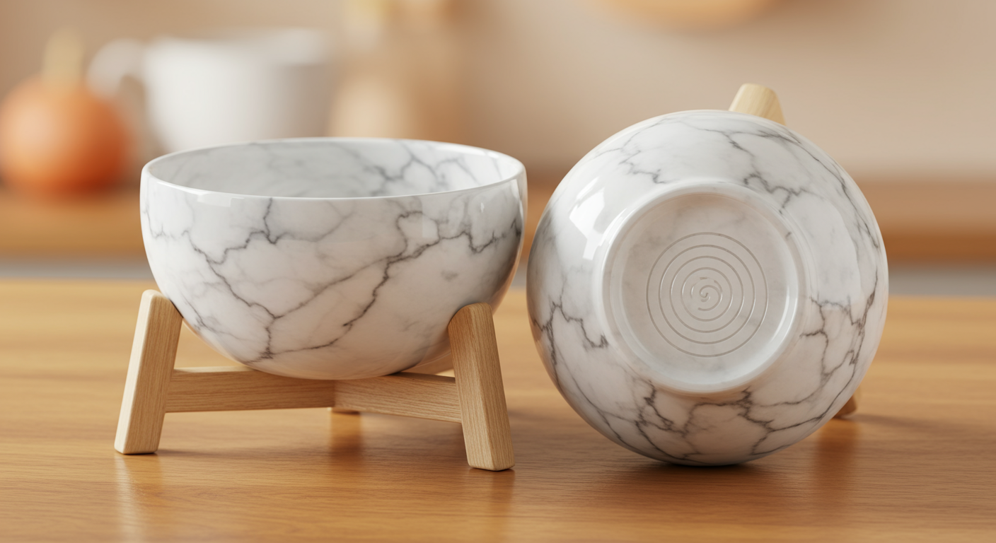 Ceramic pet food bowls on wooden stand, in marble grey, $62 etsy.com/shop/ Guff yGuff Shop