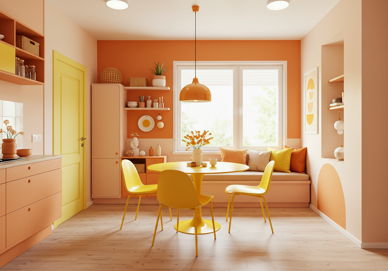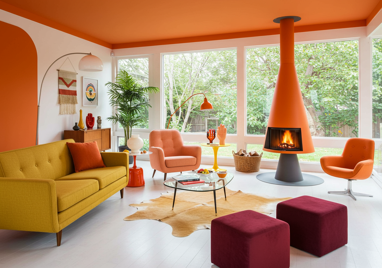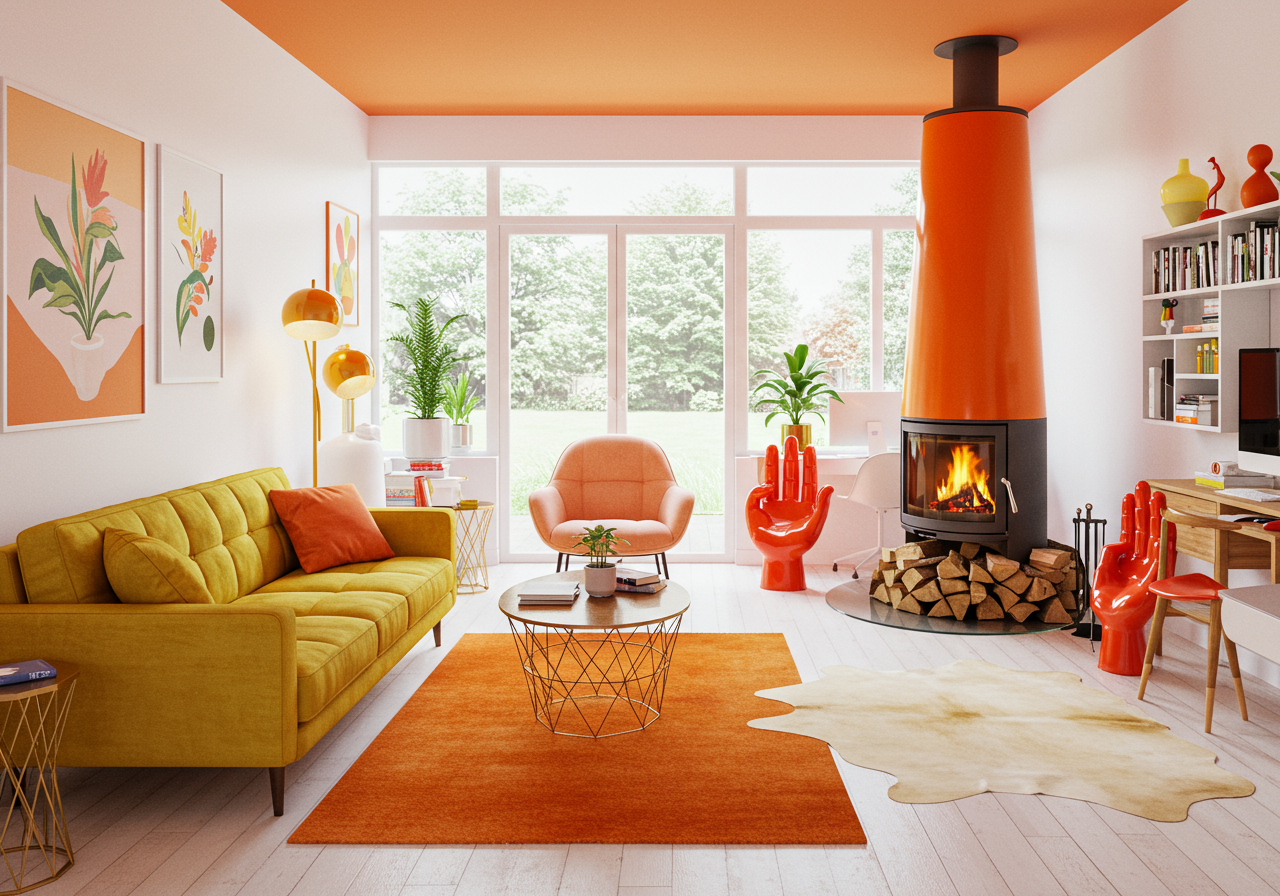 The room itself was void of architectural details, so to add depth and dimension, the owners used painting techniques that make a strong visual impact. Chosen to match the vintage fireplace, the vermillion paint (Fiery Opal 077 by Benjamin Moore) was extended from the ceiling down 10 inches onto the walls, enveloping the room in warmth.