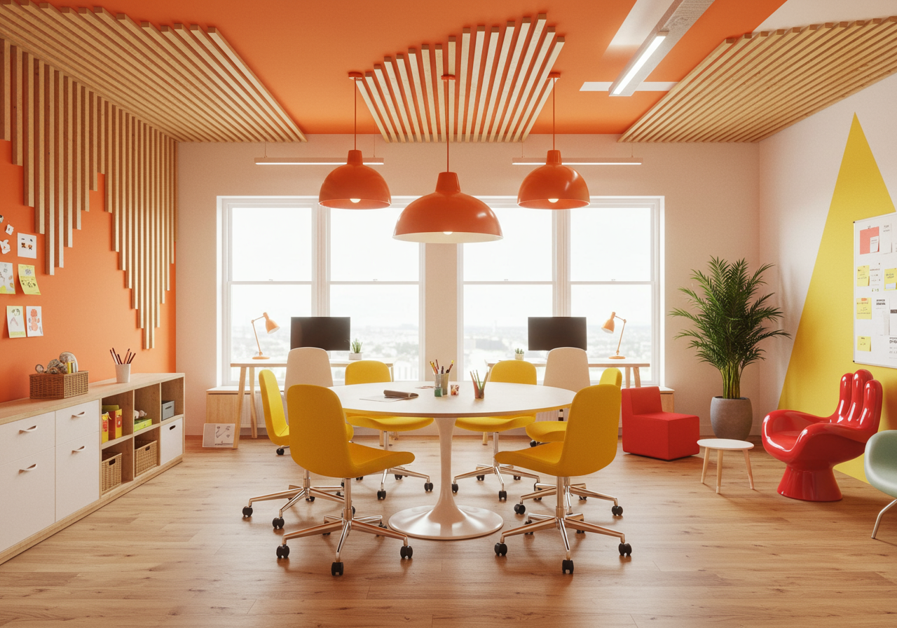 The buzzing of overhead fluorescent lights was the first thing to go. They were replaced with affordable four-inch dimmable LED flush-mount recessed lights in a warm white. Two Scandinavian-style Hektar pendants from IKEA hover above the conference table, and an arched floor lamp in the lounge area provides a soft glow in the evenings.