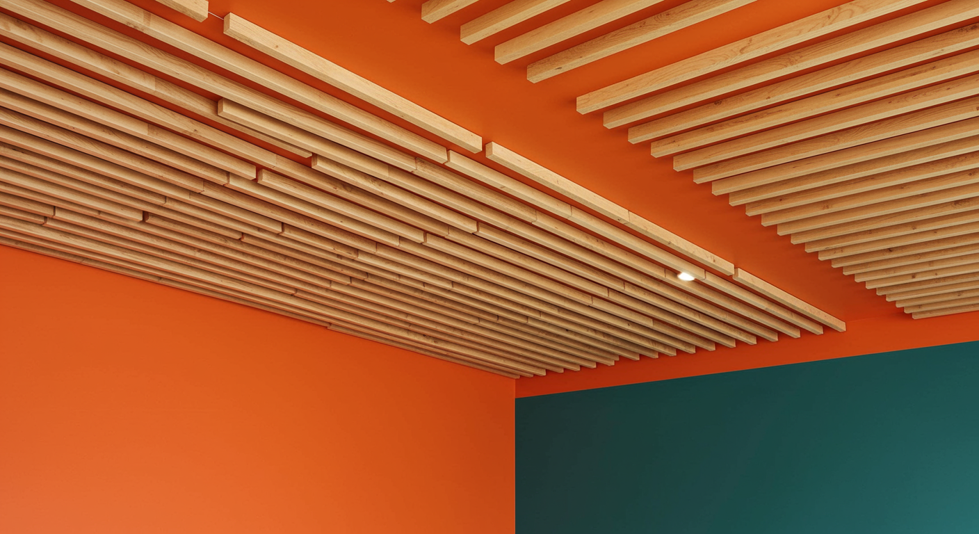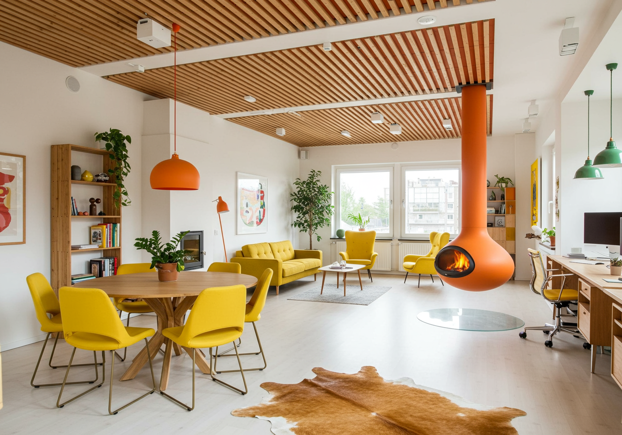 To make the best use of the open space, various zones needed to be established visually. A wooden slat wall crawls up the wall and onto the ceiling and hovers above the thrifted round conference table, surrounded by vintage yellow rolling chairs. The two tall desks on the southern wall give both husband and wife their own work spaces, and cleverly form an additional vertical plane, visually layering them one step up from the conference table.