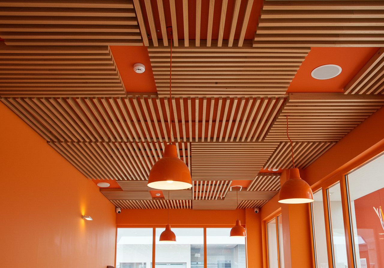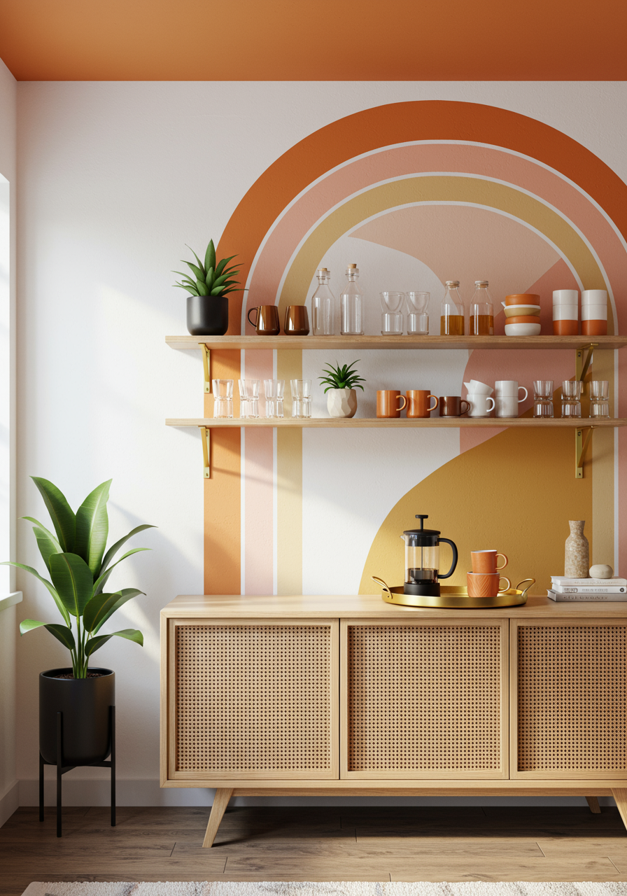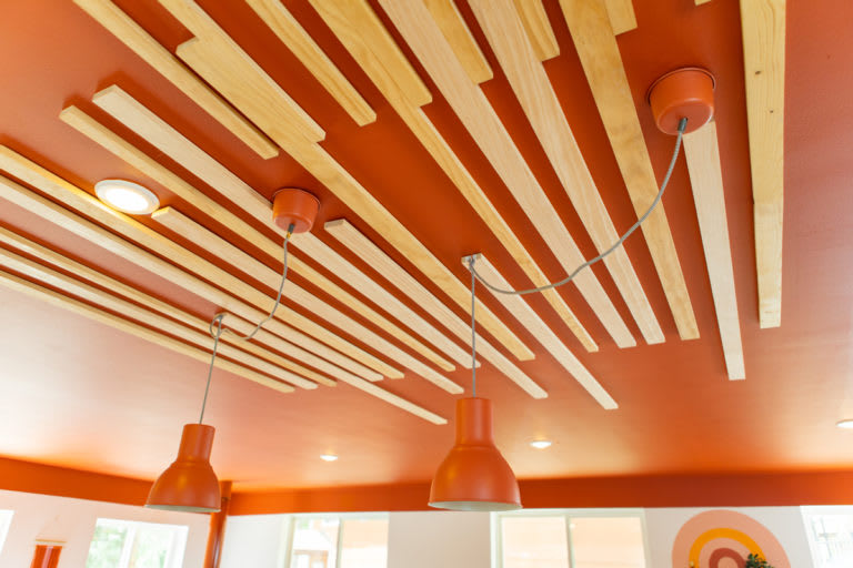 To keep to a very tight budget, nearly all of the pieces in the room were thrifted or DIY’ed. The entry bench formerly lived in a local movie theater and was given new life thanks to rose gold spray paint on the base and a newly stained top. For the tall desks, they used two matching vintage dressers for one side of each desk, adding hairpin legs from HairpinLegs.com, and a ¾-inch thick plywood top, stained pink and sealed with a high-gloss polyurethane. When the owner couldn’t find a record console she liked, she used a cube cubby from Target, adding a wooden base and angled legs, both stained pink. The slat wall is perhaps the most impactful element of the entire room, and was achieved using a mix of 1” x 4” and 1” x 2” pine boards. The lackluster door was given a coat of mustard paint (Glowing Umber 182 by Benjamin Moore), and a set of mounted antlers that the owner actually salvaged from a dumpster were painted in the same color, with an arch painted behind to mimic the arch of the coffee bar.