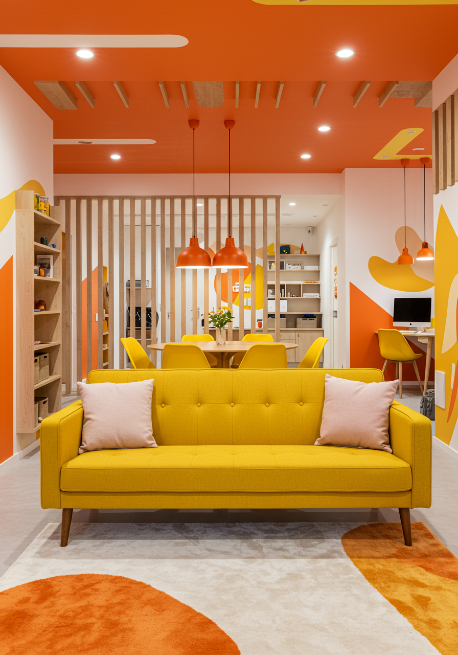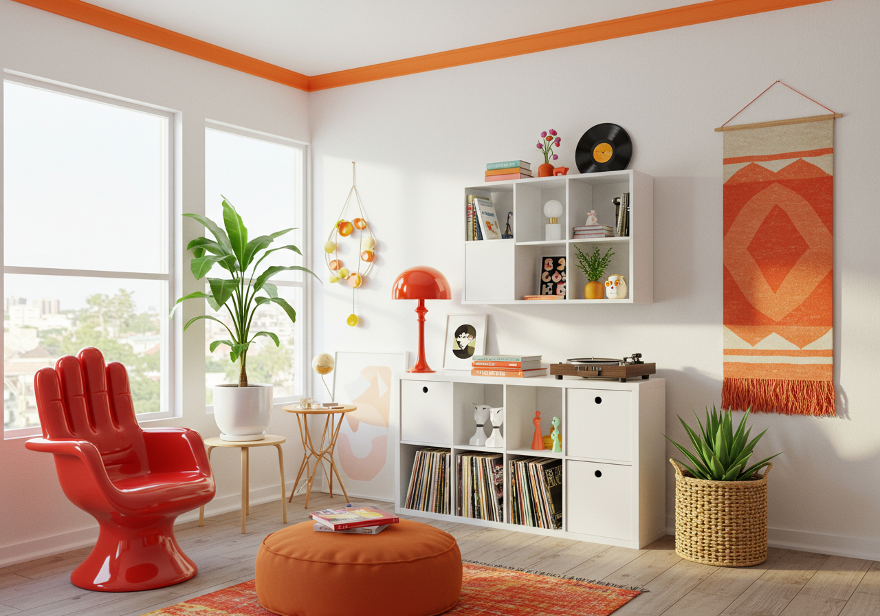 Layered rugs from Safavieh help to delineate the lounge zone. The Brittany convertible sofa in mustard yellow by Novogratz provides the perfect spot for afternoon power naps. A vintage 1970s red hand chair calls attention to the vinyl corner, with the tall faux palm tree drawing the eye upwards.