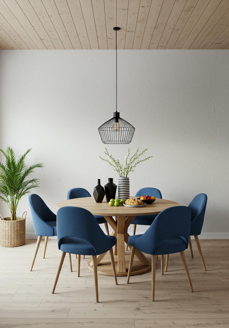 “A home should feel personal, not simply filled with items from a catalog. Don’t try to match everything perfectly—instead play with different materials and finishes. It will enhance the level of interest,” says Vydianathan. To this point, a round wooden table and blue linen chairs by Moe’s Home Collection encourage conversation in the dining room. The light fixture by Direct Furniture casts beautiful shadows onto the walls when illuminated in the evening.