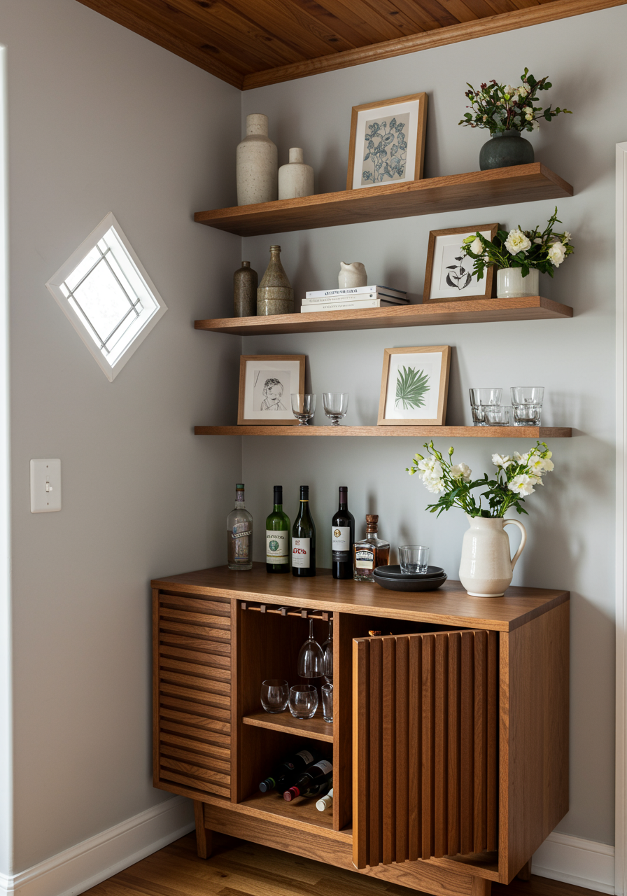 The side cabinet by Zuo Modern brings texture to the space, and acts as a discreet bar station. Open shelving offers a space to display the some of the owner’s ceramics, including a handmade jug from Italy.
