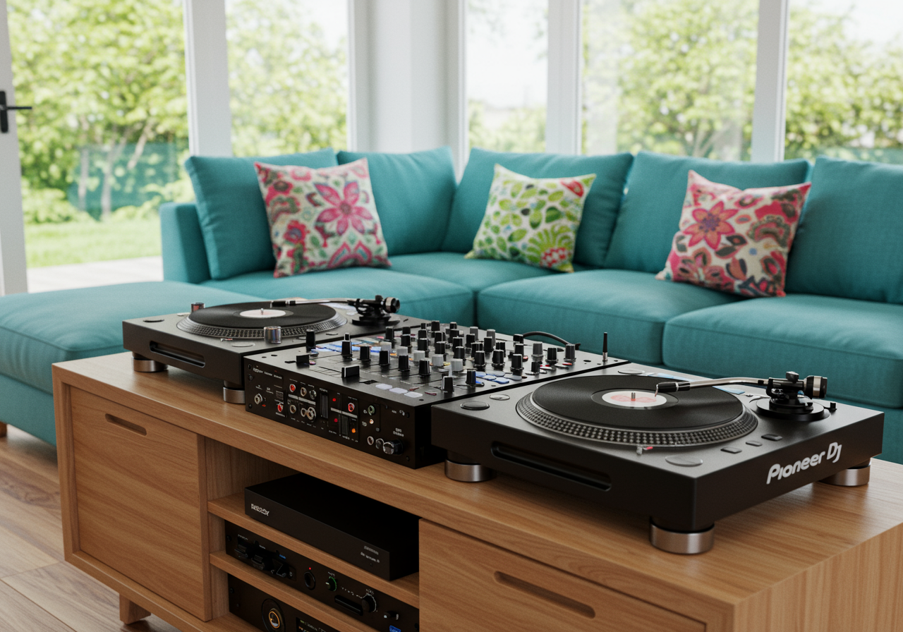 Taking into account the hobbies and activities of the client, Vydianathan chose furnishings that support their lifestyle. DJing is one of the client’s passions, so having a dedicated space for his turntables and vinyl collection was a must. Vydianathan utilized a small console, placed directly behind the couch, to create a DJ booth that was integrated but didn’t interfere with the circulation of the guests. Above the DJ area hangs a custom piece of artwork by Atlanta artist Tanner Wilson. The piece not only incorporates the colors from the room, but represents the owners—the two birds coming from different cultural backgrounds, joining together to create a bountiful home.
