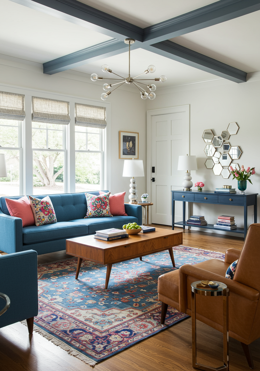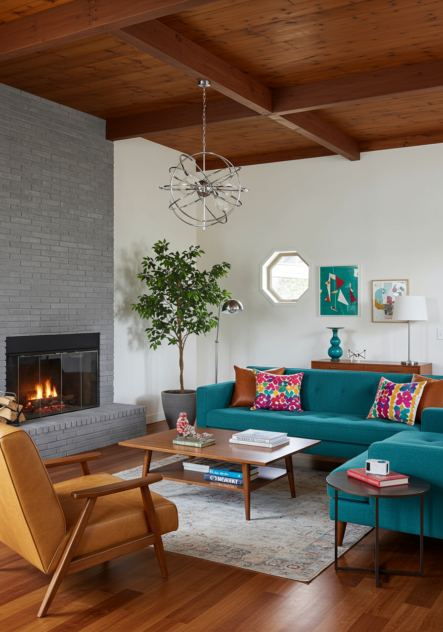 This inspired approach is precisely what an Atlanta, GA, couple was seeking when they approached Vydianathan to design their 1950s home in the Brookhaven neighborhood. The young, vibrant couple who loves to entertain wanted a space where they could host friends, play music, and share in warm conversations around the fireplace. They wanted a design that would complement the mid-century lines of the home, while incorporating pillows and ceramics from their many travels around the world.