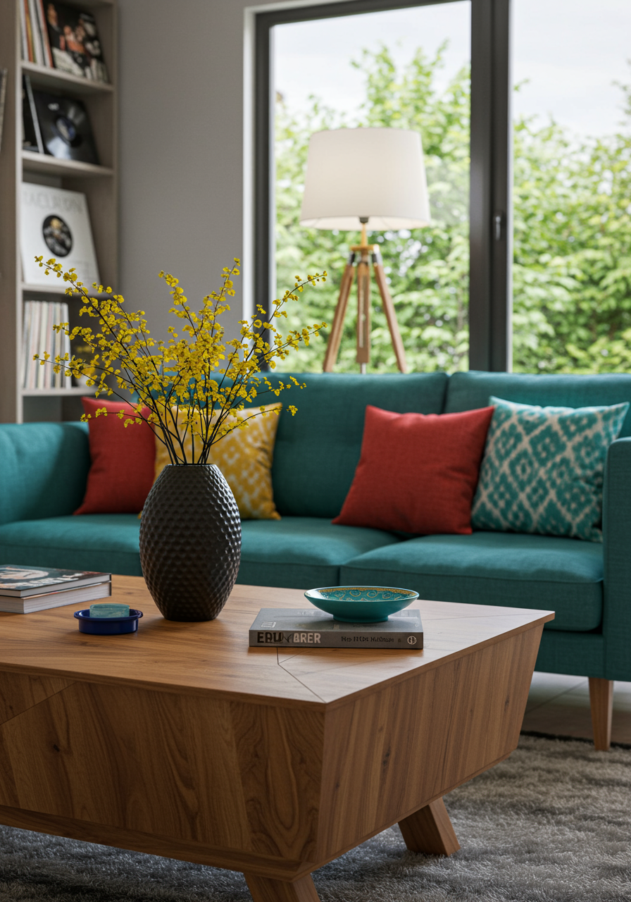 The Jasper sectional by Room & Board offers a fun pop of teal, while offering a neutral base for the vibrantly colored pillows. The leather and wood accent chair from Article sits next to a twisted wood side table. “Don’t be afraid to mix woods, metals, and textures, as long as they are the right scale and proportion,” advises Vydianathan.