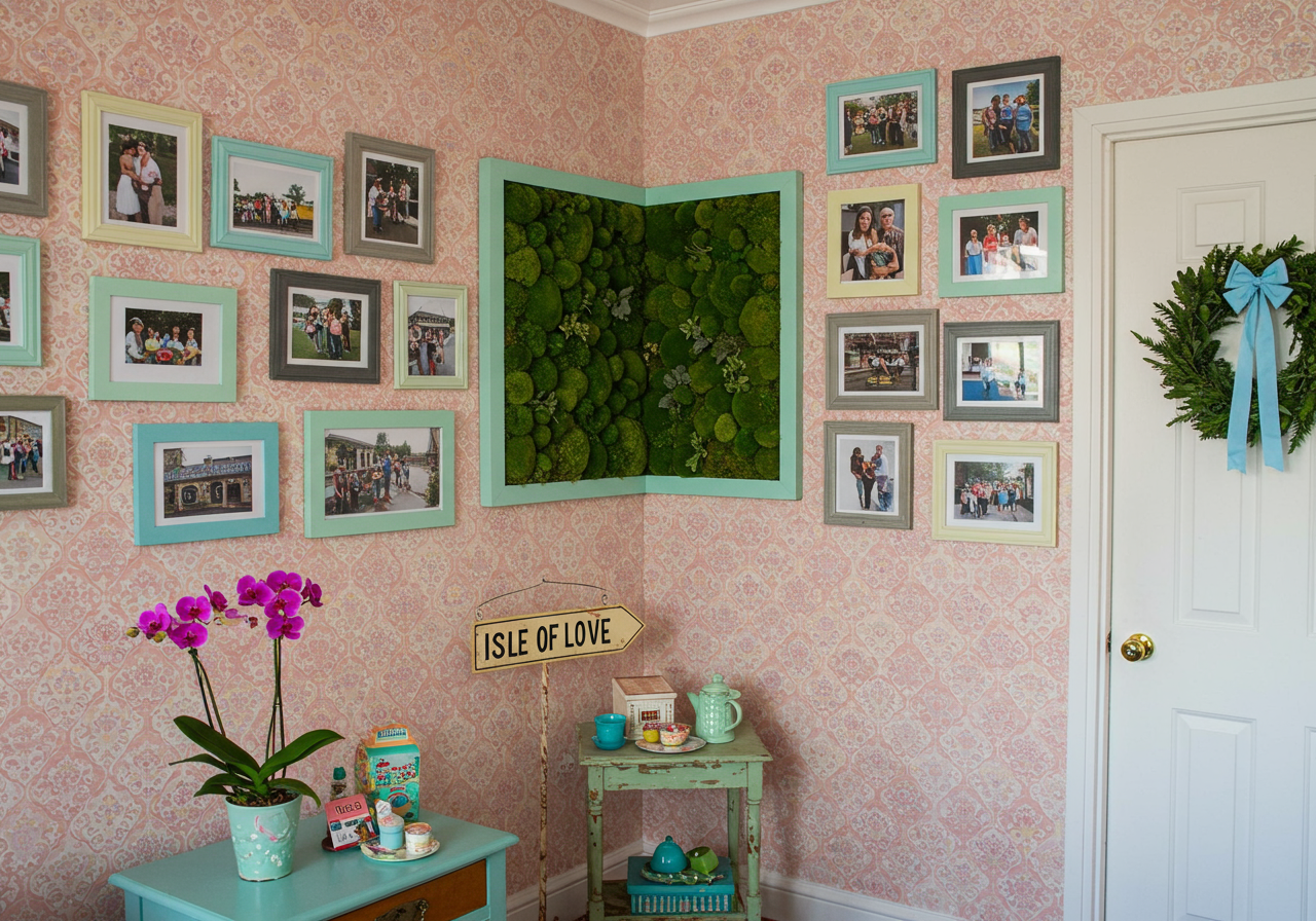 Opposite the window, a perfect selfie station was created. Two lush living moss artworks were produced by Mona King of Living Aura Design. Above and below, the two framed sections of the wine glass wallpaper act as a guest book, with visitors encouraged to sign their names or leave fun messages. Williams even created hashtag gardening signs for visitors to use to nail the perfect Instagram photo.