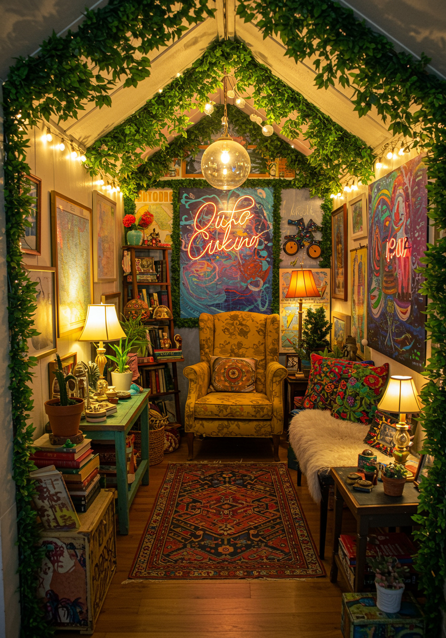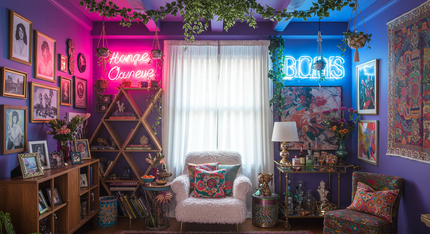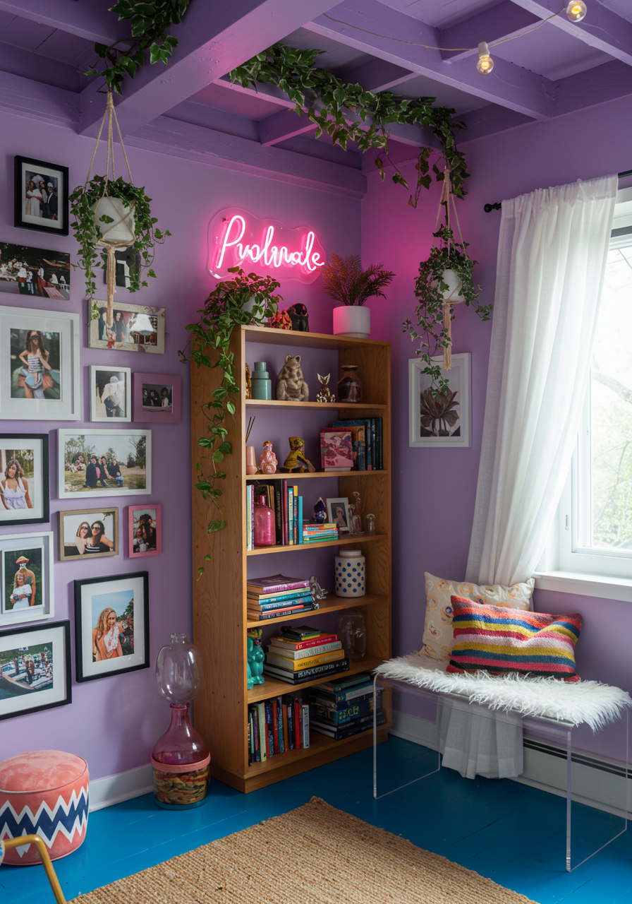 For this showhome, since there wasn’t an actual client, she looked to her office administrator as a muse. Creating a space that was completely her own would be a dream come true for this mother of two active boys. Williams decided to create the ultimate She Shed in honor of busy women everywhere. As always, she began with a color palette. A saturated purple hue, Indigo Batik by Sherwin Williams, covers the floors, back wall, and rafters. “We used the placement of the purple to really draw the eye into the space and upwards,” shares Williams. She kept the three other walls white, CasaBlanca by Sherwin Williams, allowing the colorful artwork to pop. (The teen idol and TV icon photos are a hilarious touch.) Early on in the planning process she found the floral fabric used on the valance, which helped to dictate the rest of the palette. Vibrant punchy hues swirl around the room, each vantage point revealing something new and fun.