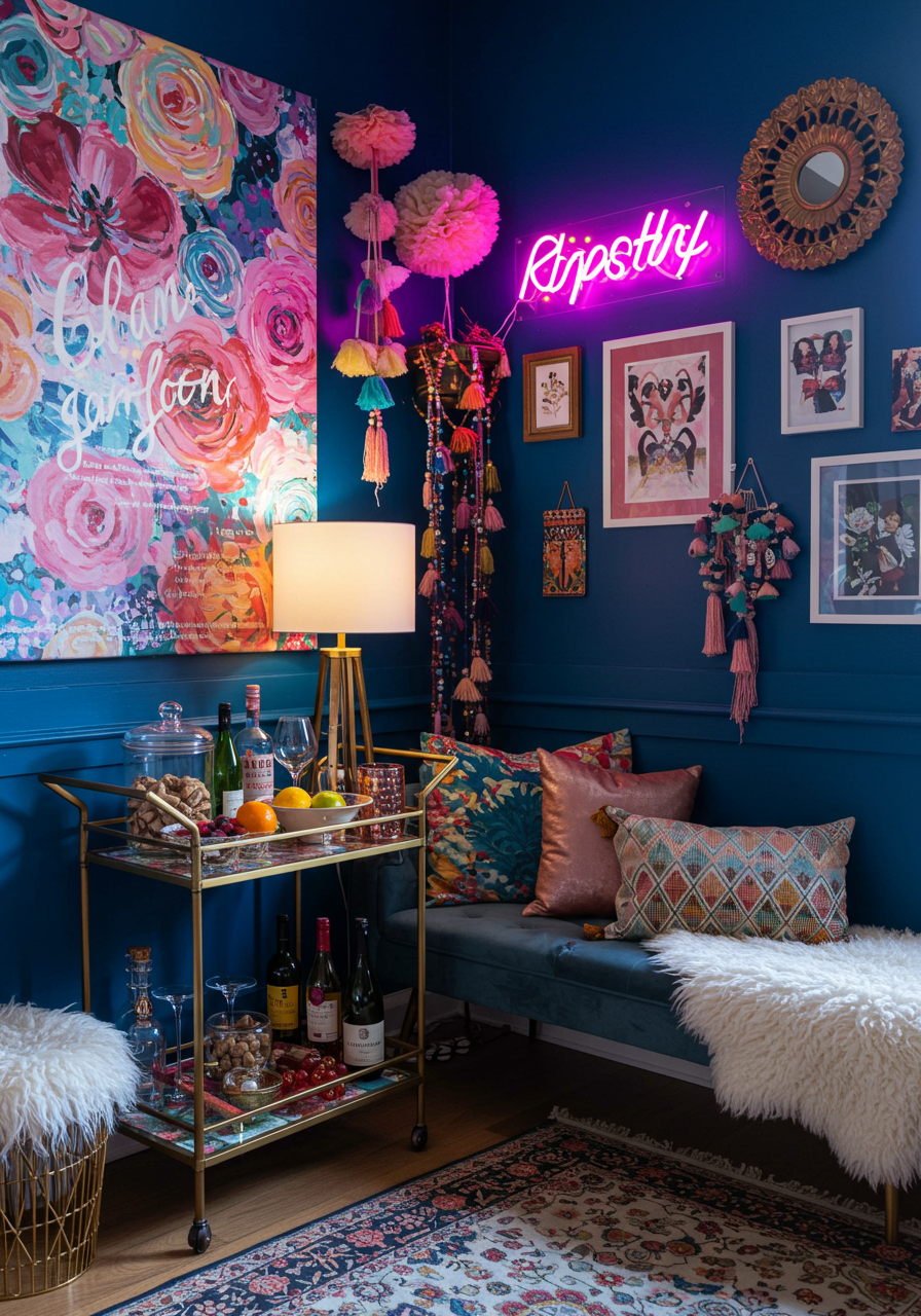 The “why limit Happy to an hour” painting was a custom piece from Atlanta-based artist Angela Marie. Two glowing pink neon signs, surprisingly found on Amazon, flank the window. Below is a luxe lucite and fur bench by Wildwood Lamps that pairs with the angled bookshelf, complete with a resting space for a wine glass. Williams designed the piece along with Jeremy Kamiya of Kamiya Furniture. “Keeping the back of the bookshelf open was important. While the piece is large, we didn’t want it to weigh down the room, visually.” That same principle carried through to the bar cart, side table, and chair. “Being able to see through to the flooring keeps everything feeling light and airy.” The crushed velvet wing chair by Tomlinson Companies in a rich goldenrod hue is fit for a queen. Behind, the origami bird lamp by Chelsea House casts a warm glow and even bobs with a light tap, politely encouraging you to enjoy another glass of wine, while the hand-carved wooden Kalimantan bird by Clubcu keeps you company.