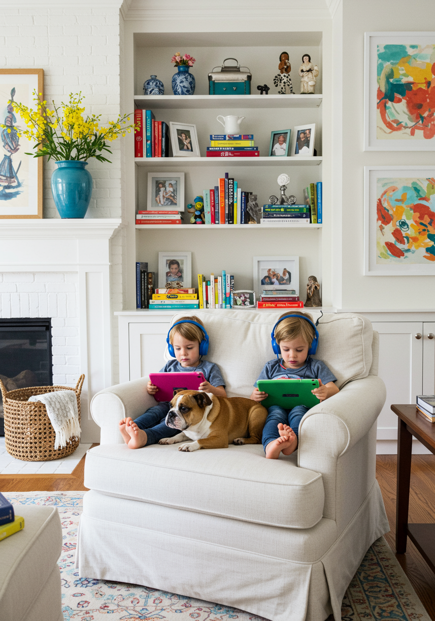Looks like these color-coordinated bookshelves by the amazing Eliza Morrill are both kiddo and doggo approved!
