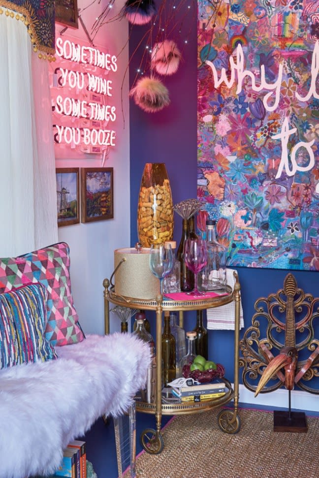 The “why limit Happy to an hour” painting was a custom piece from Atlanta-based artist Angela Marie. Two glowing pink neon signs, surprisingly found on Amazon, flank the window. Below is a luxe lucite and fur bench by Wildwood Lamps that pairs with the angled bookshelf, complete with a resting space for a wine glass. Williams designed the piece along with Jeremy Kamiya of Kamiya Furniture. “Keeping the back of the bookshelf open was important. While the piece is large, we didn’t want it to weigh down the room, visually.” That same principle carried through to the bar cart, side table, and chair. “Being able to see through to the flooring keeps everything feeling light and airy.” The crushed velvet wing chair by Tomlinson Companies in a rich goldenrod hue is fit for a queen. Behind, the origami bird lamp by Chelsea House casts a warm glow and even bobs with a light tap, politely encouraging you to enjoy another glass of wine, while the hand-carved wooden Kalimantan bird by Clubcu keeps you company.