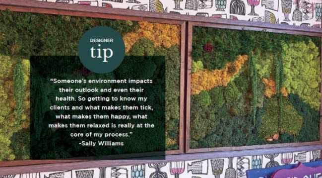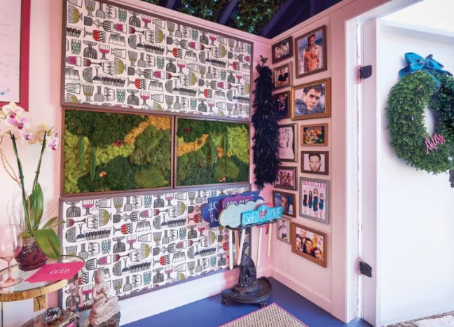 Opposite the window, a perfect selfie station was created. Two lush living moss artworks were produced by Mona King of Living Aura Design. Above and below, the two framed sections of the wine glass wallpaper act as a guest book, with visitors encouraged to sign their names or leave fun messages. Williams even created hashtag gardening signs for visitors to use to nail the perfect Instagram photo.