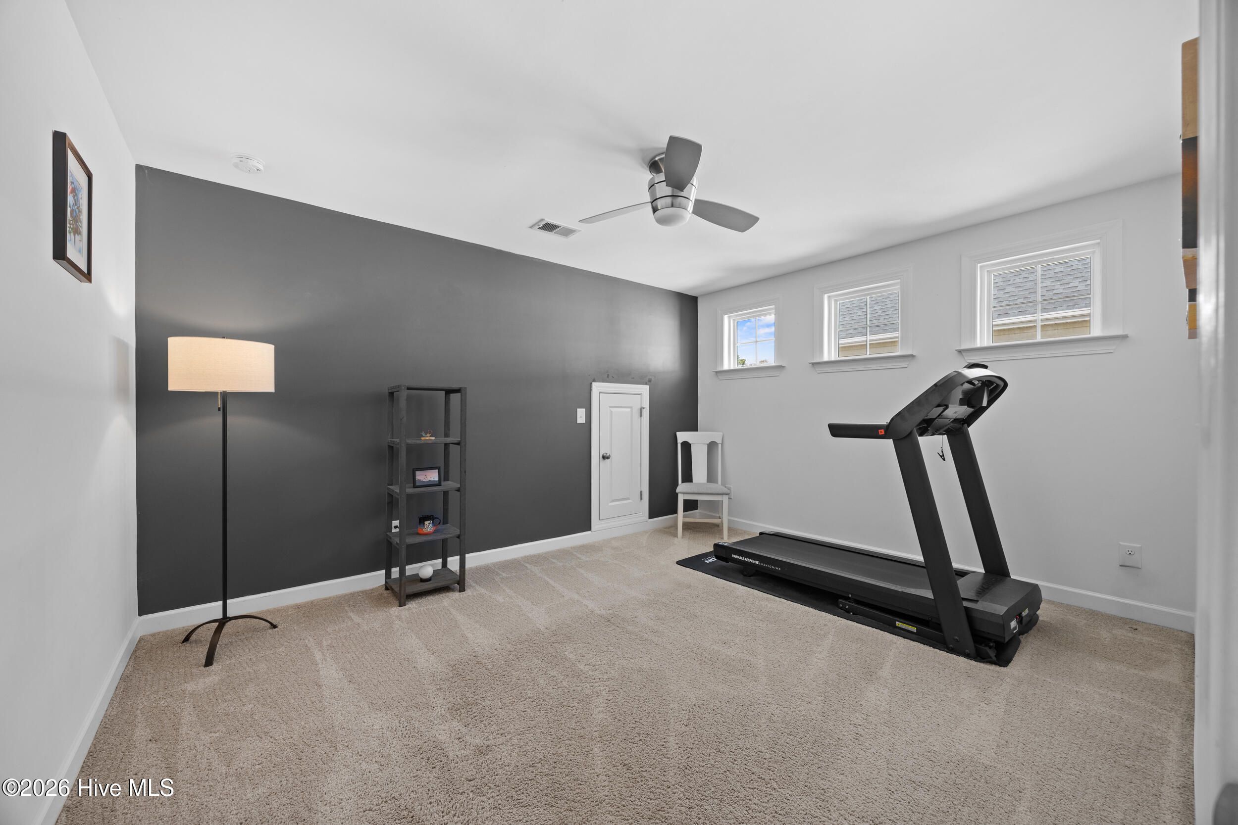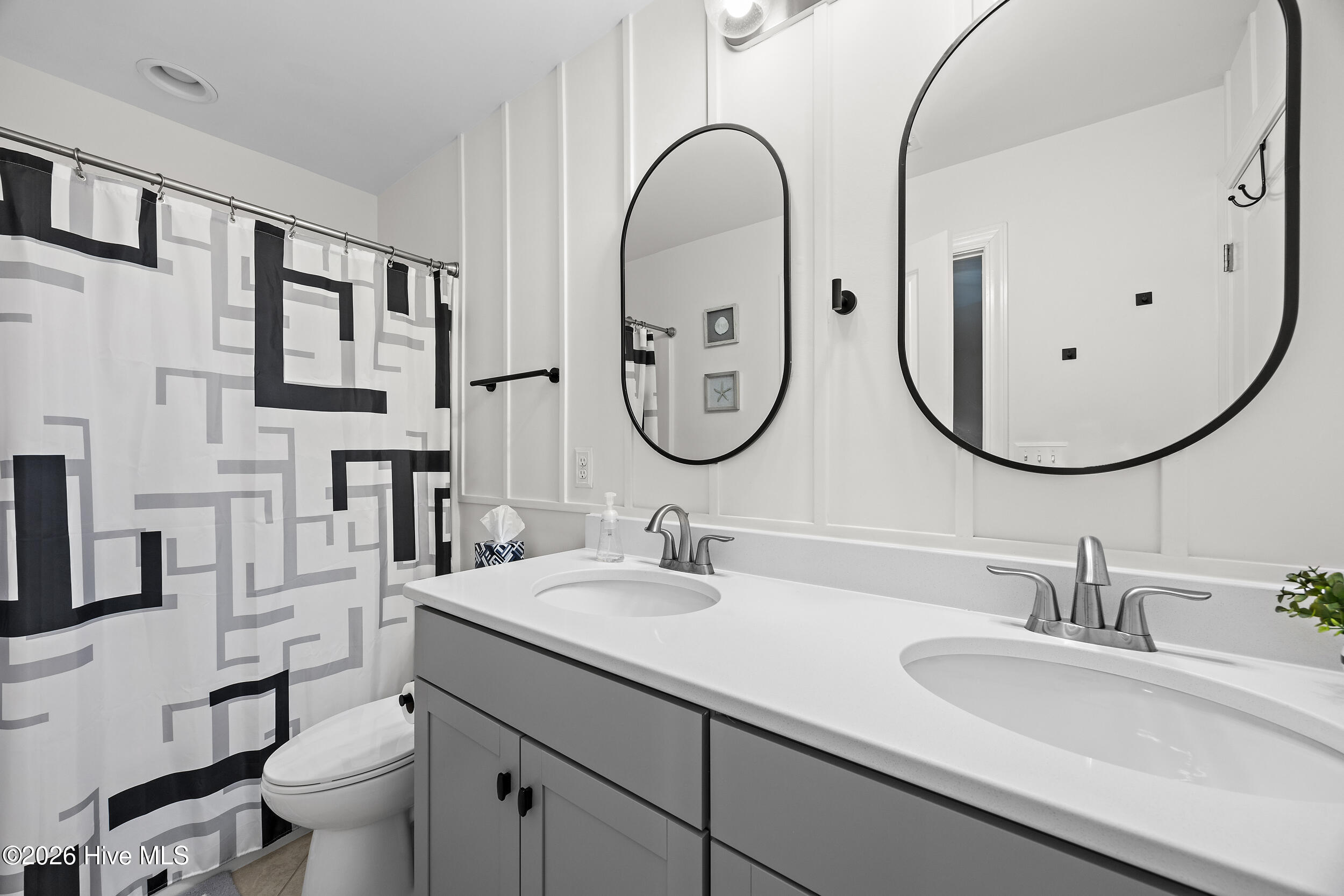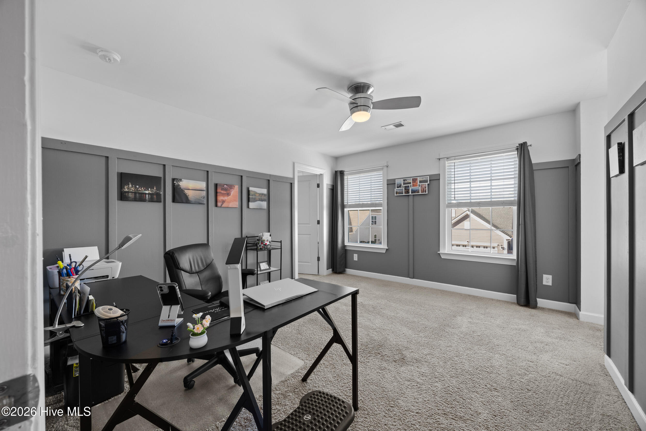 Welcome to easy living in the Villages of Olde Point, perfectly positioned in Hampstead's sought-after Topsail School District. With 2,451 square feet of space, this home offers 4 bedrooms, 2.5 bathrooms plus a bonus room. The main level features engineered hardwood floors, tons of natural light and a spacious primary suite with a large walk-in closet and ensuite bathroom with a walk-in shower and dual vanities. The open-concept design connects the living room, dining area, and sunroom. The living room is anchored by a gas log fireplace and has built-in surround sound. The kitchen showcases crisp white cabinetry, granite countertops, a white brick-style backsplash, under-cabinet lighting, upgraded stainless appliances including a gas range, and an oversized pantry. A large eat-in bar provides the perfect spot for casual meals or morning coffee. Upstairs, you'll find three additional bedrooms plus a versatile office/bonus room that can easily adapt to your needs, whether that's a home office, playroom, or media space. A dedicated tech closet keeps everything organized and out of sight. Step outside to enjoy a beautifully maintained, fenced backyard with mature landscaping, flowering shrubs, and a private patio. Additional peace of mind comes with a transferable Choice Home Warranty in place through 2030. Conveniently located near golf, shopping, dining, boat ramps, the Intracoastal Waterway, and area beaches, this home is sure to impress.