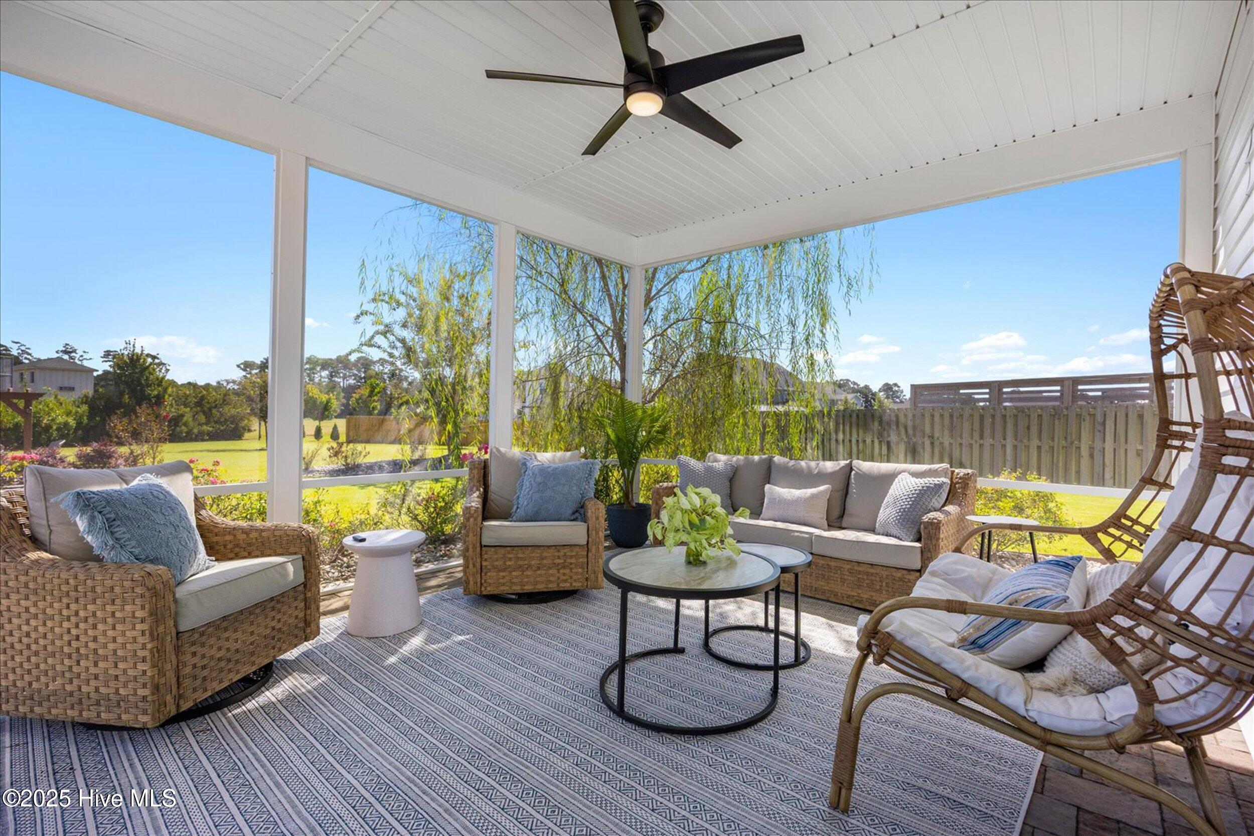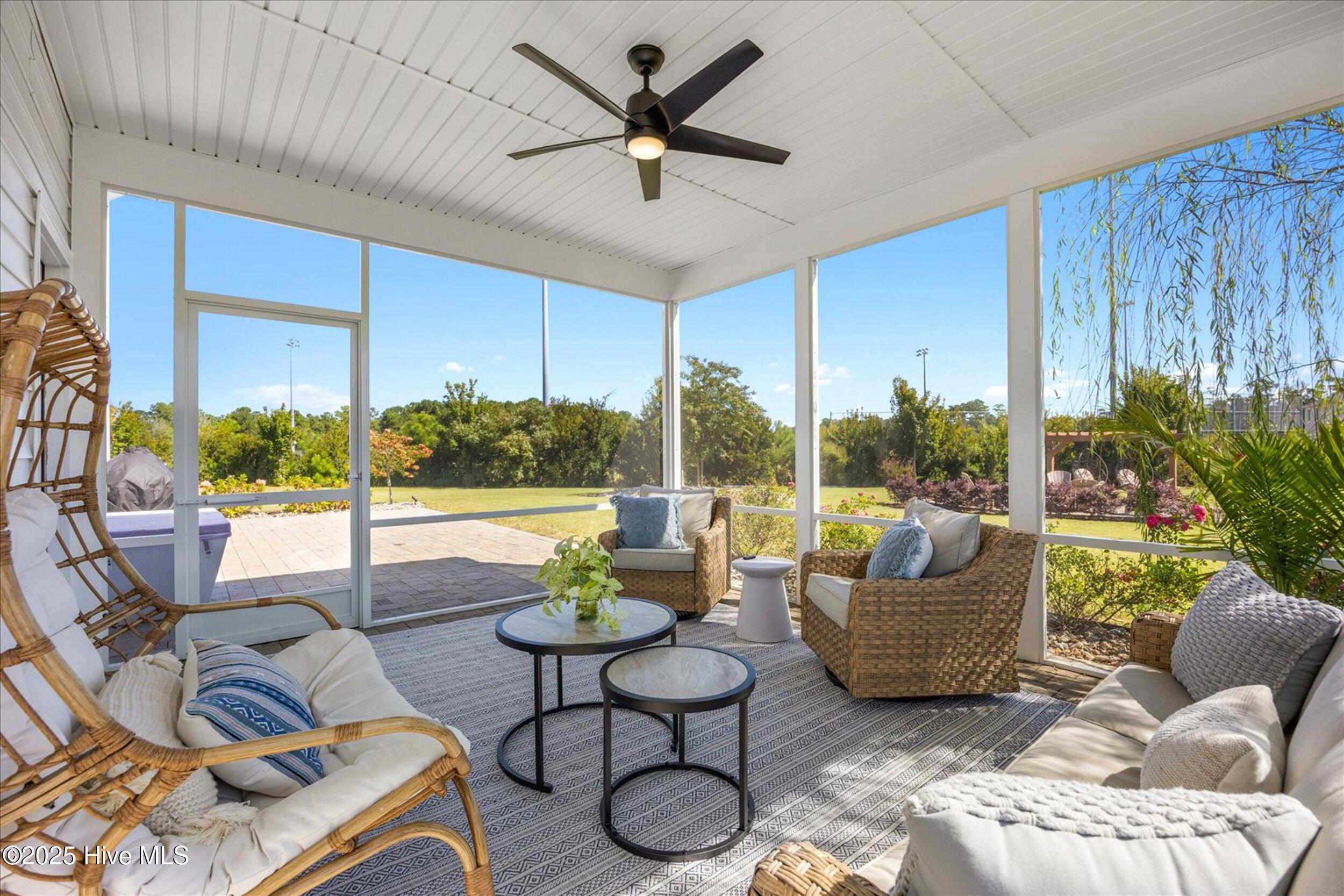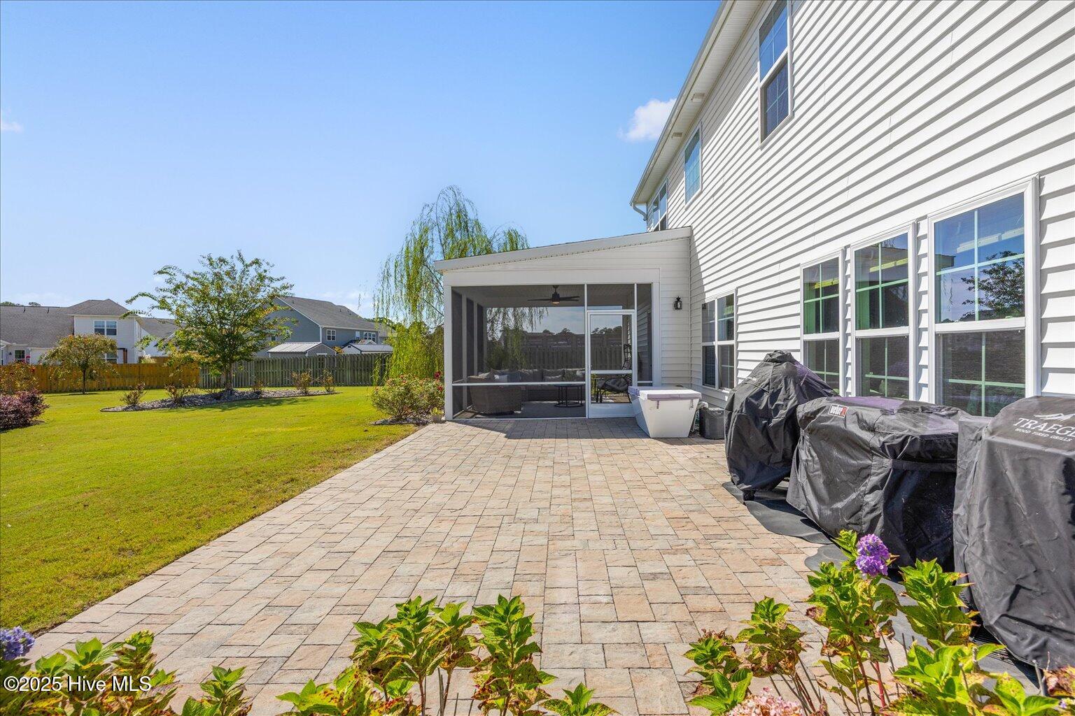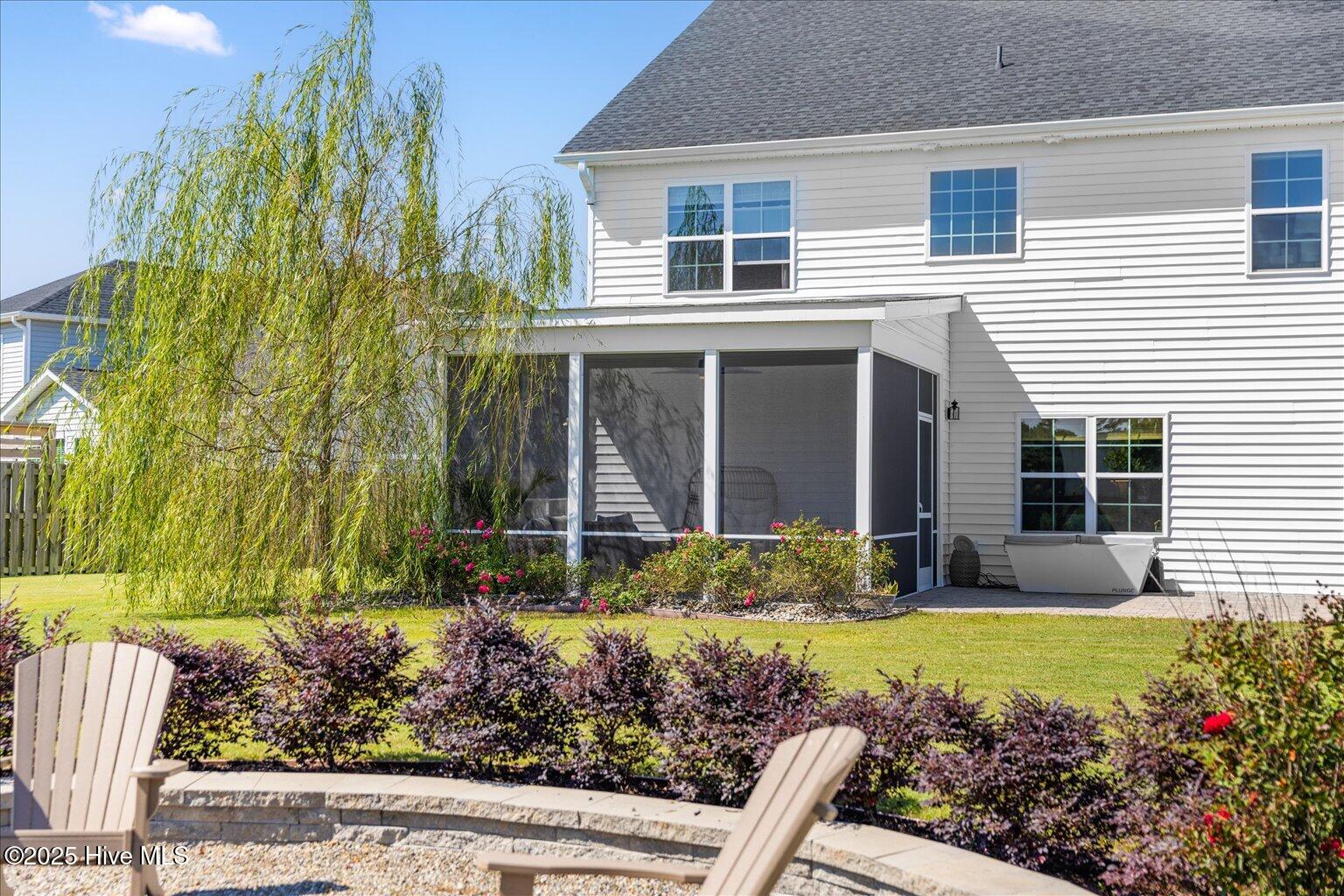Notable upgrades include a custom stone gas fireplace, extended paver patio and fire pit, screened porch addition, full-yard irrigation,