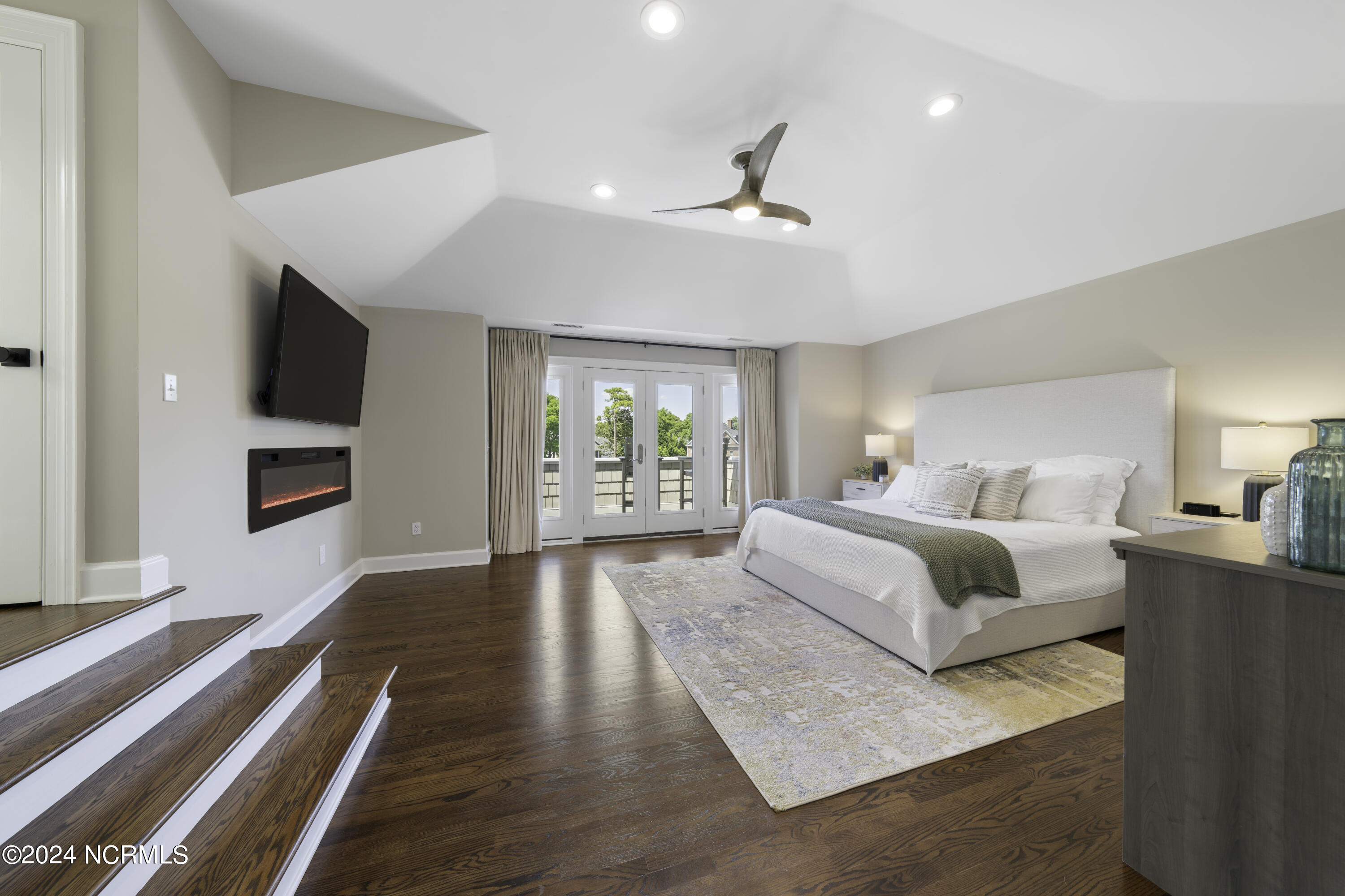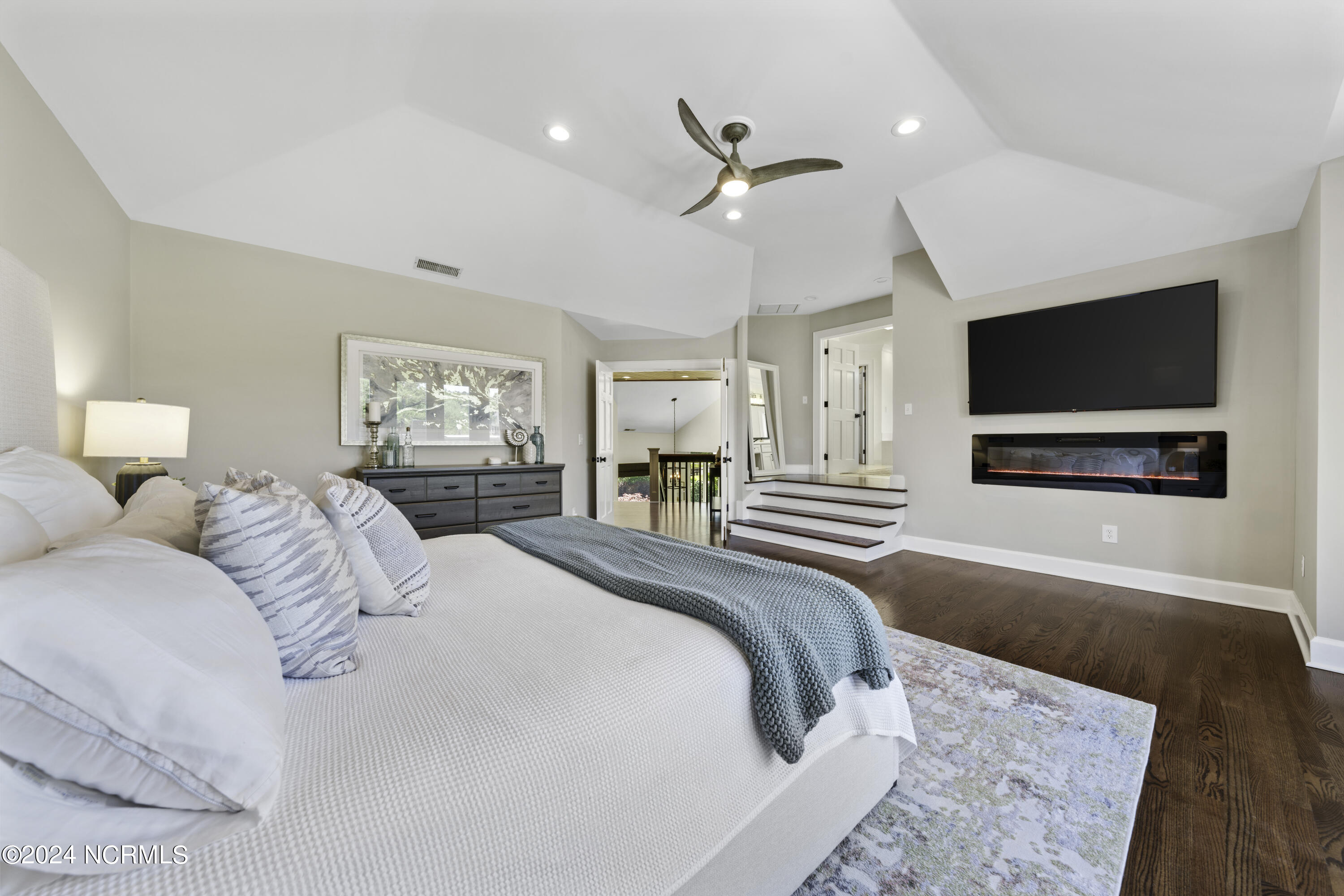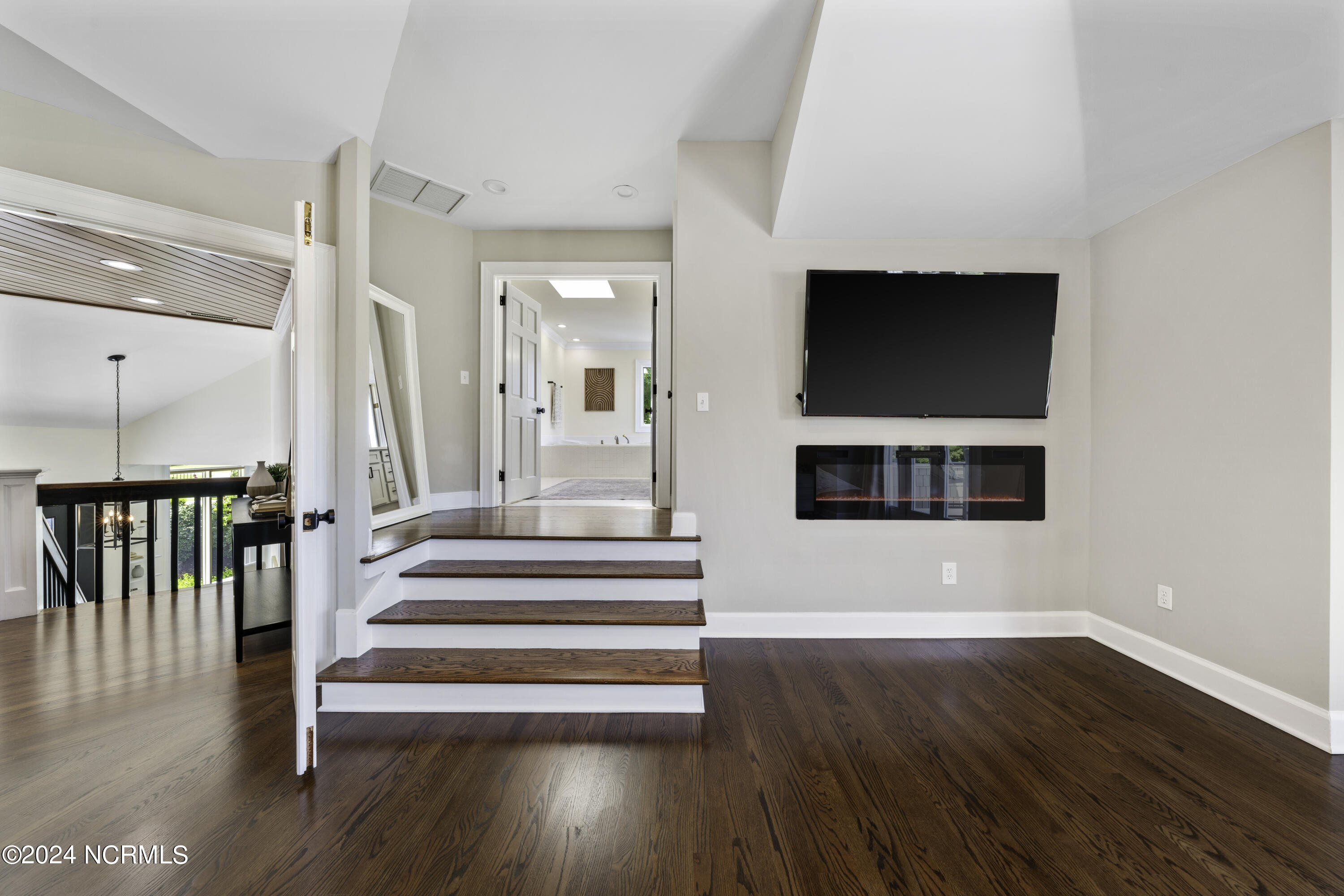 The upstairs includes 2 guest bedrooms and the primary suite. The luxurious primary retreat features a glass fireplace, custom closet, steam shower, new vanity, and a private balcony with impact-resistant doors.