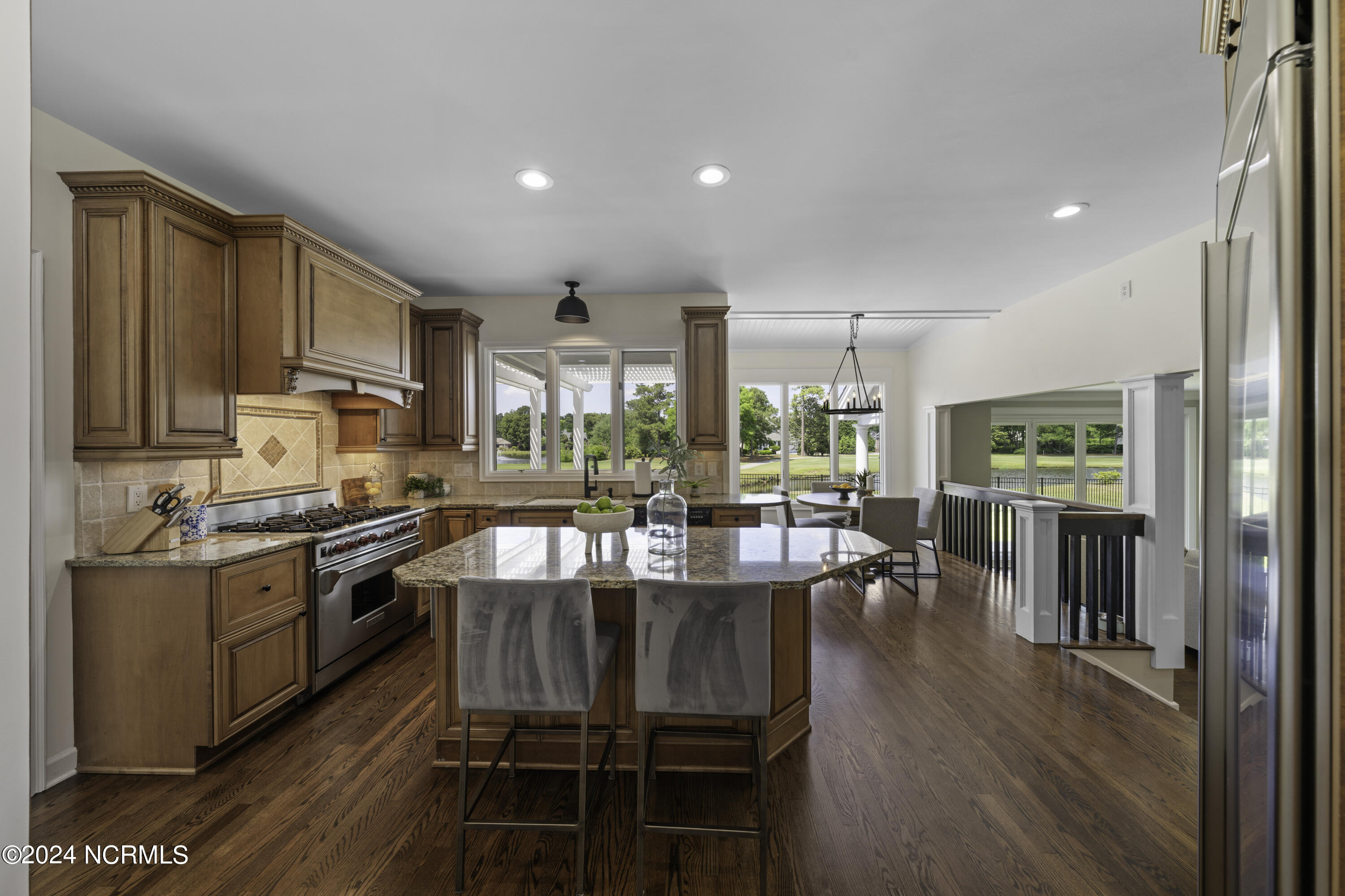 Enter thru the amazing statement and newly installed full glass front door into this calming oasis. Interior highlights include vaulted ceilings with trim details, new hardwood flooring throughout, fresh neutral paint, and updated lighting and plumbing fixtures. The open layout combines high ceilings and abundant natural light, multiple access points to the outdoor living spaces. Formal living & dining areas upon entry to the foyer and also an additional living space boasting a gas fireplace and impact-resistant folding sliders leading off to the back porch. The gourmet kitchen offers granite countertops, a Wolf gas stove, and a breakfast nook with panoramic views of the course & access to the covered back patio.