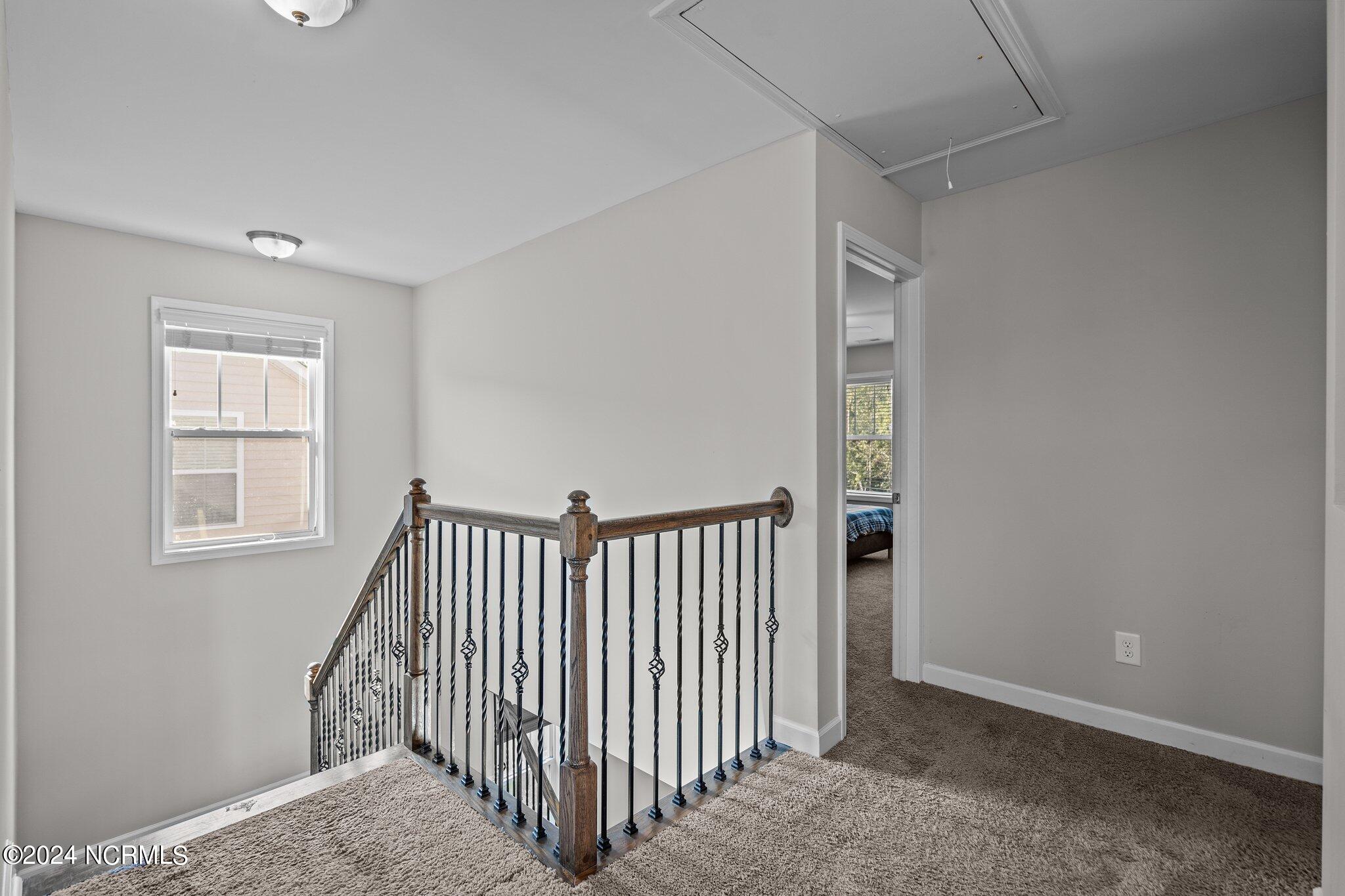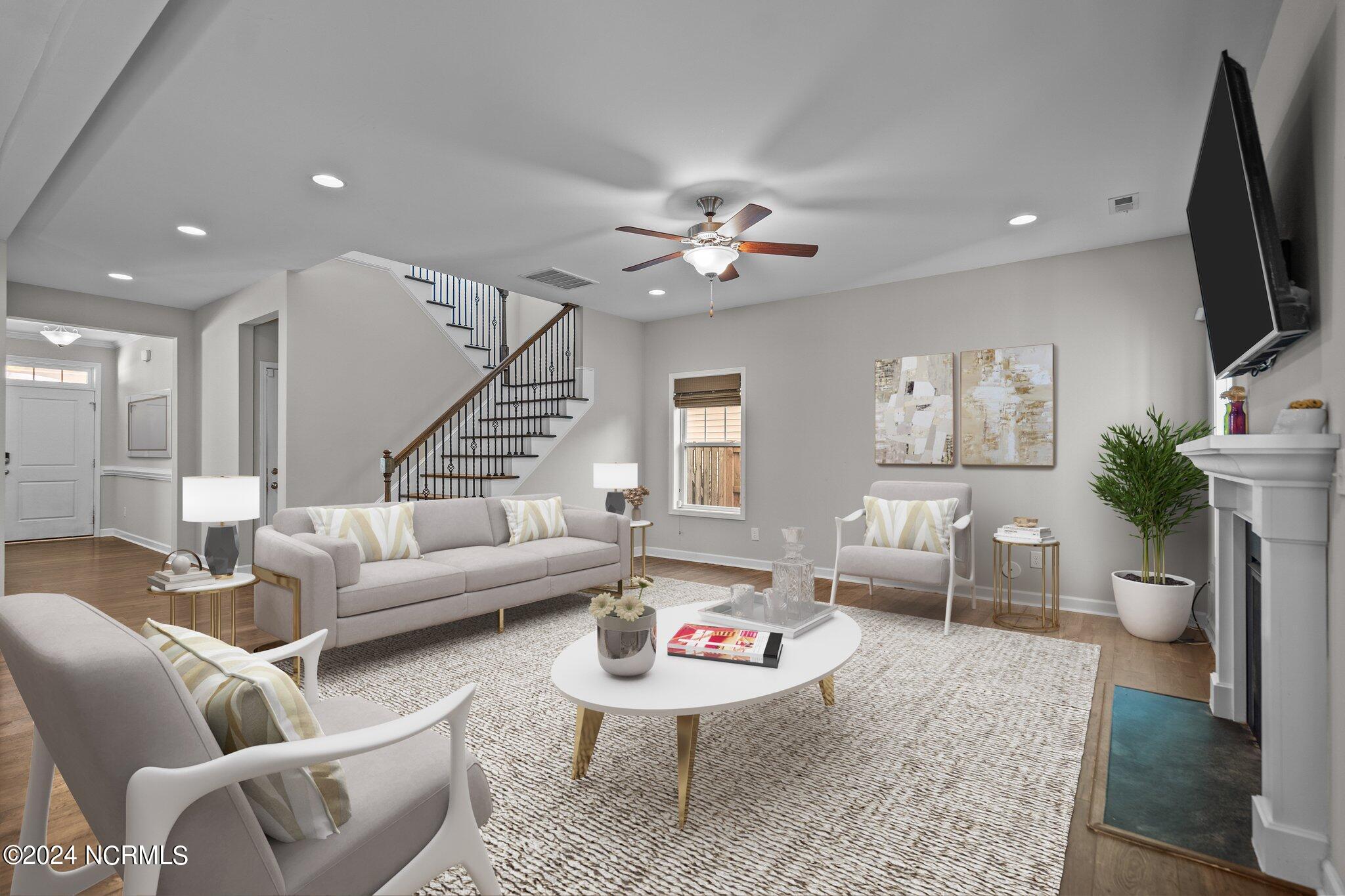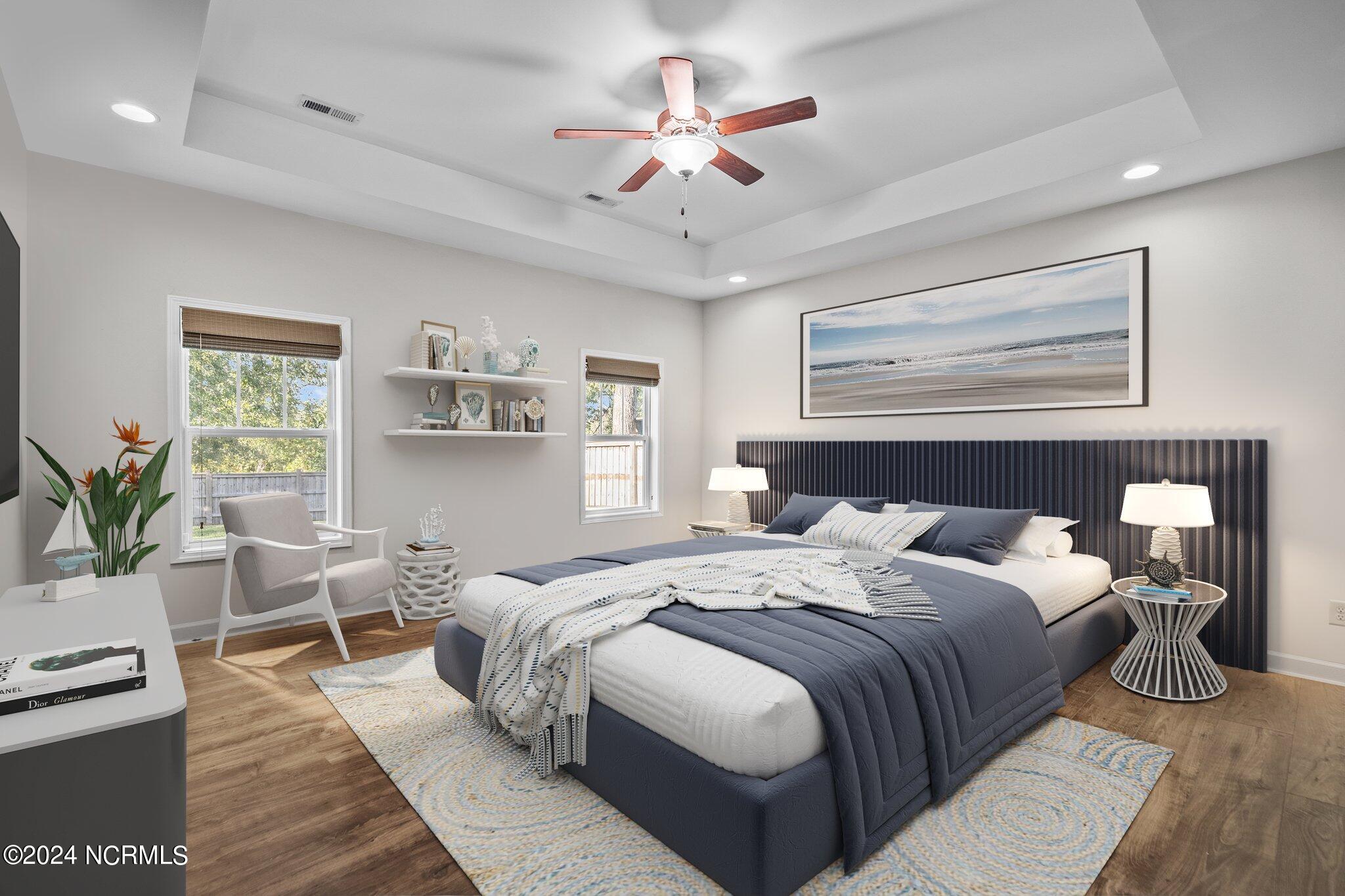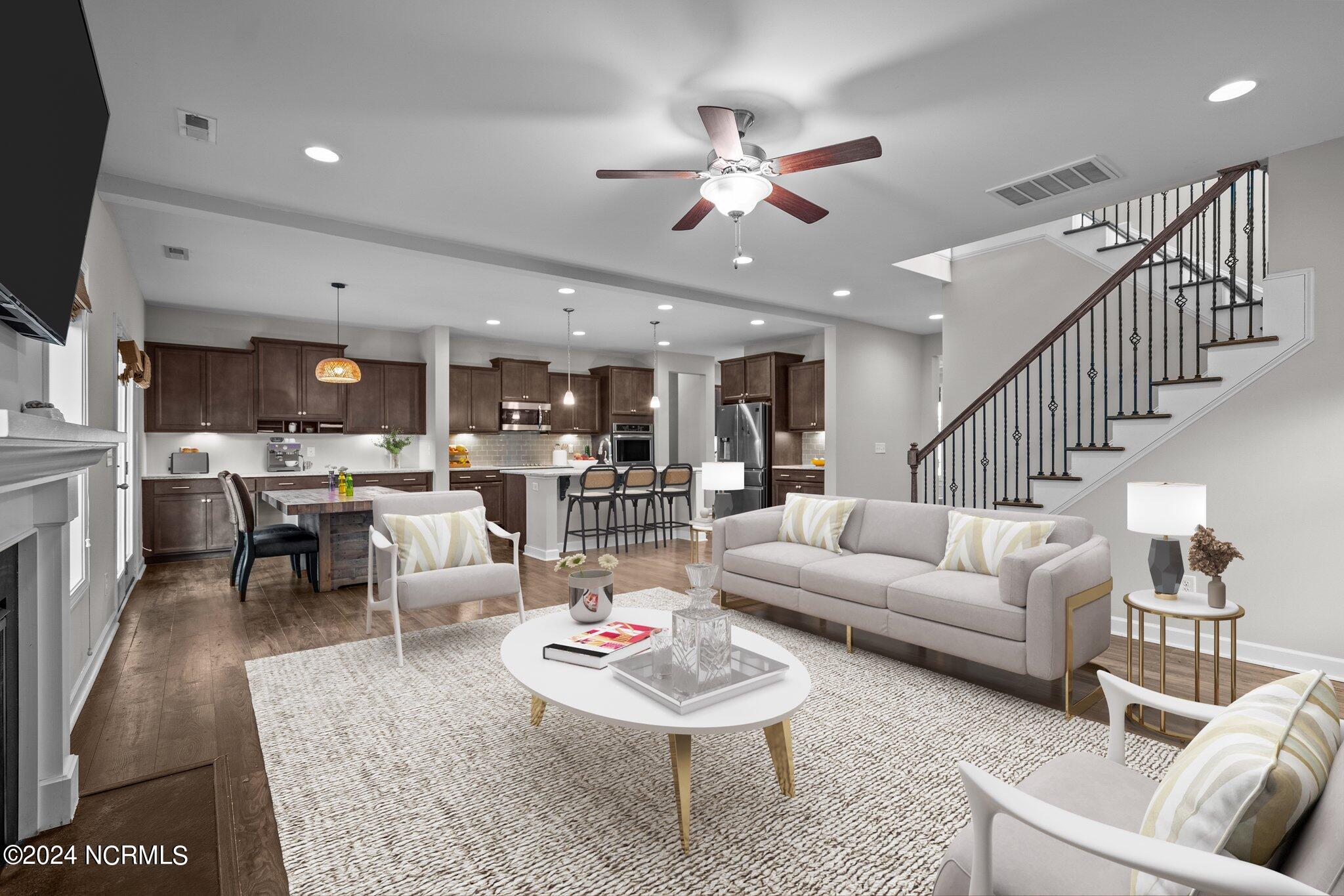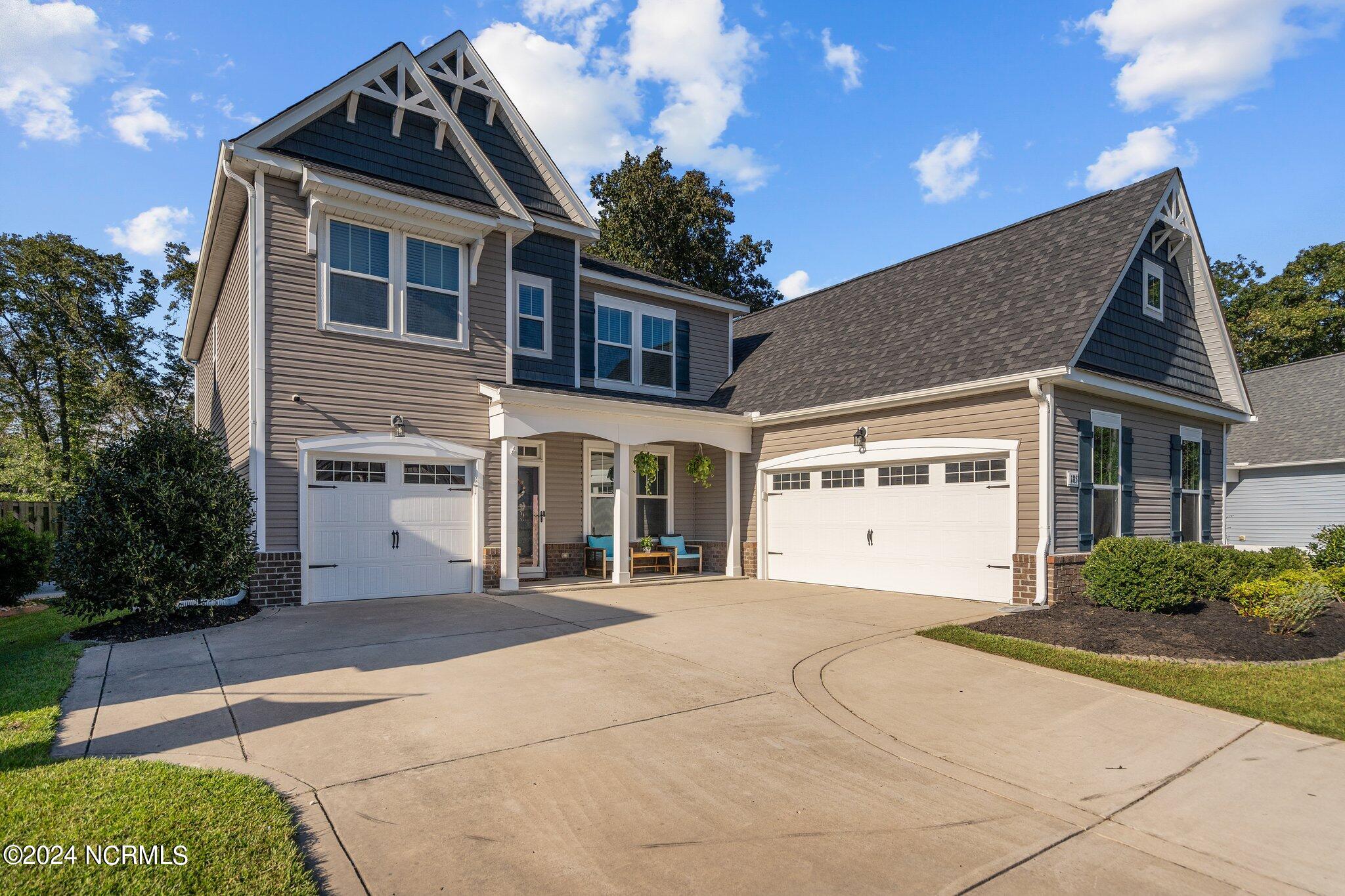 Welcome to 185 Violetear Ridge, a stunning two-story home nestled in the heart of Hampstead's desirable Sparrows Bend neighborhood. This 5-bedroom, 4.5-bathroom residence boasts a two-car garage plus an additional third car garage, all set on a spacious cul-de-sac lot that exudes curb appeal. Step inside to a welcoming foyer that opens to a formal dining room adorned with coffered ceilings and wainscoting. The dining room connects seamlessly to the kitchen through a butler pantry that includes a huge walk-in pantry. The gourmet kitchen features quartz countertops, a subway tile backsplash, stainless steel appliances, double ovens, ample counter and cabinet space, and a large kitchen island. Overlooking the breakfast nook and the expansive living room with a gas-log fireplace, this kitchen is perfect for both everyday living and entertaining. The luxurious master suite, located on the first floor, boasts tray ceilings, dual vanities, a walk-in shower with a rain-shower head, and a spacious walk-in closet. The first floor also includes a convenient half bath and a large laundry room equipped with a dog-washing station. Head upstairs to discover a versatile loft area, four additional bedrooms, and three full bathrooms, providing plenty of space for family and guests. Outside, a covered patio offers a perfect spot for relaxation, overlooking the large, fenced-in backyard. Sparrows Bend is a charming community offering amenities such as a pool and clubhouse, making it a fantastic place to call home.