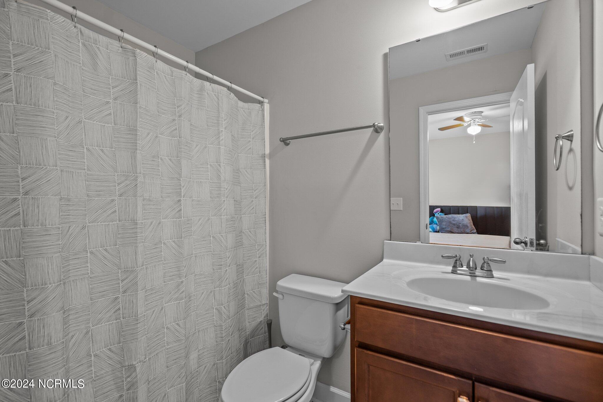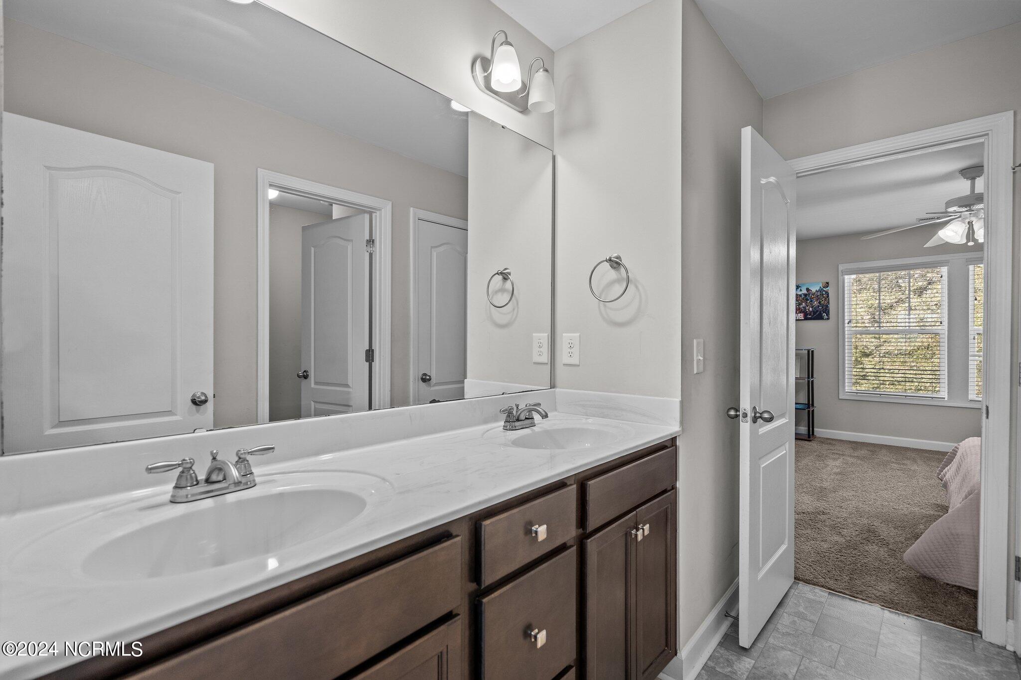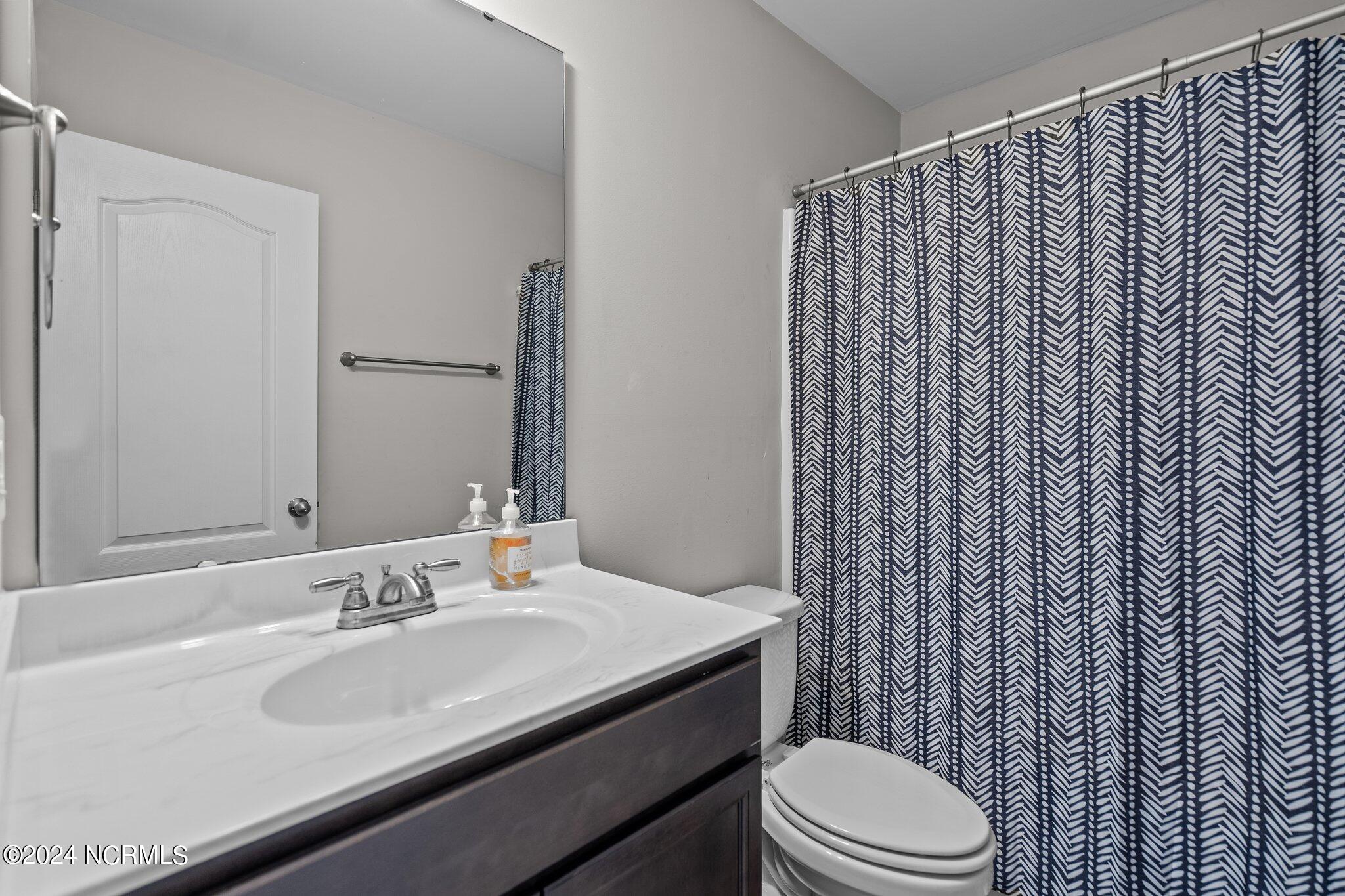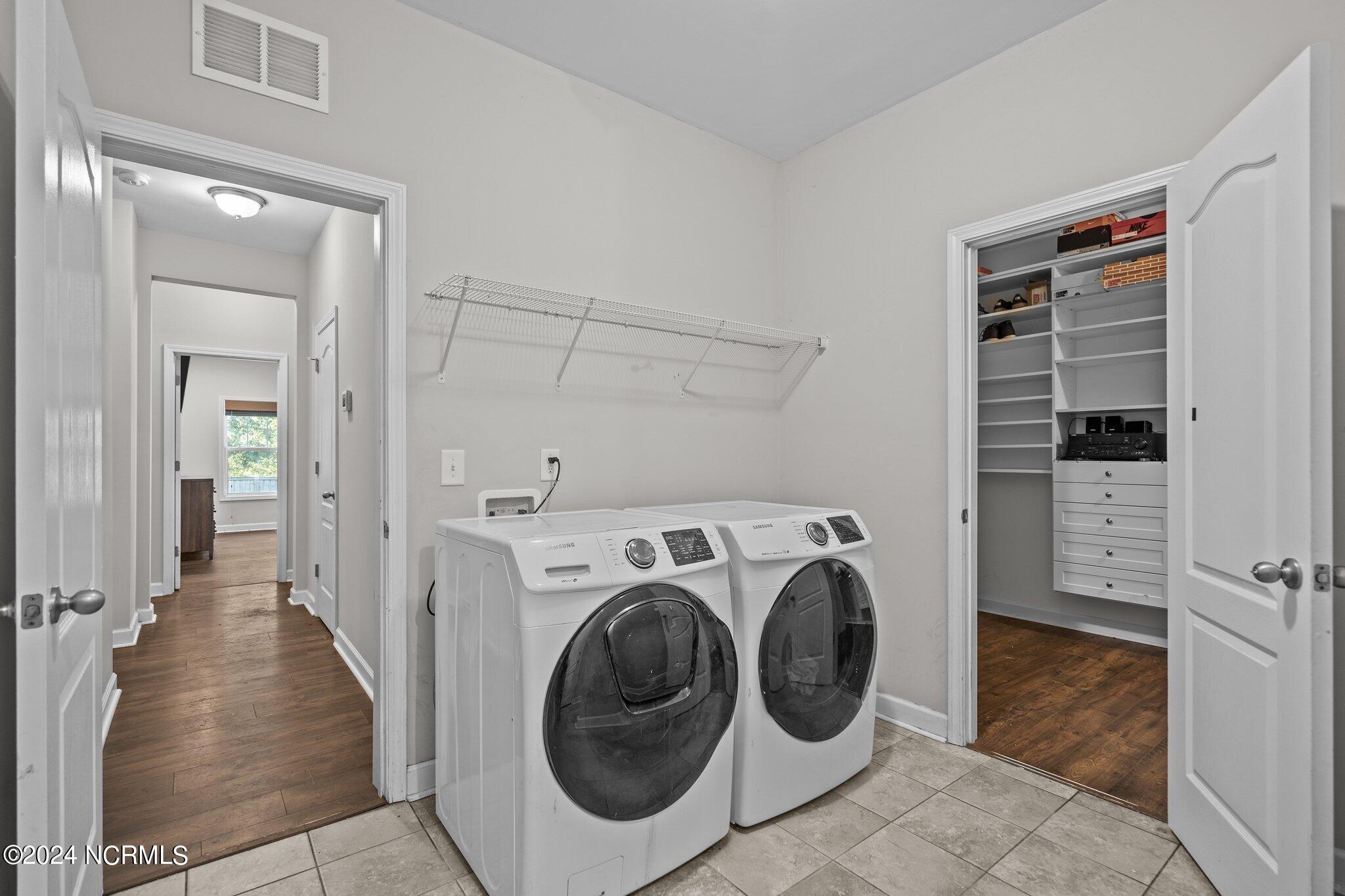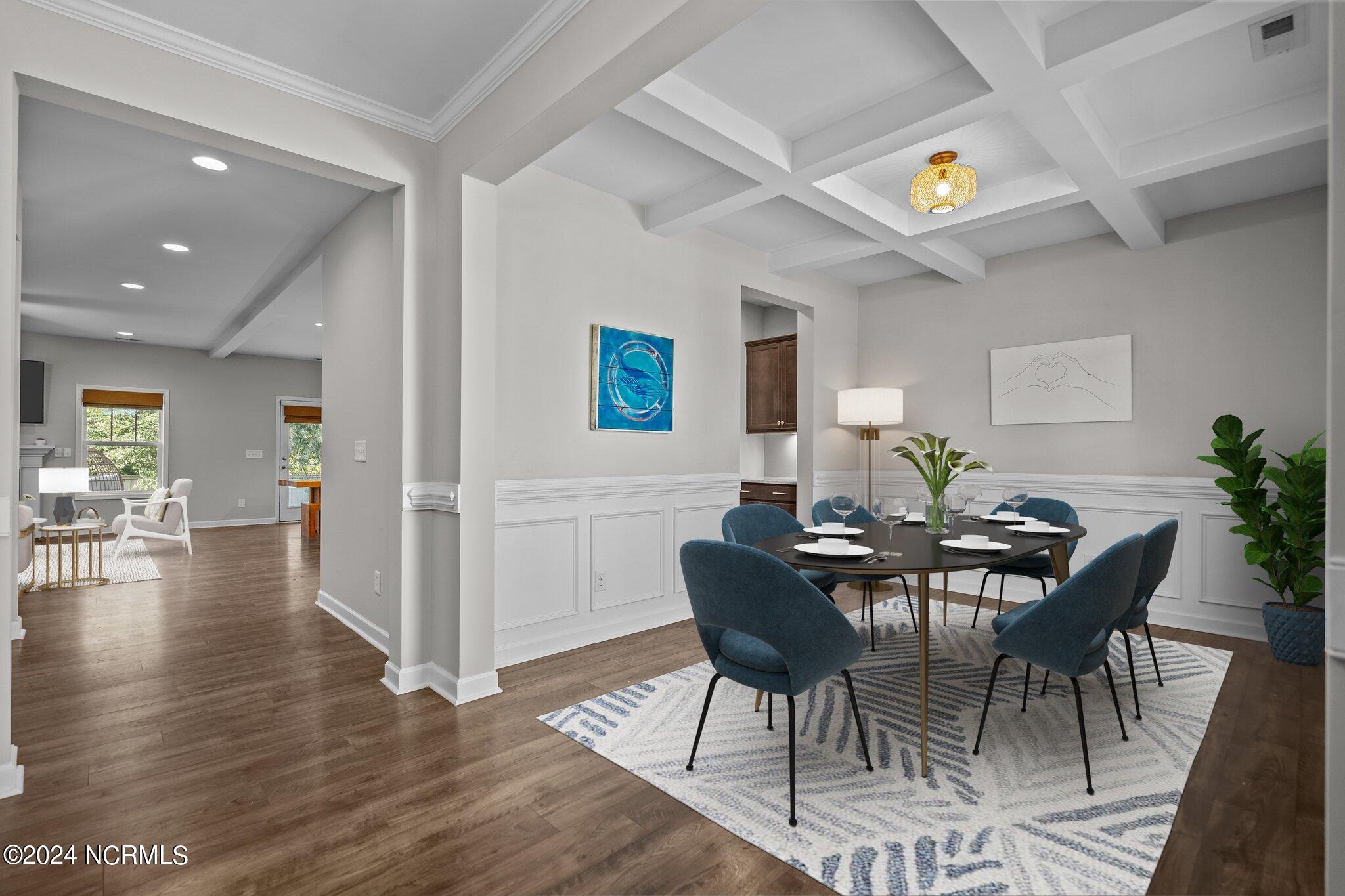 Welcome to 185 Violetear Ridge, a stunning two-story home nestled in the heart of Hampstead's desirable Sparrows Bend neighborhood. This 5-bedroom, 4.5-bathroom residence boasts a two-car garage plus an additional third car garage, all set on a spacious cul-de-sac lot that exudes curb appeal. Step inside to a welcoming foyer that opens to a formal dining room adorned with coffered ceilings and wainscoting. The dining room connects seamlessly to the kitchen through a butler pantry that includes a huge walk-in pantry. The gourmet kitchen features quartz countertops, a subway tile backsplash, stainless steel appliances, double ovens, ample counter and cabinet space, and a large kitchen island. Overlooking the breakfast nook and the expansive living room with a gas-log fireplace, this kitchen is perfect for both everyday living and entertaining. The luxurious master suite, located on the first floor, boasts tray ceilings, dual vanities, a walk-in shower with a rain-shower head, and a spacious walk-in closet. The first floor also includes a convenient half bath and a large laundry room equipped with a dog-washing station. Head upstairs to discover a versatile loft area, four additional bedrooms, and three full bathrooms, providing plenty of space for family and guests. Outside, a covered patio offers a perfect spot for relaxation, overlooking the large, fenced-in backyard. Sparrows Bend is a charming community offering amenities such as a pool and clubhouse, making it a fantastic place to call home.