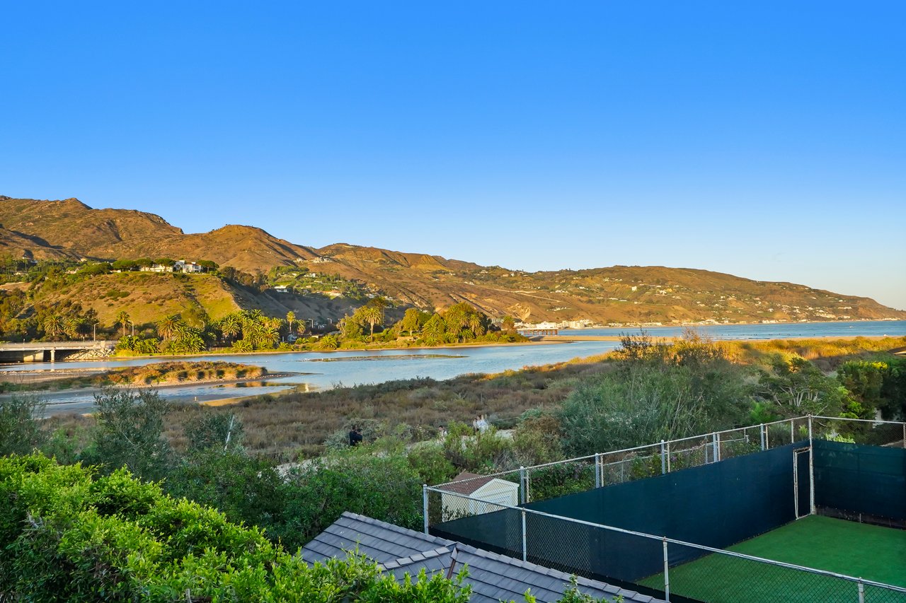 A dramatic curved staircase leads to the primary suite, featuring wood floors, a fireplace, and captivating views of the Malibu Lagoon and Santa Monica Bay. The en-suite bathroom includes a double vanity, skylight, and jetted soaking tub perfectly positioned to take in both mountain and ocean views. Two additional ocean-view bedrooms complete the upper level.