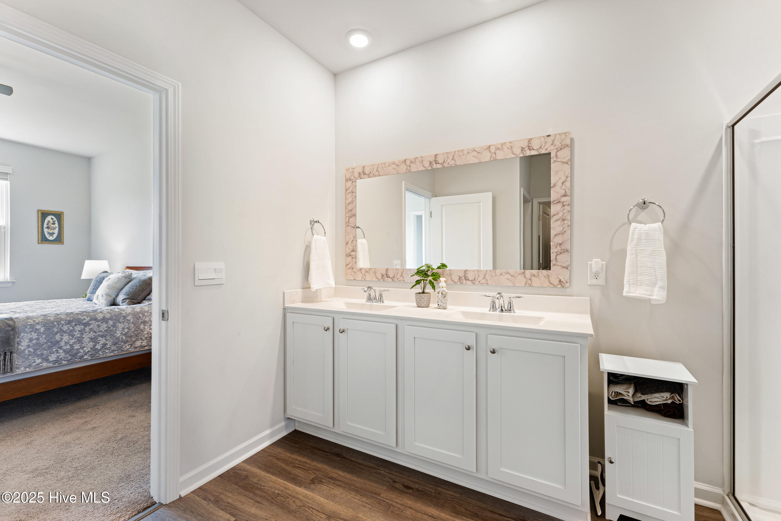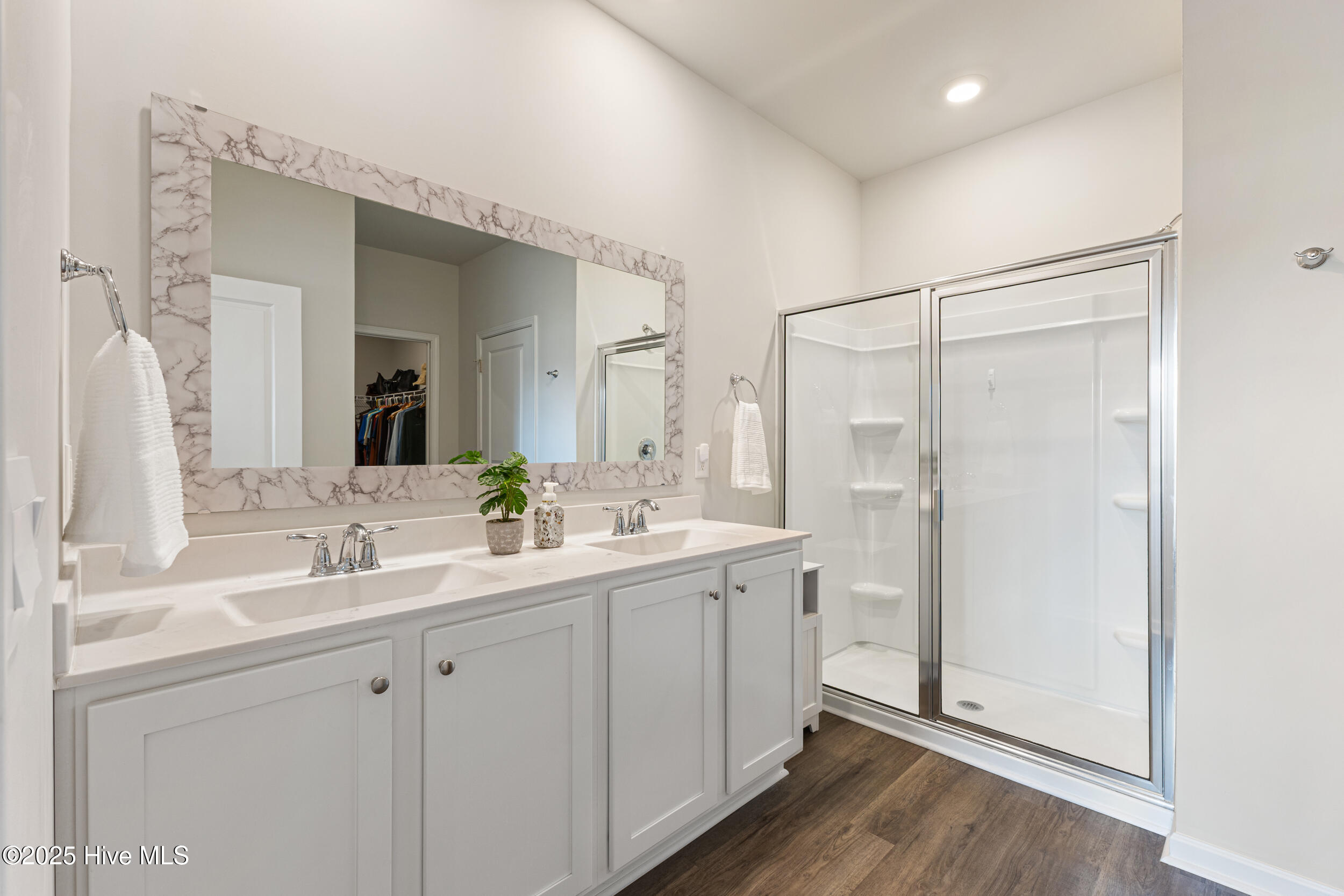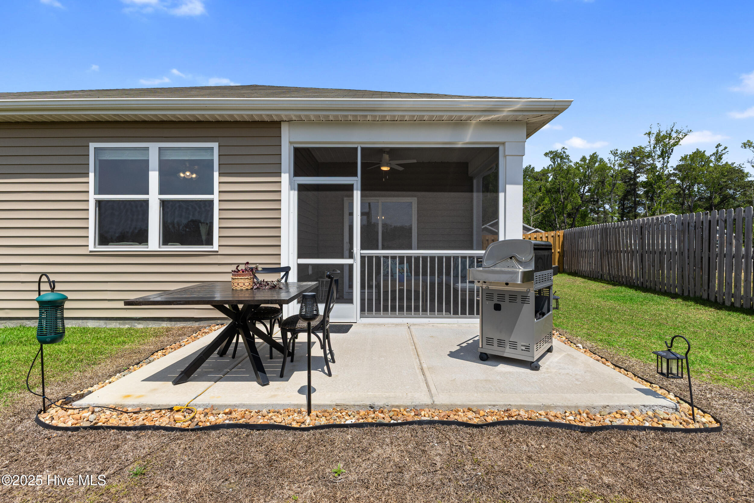 The spacious primary suite boasts dual vanities, a large walk-in shower, and two generous closets. Relax on the screened-in porch overlooking a partially fenced yard and tranquil green space.