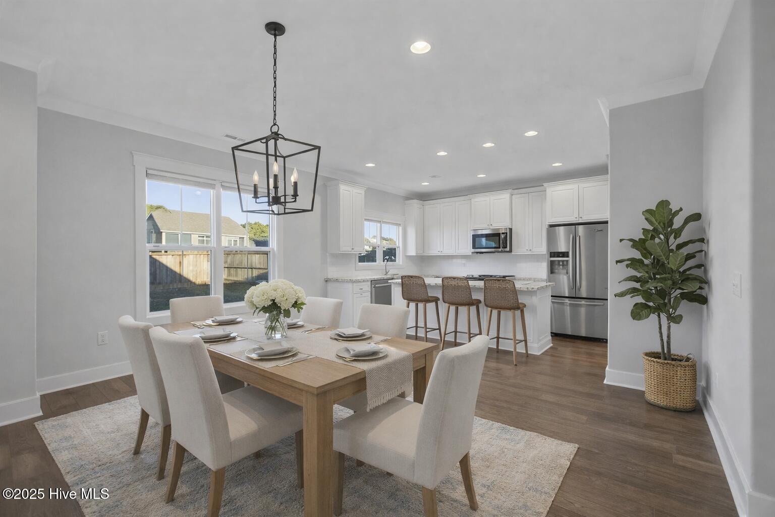 The living room is anchored by coffered ceilings, enginereed hardwoods and a gas-log fireplace with custom built-in shelving, creating a warm yet refined gathering space. The kitchen is both stylish and functional, featuring granite countertops, subway tile backsplash, stainless steel appliances, and a spacious eat-in island overlooking the dining area--perfect for all your entertaining.