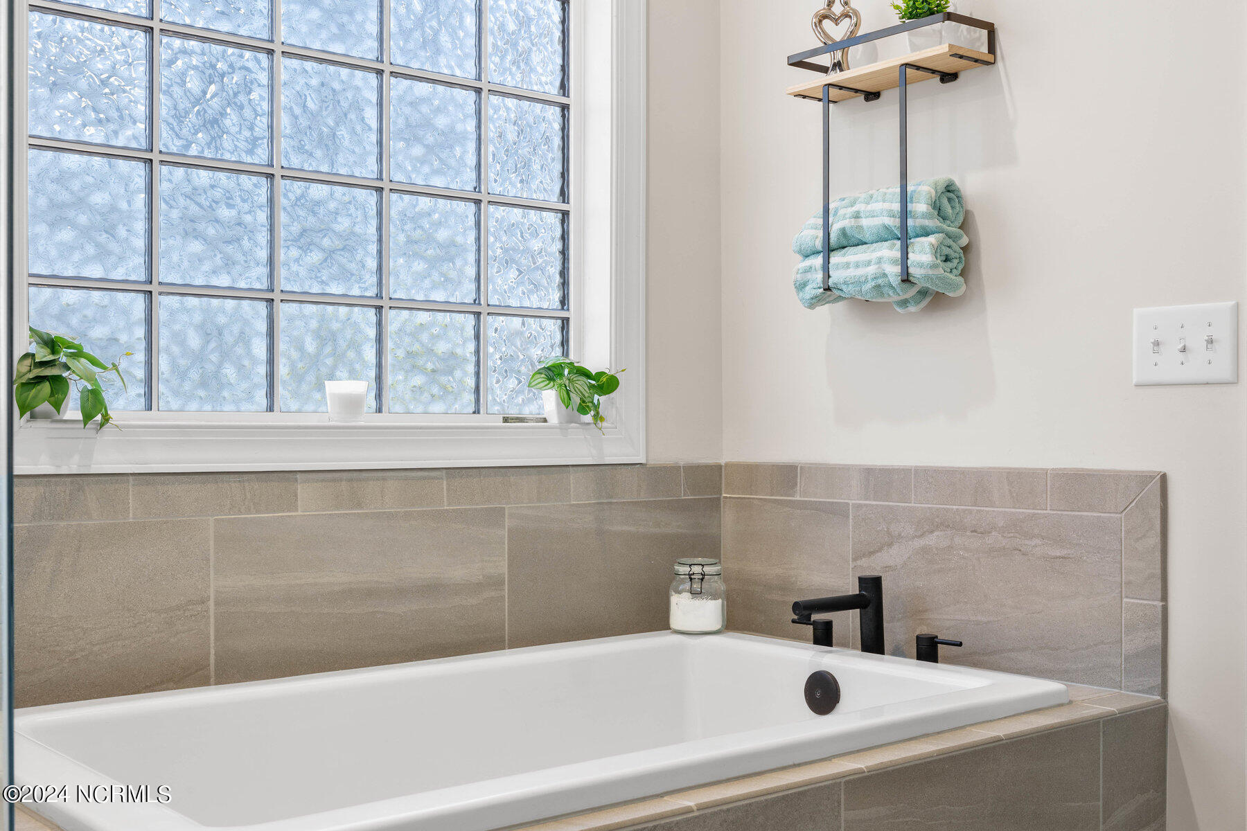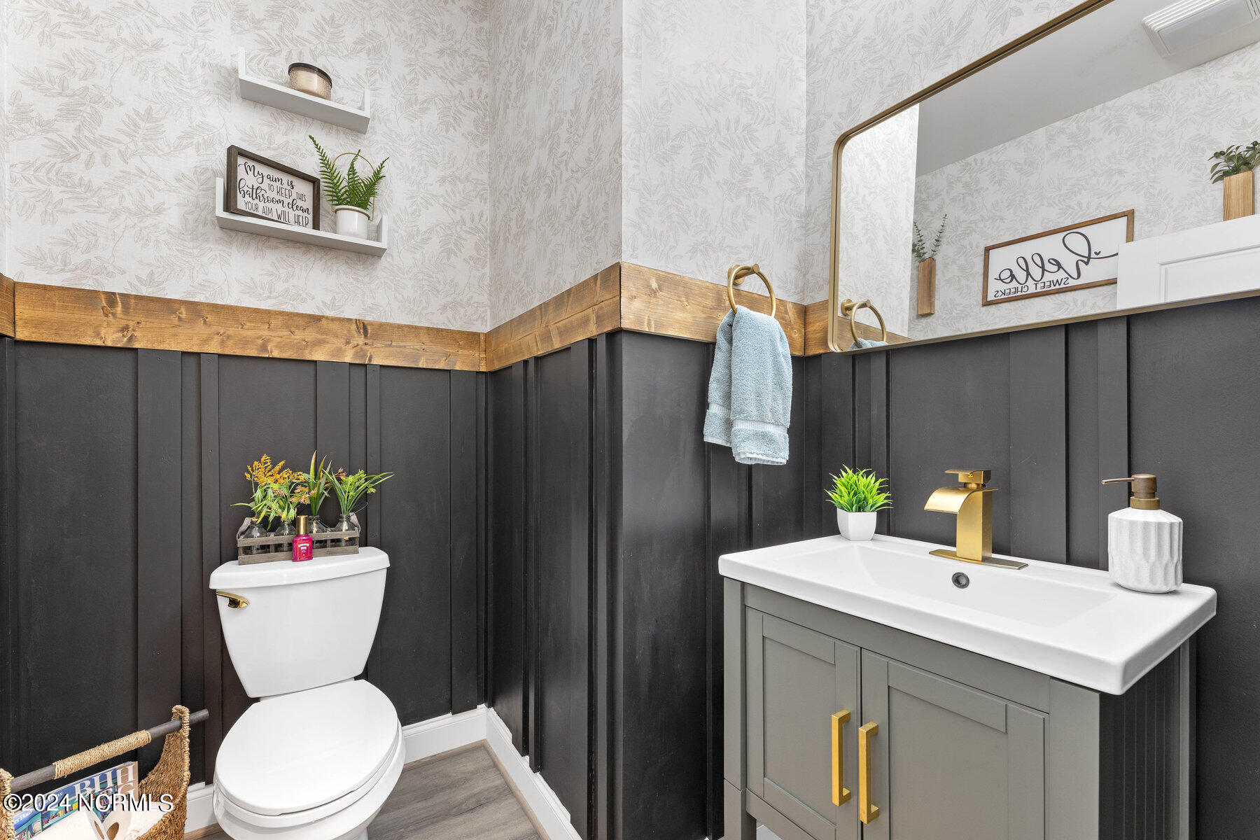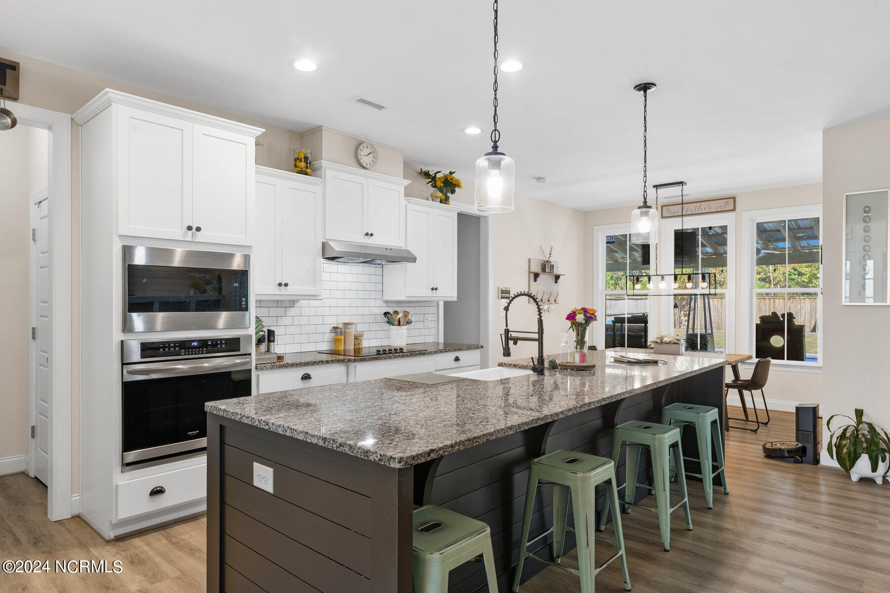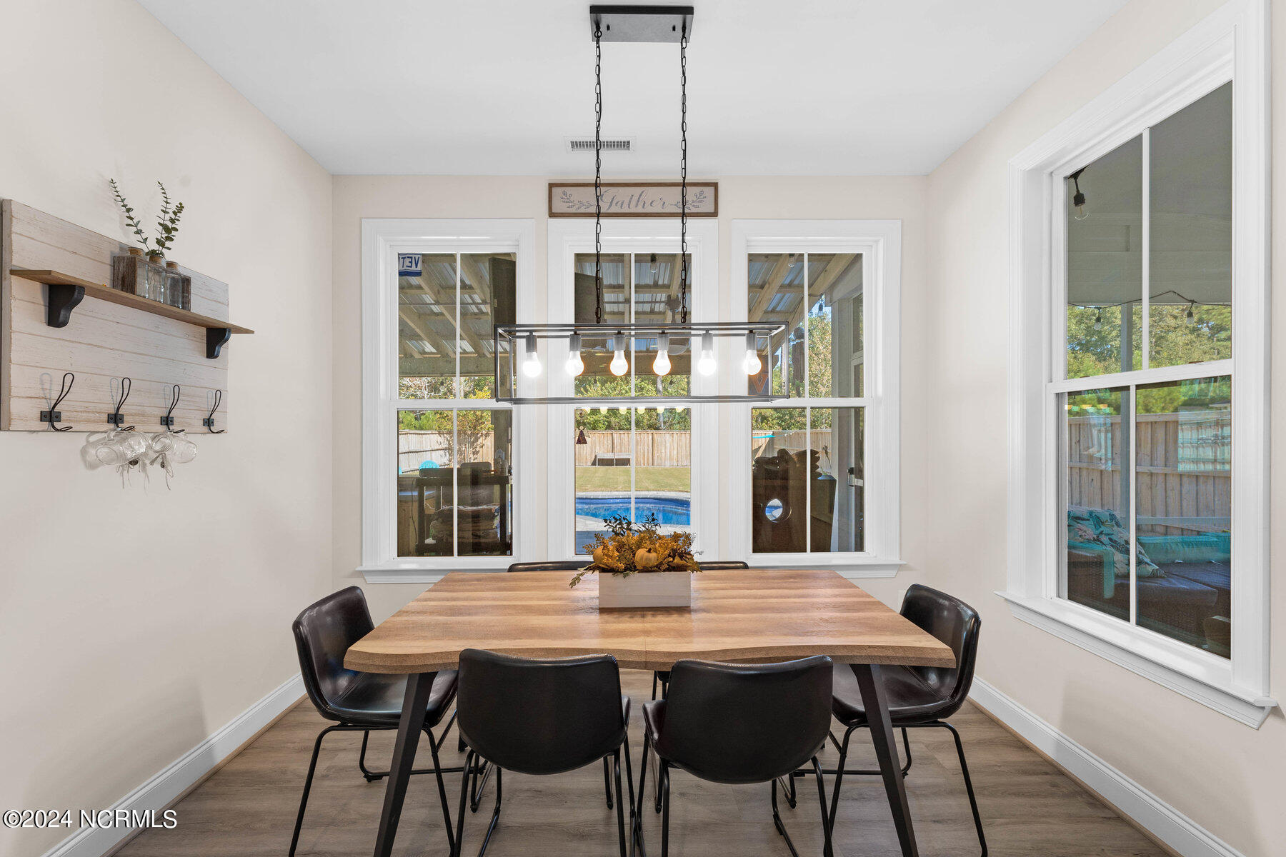 This stunning 2-story modern farmhouse, built in 2020, is situated on a premier corner lot that backs up to a serene natural area on a dead-end street with low traffic. With 4 bedrooms, 3.5 bathrooms, and just over 2,900 square feet of living space, this home is dripping in upgrades and designed for those who love to entertain. A charming rocking chair front porch invites you into a large foyer, leading to a spacious office on the right. The first-floor master suite features a stylish accent wall and a barn door that opens into a luxurious ensuite bathroom complete with dual vanities, a soaking tub, and a separate subway tile walk-in shower. The open concept floor plan boasts hardwood floors throughout the main living space and 9-foot ceilings on both floors. The gourmet kitchen features a large island, granite countertops, subway tile backsplash, upgraded appliances, and overlooks the living room and dining room. The living room is anchored by a gas log fireplace with built-ins and a shiplap surround. Four-panel sliding glass doors open wide to a screened-in porch, perfect for seamless indoor-outdoor entertaining. The backyard is an entertainer's paradise with a paver patio covered by a pergola, providing an ideal space for gatherings by the custom in-ground pool and hot tub. The fully fenced yard ensures privacy, making this space a perfect retreat. Upstairs, you'll find three spacious bedrooms, two of which are connected by a Jack-and-Jill bathroom, and a large bonus room with a full bathroom that can easily double as a fifth bedroom or guest suite. Situated in the Wyndwater Community, residents enjoy access to amenities including a pool, walking trails, picnic areas, sidewalks and more.