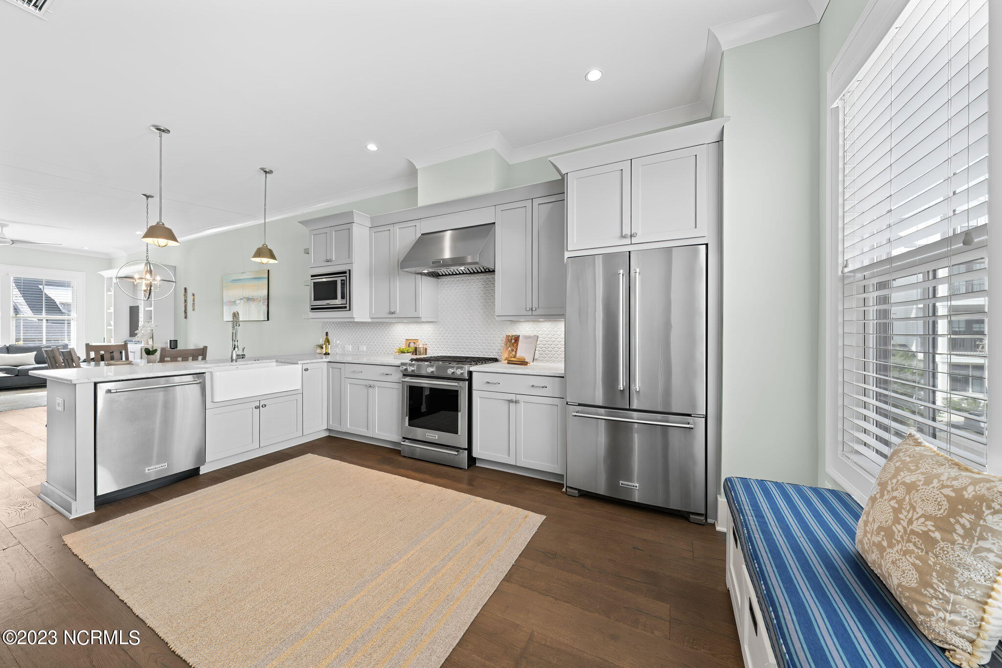 * Kitchen boasts top-tier Kitchen Aid appliances, quartz countertops, and custom shaker-style cabinets with optimized storage.