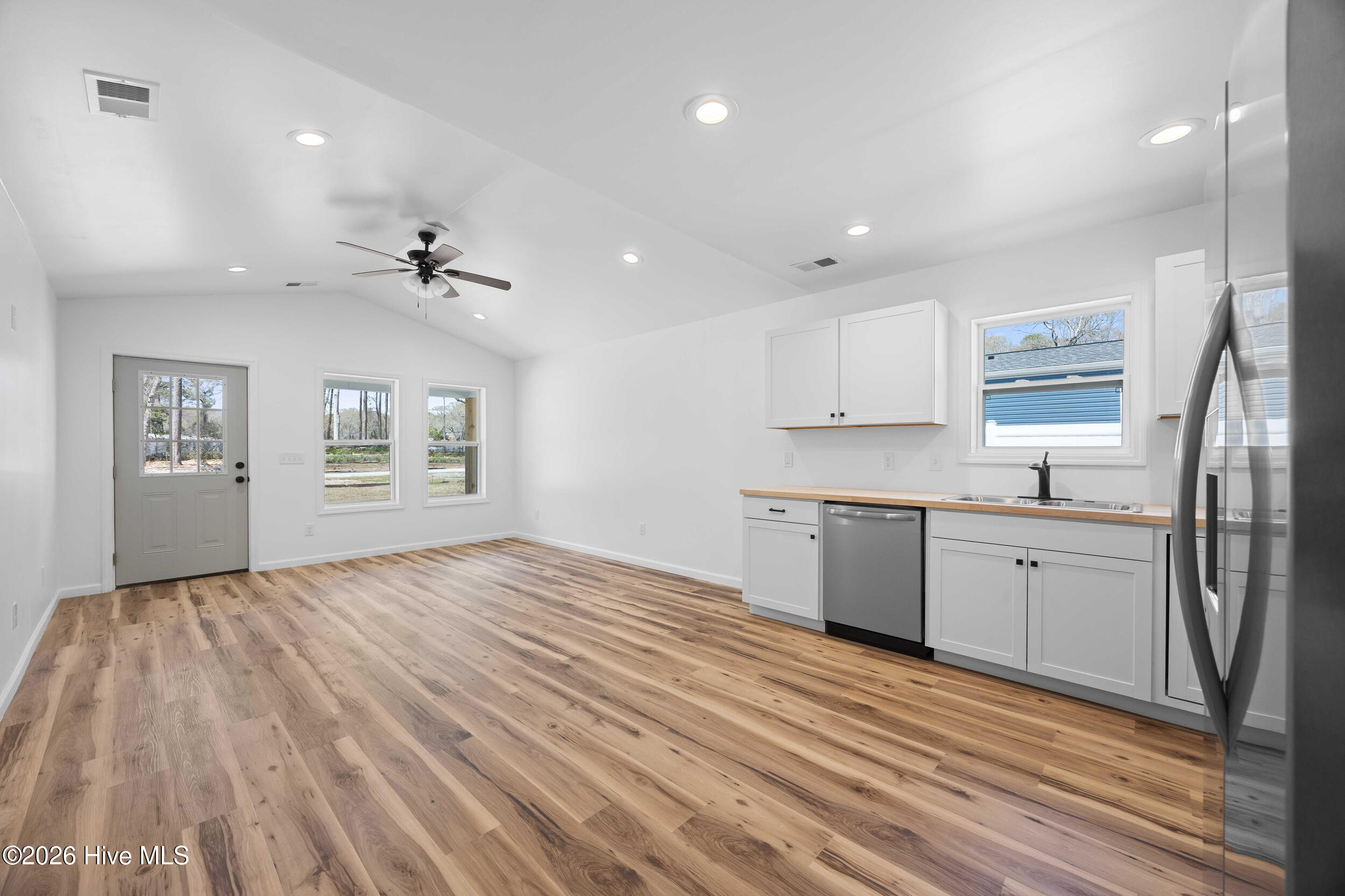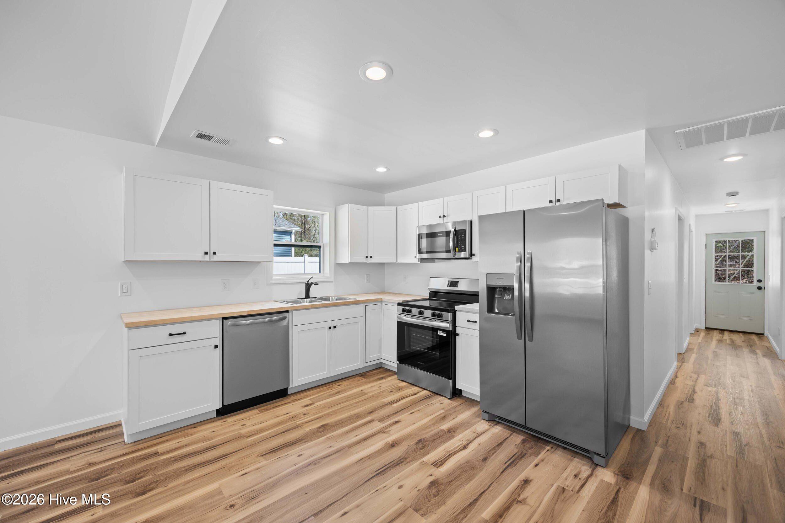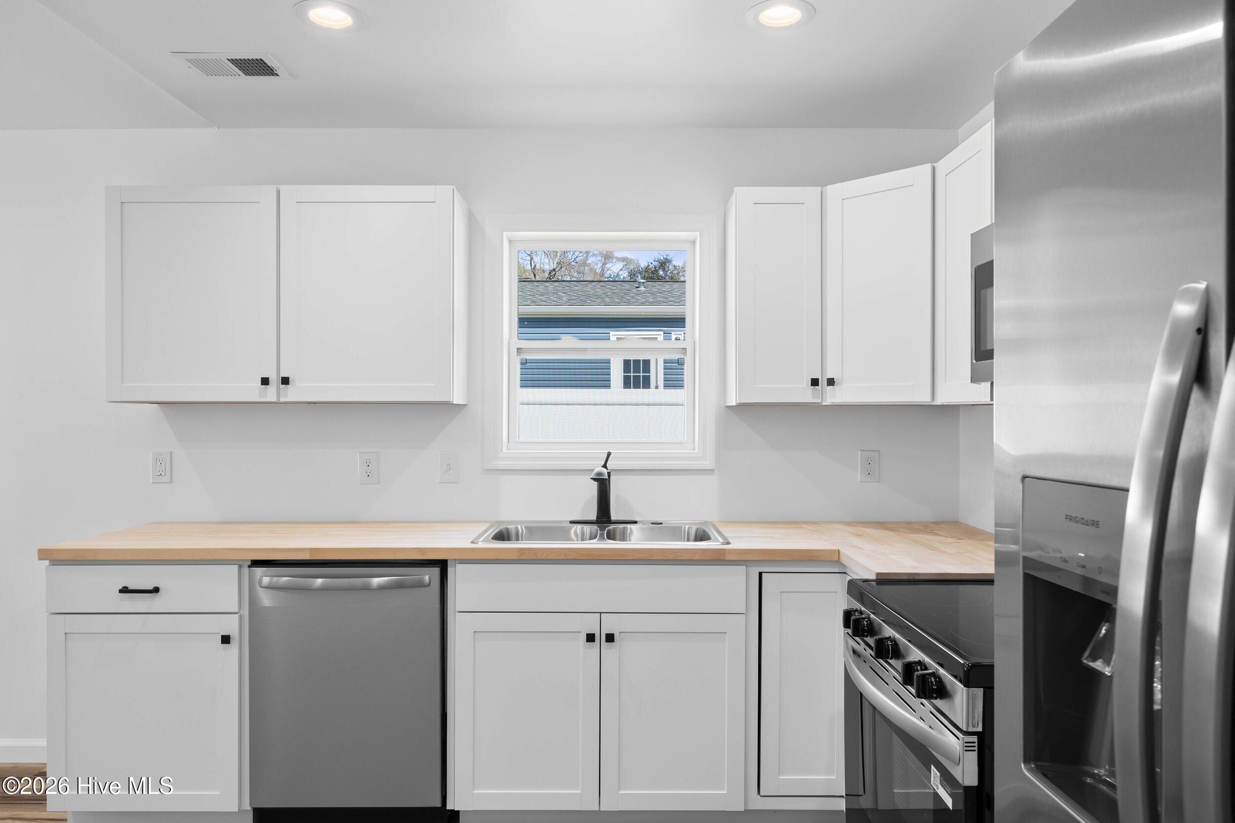 The kitchen is designed with functionality in mind, featuring Frigidaire appliances and butcher block countertops that create an inviting space for cooking and gathering.