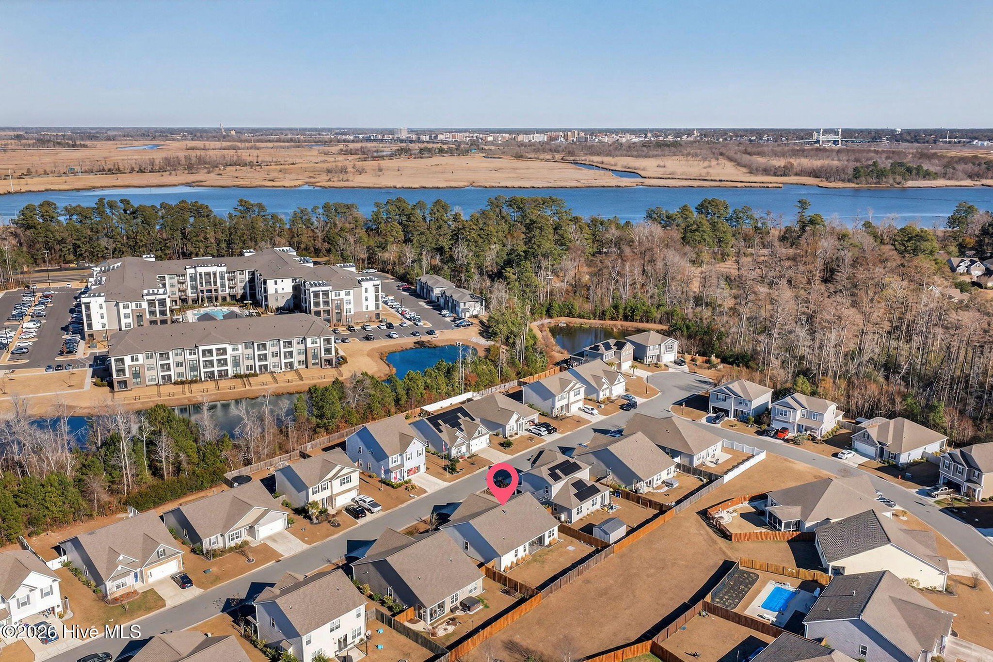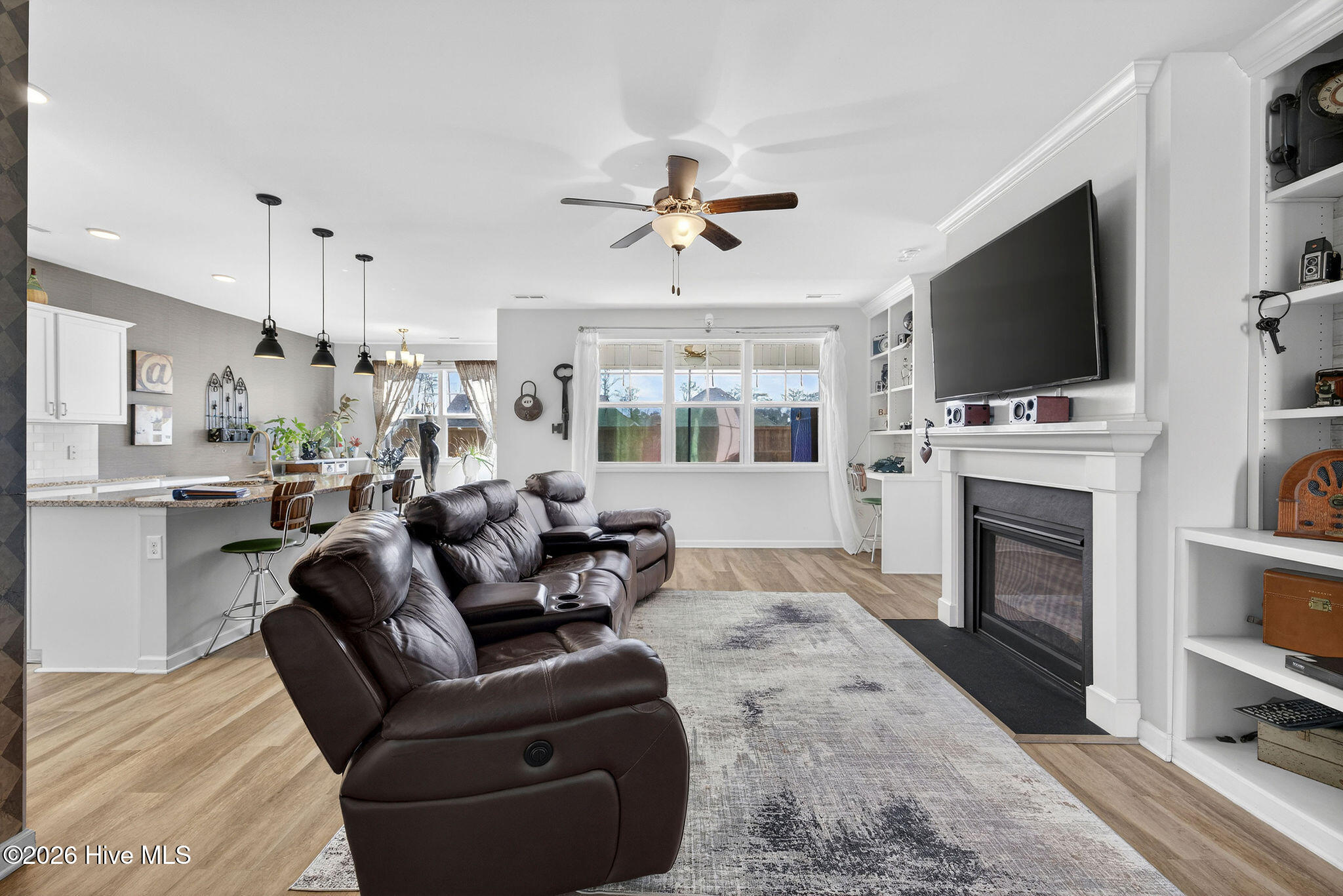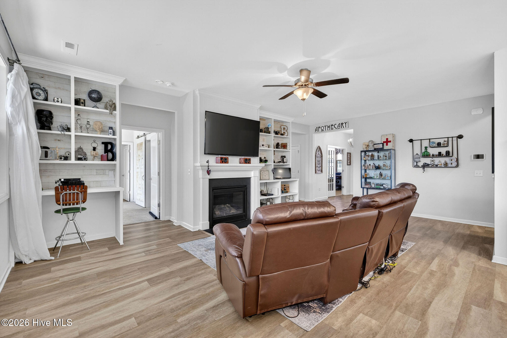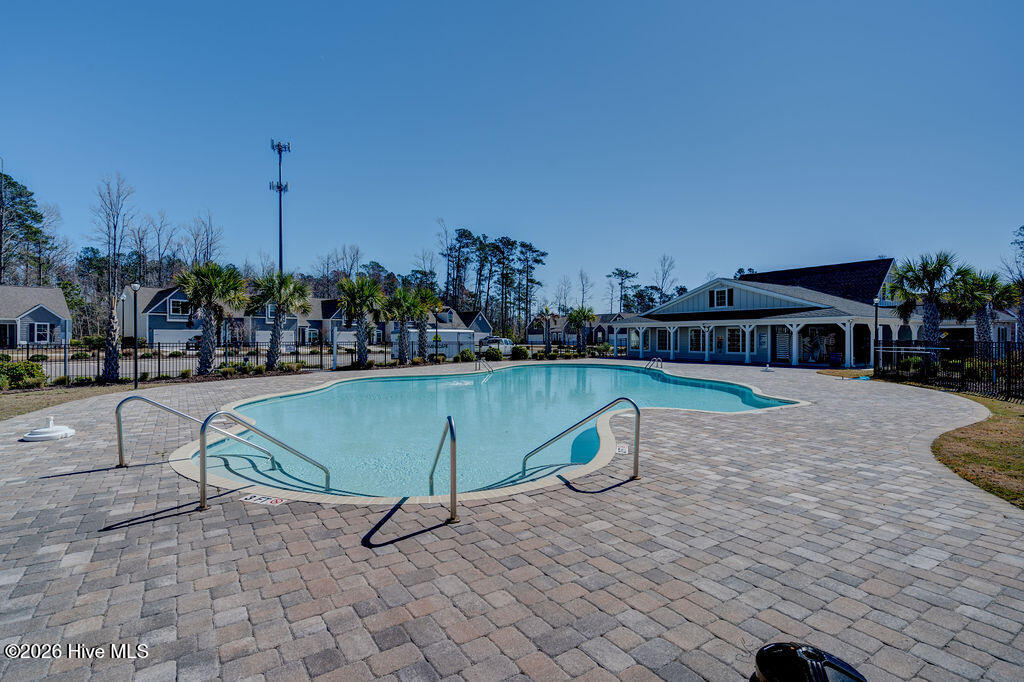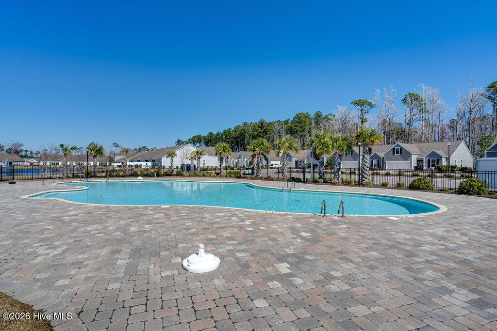 Welcome to your new home, tucked away in one of Leland's sought after communities, Hawkeswater at the River! This beautiful home is all on one level, offering 3 bedrooms and 2 bathrooms, and a flex room. The current owners use the flex room as an office but would also be perfect for a playroom, hobby/craft or reading room! Next you will find the spacious living room with sprawling 9 foot ceilings to be a great gathering space with a fireplace and built in bookshelves. The family cook won't miss a thing because of the home's open concept! The kitchen boasts granite countertops, a ''water drop'' filtration system, pantry, and an island large enough to seat four! The kitchen also has space for a dining table, or perhaps cozy seating to enjoy your morning coffee, overlooking the private yard. With the amount of gorgeous daylight this room receives, any plant enthusiast will be pleased! The primary bedroom is conveniently located off the living room, yet separated from the other bedrooms providing added privacy. The large walk in closet has a stylish sliding barn door. The primary en-suite bath features dual vanities and a spacious walk-in shower. Once you step outside, you'll immediately notice the private, serene fenced backyard. Additionally, just behind the privacy fence is an HOA green space, where you can meet the neighbors! The CPI system will remain, but new owners will need to connect for service. The community has resort style amenities including a sparkling pool, clubhouse, fitness center, and walking trails including a boardwalk leading to a riverfront gazebo. Take advantage of the private community dock with day slips for residents on the Brunswick River. The Belville Riverwalk Park is just a short walk away! You'll enjoy picnic areas, a playground, festivals and gorgeous river views! This community is convenient to the Wilmington Riverwalk, area beaches and so much more! Make your appt to see this home today!