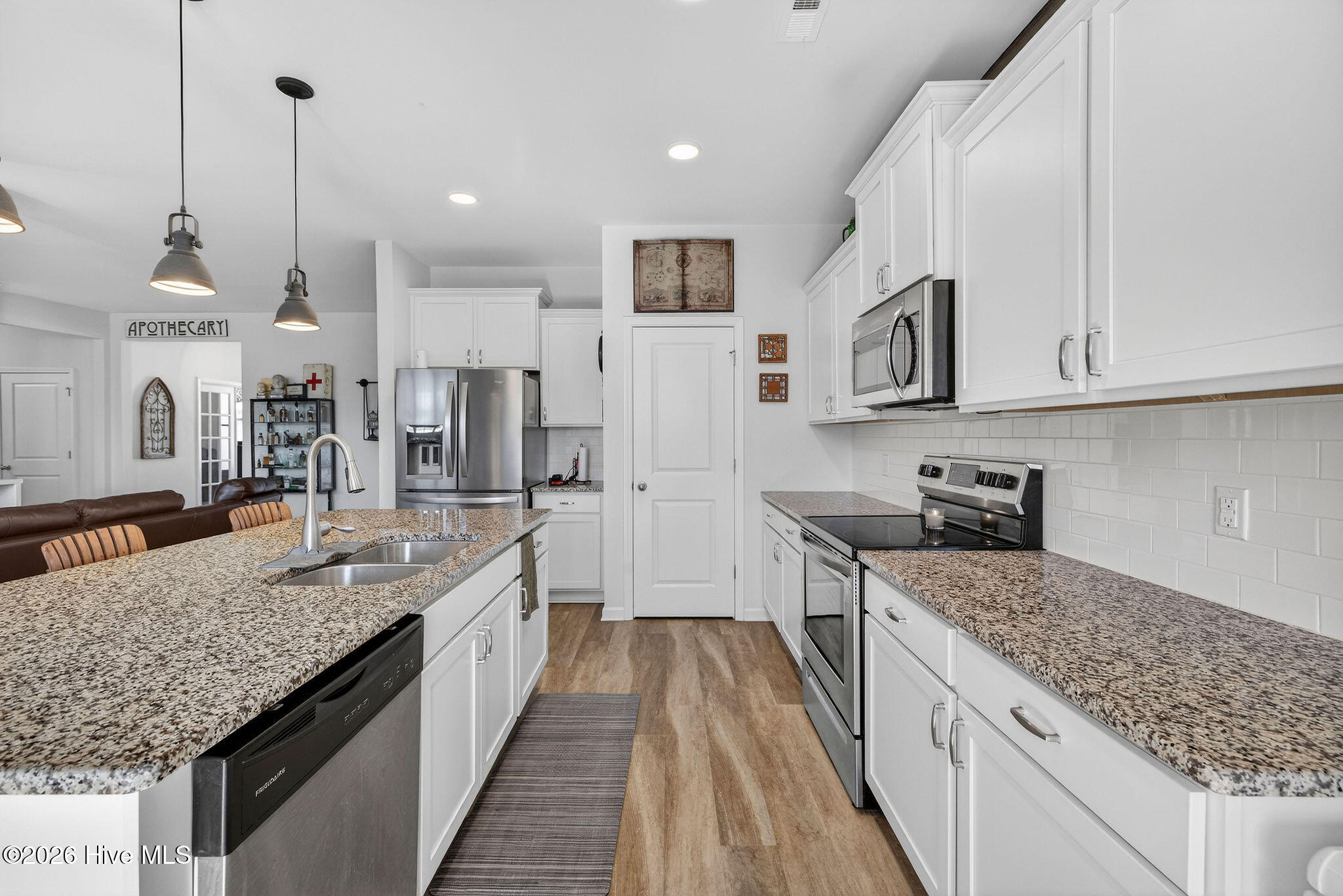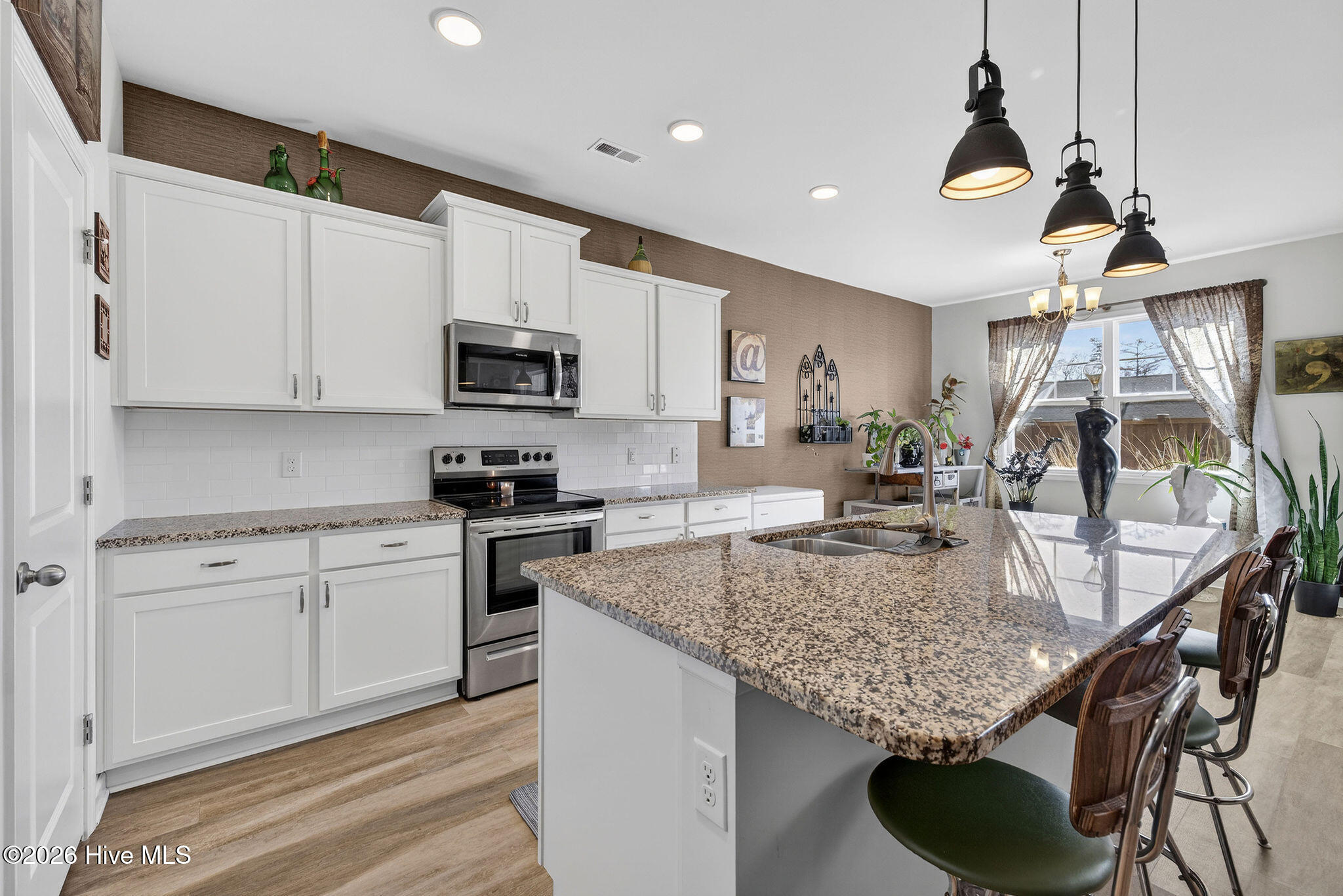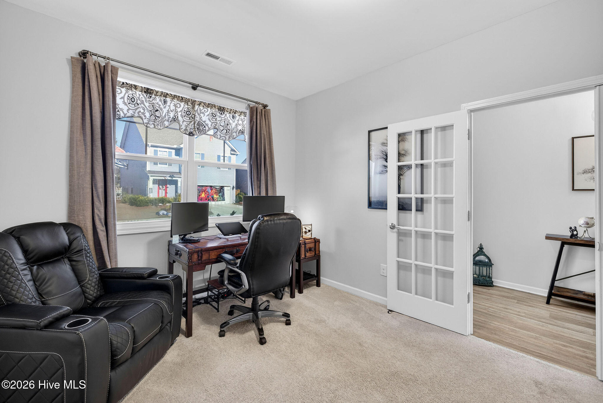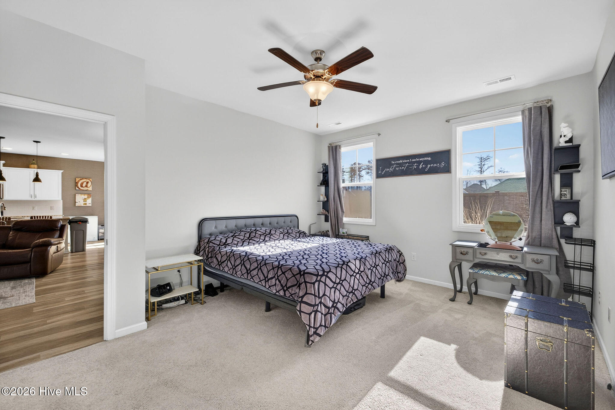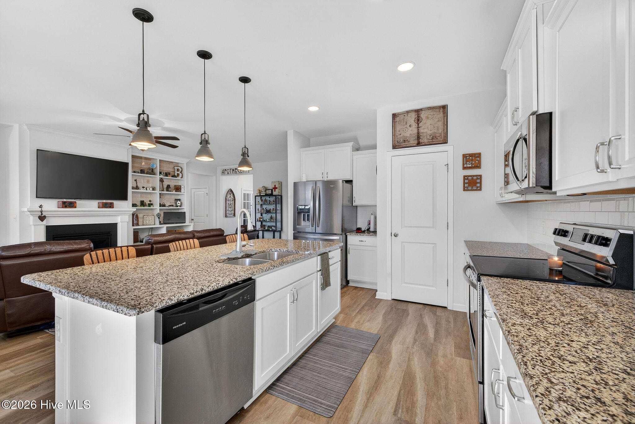 Welcome to your new home, tucked away in one of Leland's sought after communities, Hawkeswater at the River! This beautiful home is all on one level, offering 3 bedrooms and 2 bathrooms, and a flex room. The current owners use the flex room as an office but would also be perfect for a playroom, hobby/craft or reading room! Next you will find the spacious living room with sprawling 9 foot ceilings to be a great gathering space with a fireplace and built in bookshelves. The family cook won't miss a thing because of the home's open concept! The kitchen boasts granite countertops, a ''water drop'' filtration system, pantry, and an island large enough to seat four! The kitchen also has space for a dining table, or perhaps cozy seating to enjoy your morning coffee, overlooking the private yard. With the amount of gorgeous daylight this room receives, any plant enthusiast will be pleased! The primary bedroom is conveniently located off the living room, yet separated from the other bedrooms providing added privacy. The large walk in closet has a stylish sliding barn door. The primary en-suite bath features dual vanities and a spacious walk-in shower. Once you step outside, you'll immediately notice the private, serene fenced backyard. Additionally, just behind the privacy fence is an HOA green space, where you can meet the neighbors! The CPI system will remain, but new owners will need to connect for service. The community has resort style amenities including a sparkling pool, clubhouse, fitness center, and walking trails including a boardwalk leading to a riverfront gazebo. Take advantage of the private community dock with day slips for residents on the Brunswick River. The Belville Riverwalk Park is just a short walk away! You'll enjoy picnic areas, a playground, festivals and gorgeous river views! This community is convenient to the Wilmington Riverwalk, area beaches and so much more! Make your appt to see this home today!