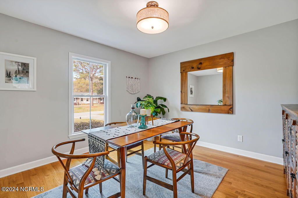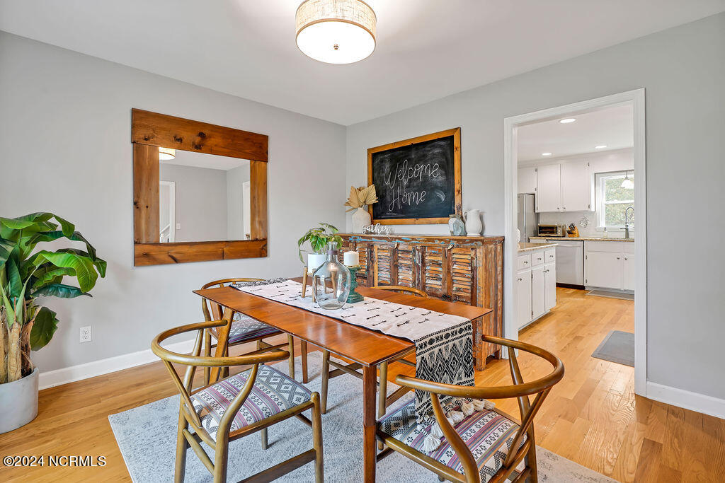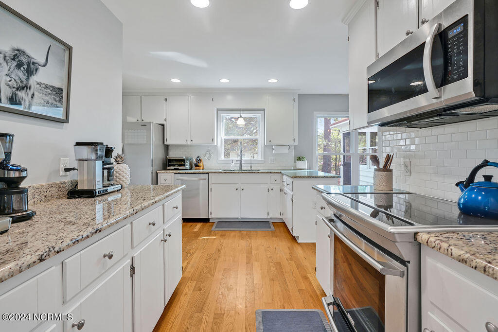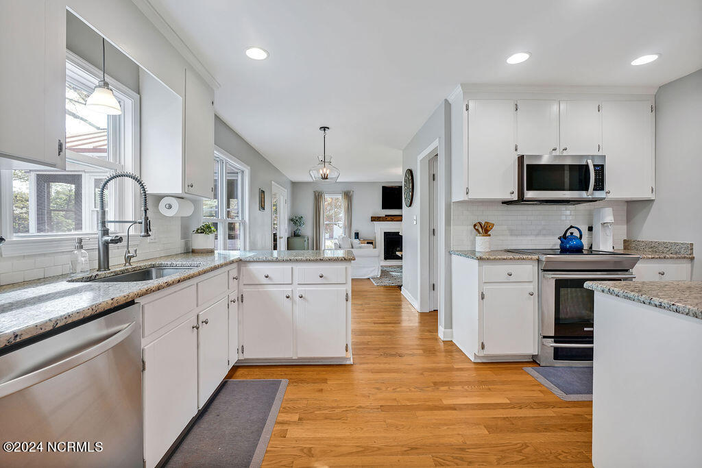 A picturesque home in an ideal corner lot only 15 minutes from Wrightsville Beach. The semi-open floor plan offers a great deal of natural lighting throughout. The kitchen showcases Granite counter tops, an Induction Oven and a walk in Pantry with shelving. Adjacent is a formal dining room as well as a breakfast eating area. Primary Bedroom includes two closets, and the connected Primary tiled Bathroom has a Double Vanity. The sunroom is a perfect spot to watch the sunsrise over the Dogwood and Oak trees in the backyard. The landscaped yard also houses a wired workshop, and a patio area with a firepit. The charming home also has a wood burning Fireplace, new siding and windows, reverse osmosis and an irrigation system on the well.