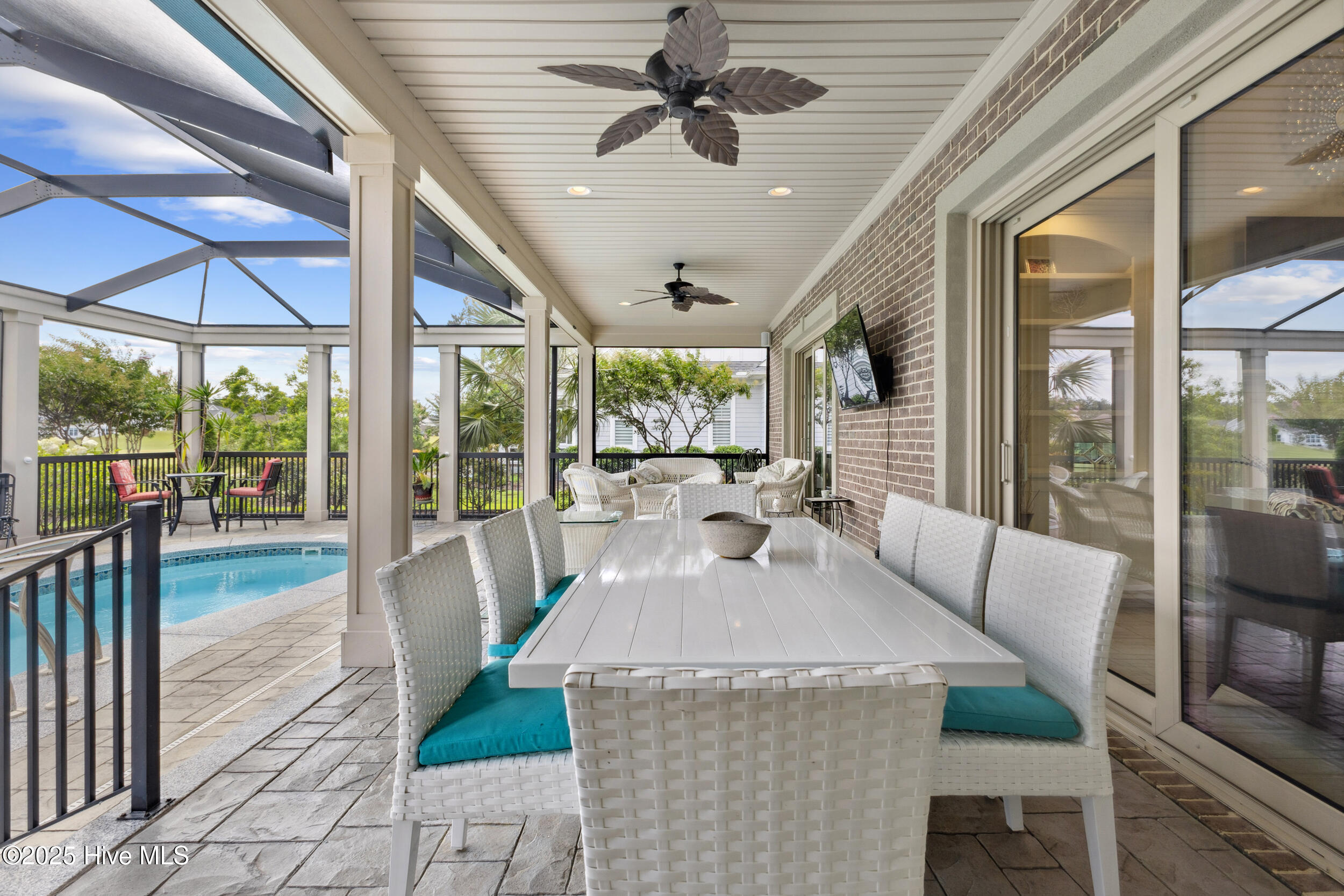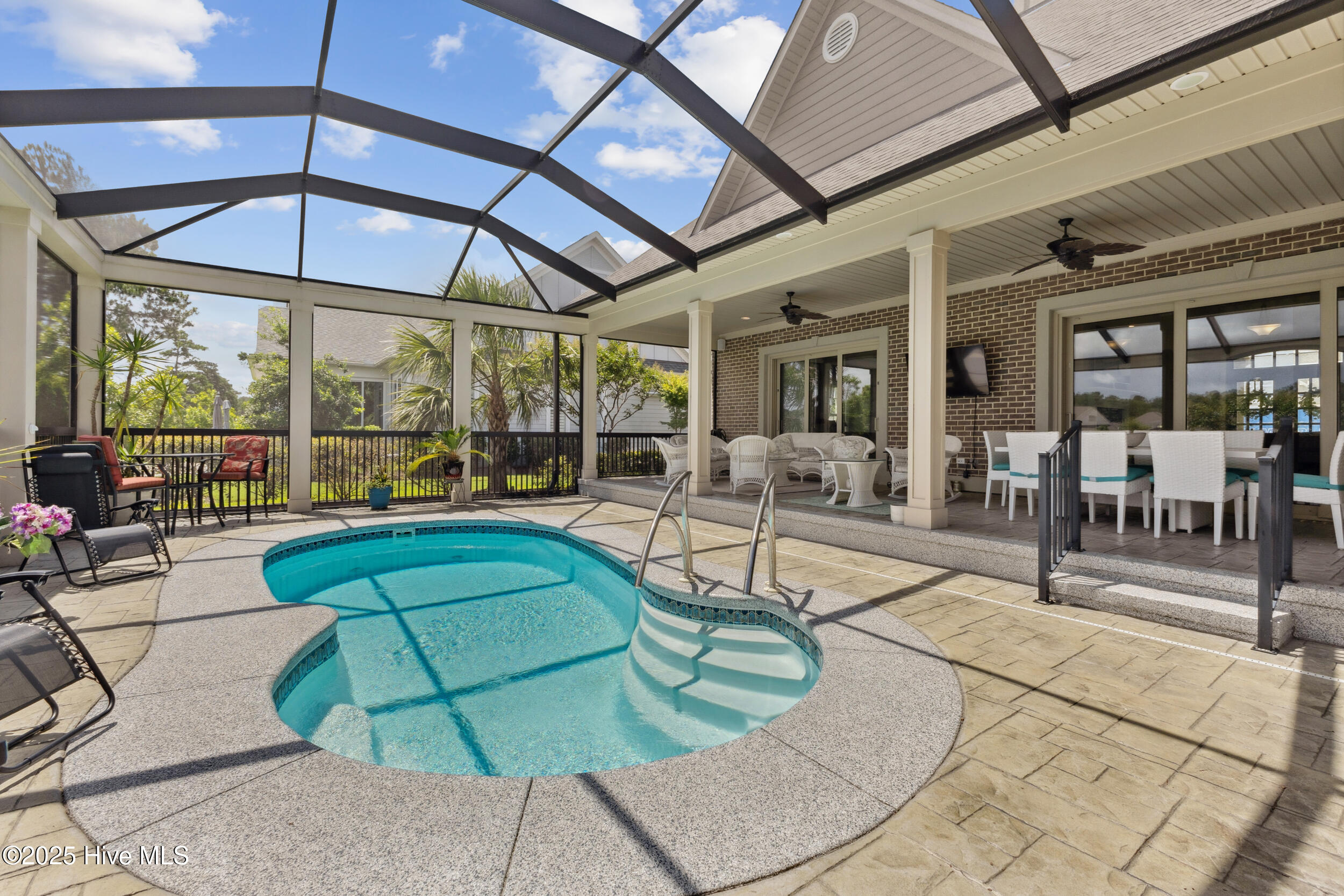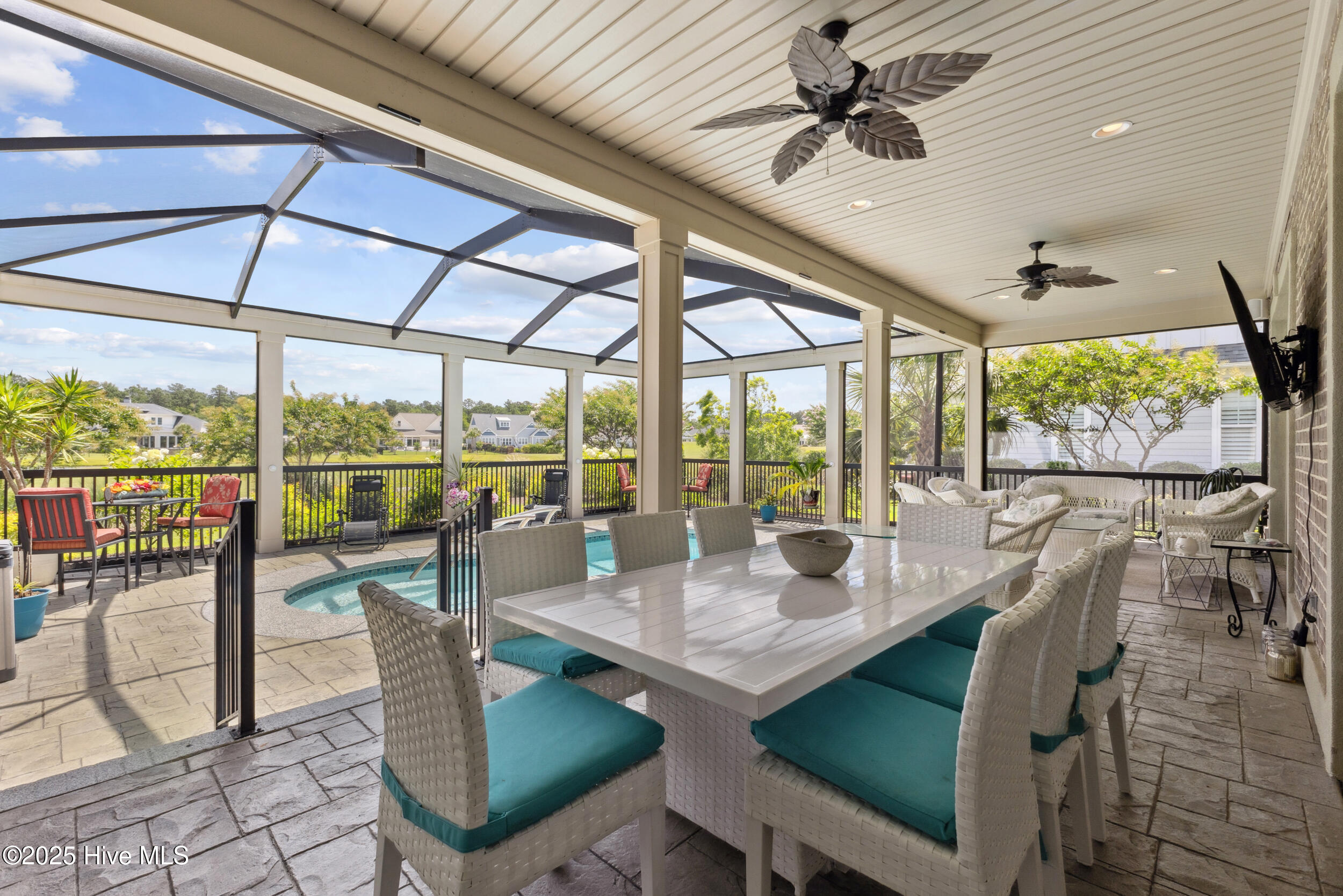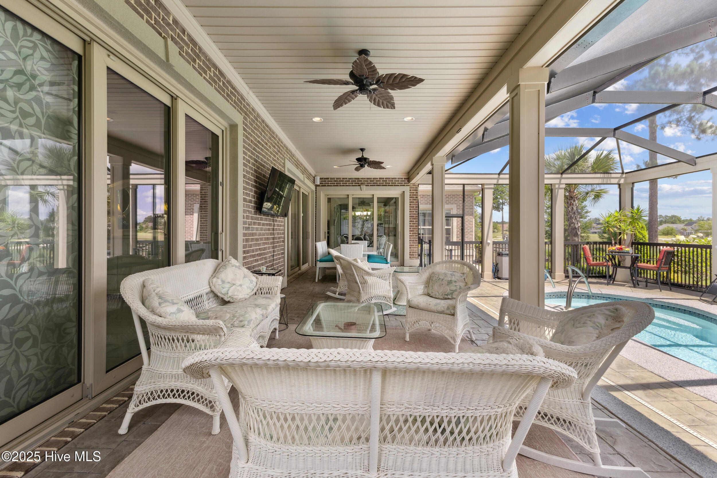 $10,000 BUYER INCENTIVE - USE AS YOU CHOOSE! Enjoy the scenery of the prestigious Cape Fear Golf course, ponds and evening lights through the custom lanai of this stunning home completed in 2019. 3323 square feet of thoughtfully designed living space, including beautiful crown and base molding, 8 foot solid doors, tons of closets, open floor plan with 14 foot soaring ceilings. Decorate as you wish with elegant neutral finishes including large windows to create a full golf course view. White ceramic tile throughout main living space. The chef's kitchen features quartz countertops, upgraded stainless steel appliances, gas cooktop, three pantry closets, and a wet bar with wine fridge --ideal for hosting. The spacious media room, adorned with a coffered ceiling offers the flexibility of a private guest suite or mother-in-law space with its own full bath. The master bath is elegant and spacious and also has quartz countertops and beautiful columns. A converted storage room can be used as office space on the first floor, while the upstairs bonus room (or 5th bedroom) which includes a private bath and closet. You will also appreciate the massive floored attic, providing abundant storage. The house is adorned with tropical landscaping and illuminated lighting all around including the screened custom stamped concrete lanai for pest free enjoyment daytime or evening. Step outside to a private tropical retreat with a saltwater pool. The backyard also includes a second patio outside the lanai with a built in gas grill hookup- perfect for outdoor living. Enjoy world-class Brunswick Forest amenities including an indoor and three outdoor pools, a fitness center, tennis, pickle-ball, kayaking, and access to the second hole at Cape Fear National Golf Course. Included features are a washer, dryer, kitchen refrigerator, garage freezer, SIX flat-screen TVs, surround sound sonos system, all pool equipment, and security cameras. Most furnishings are negotiable. SELLER MOTIVATED