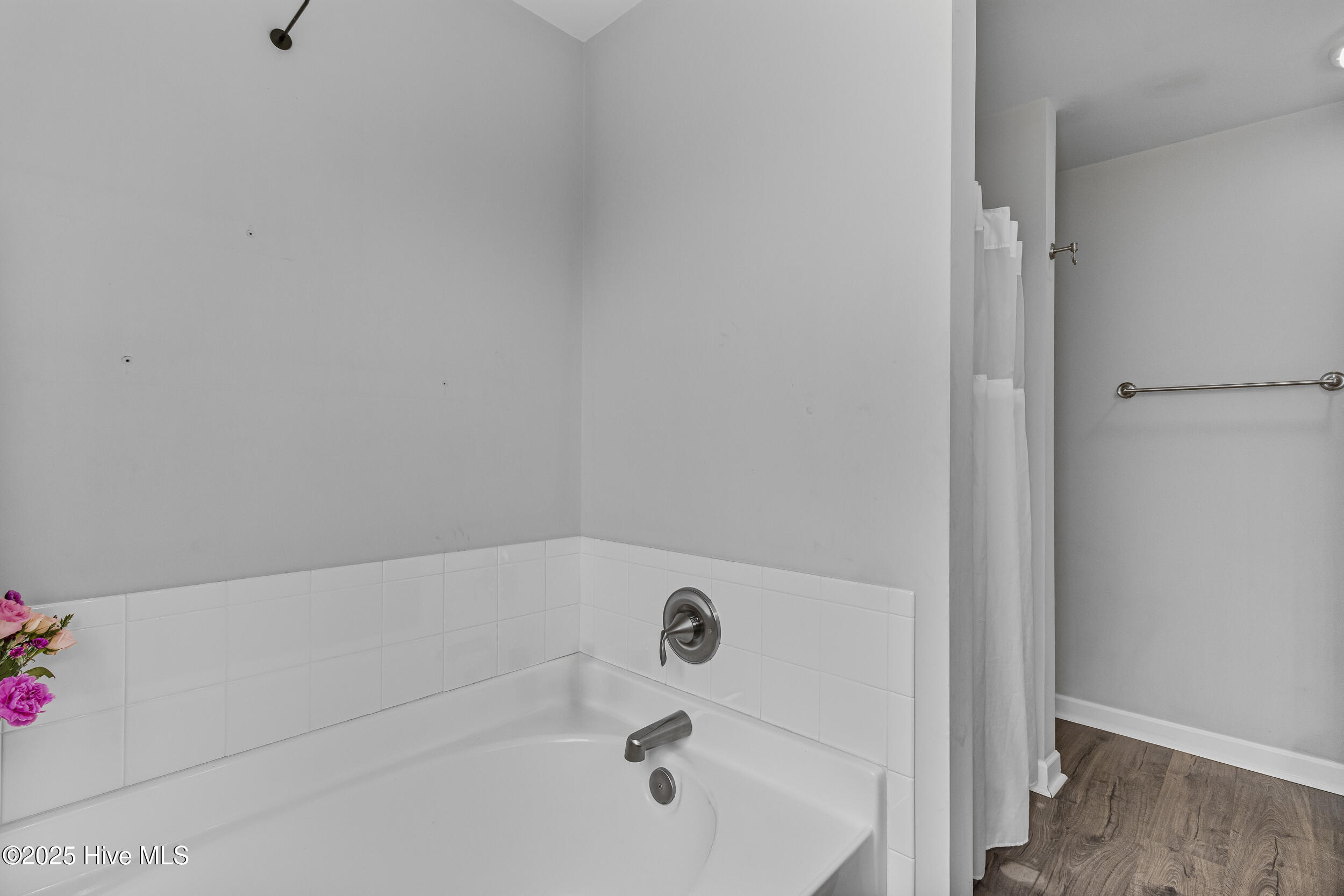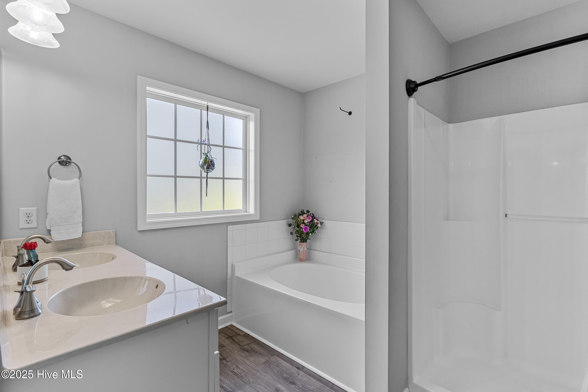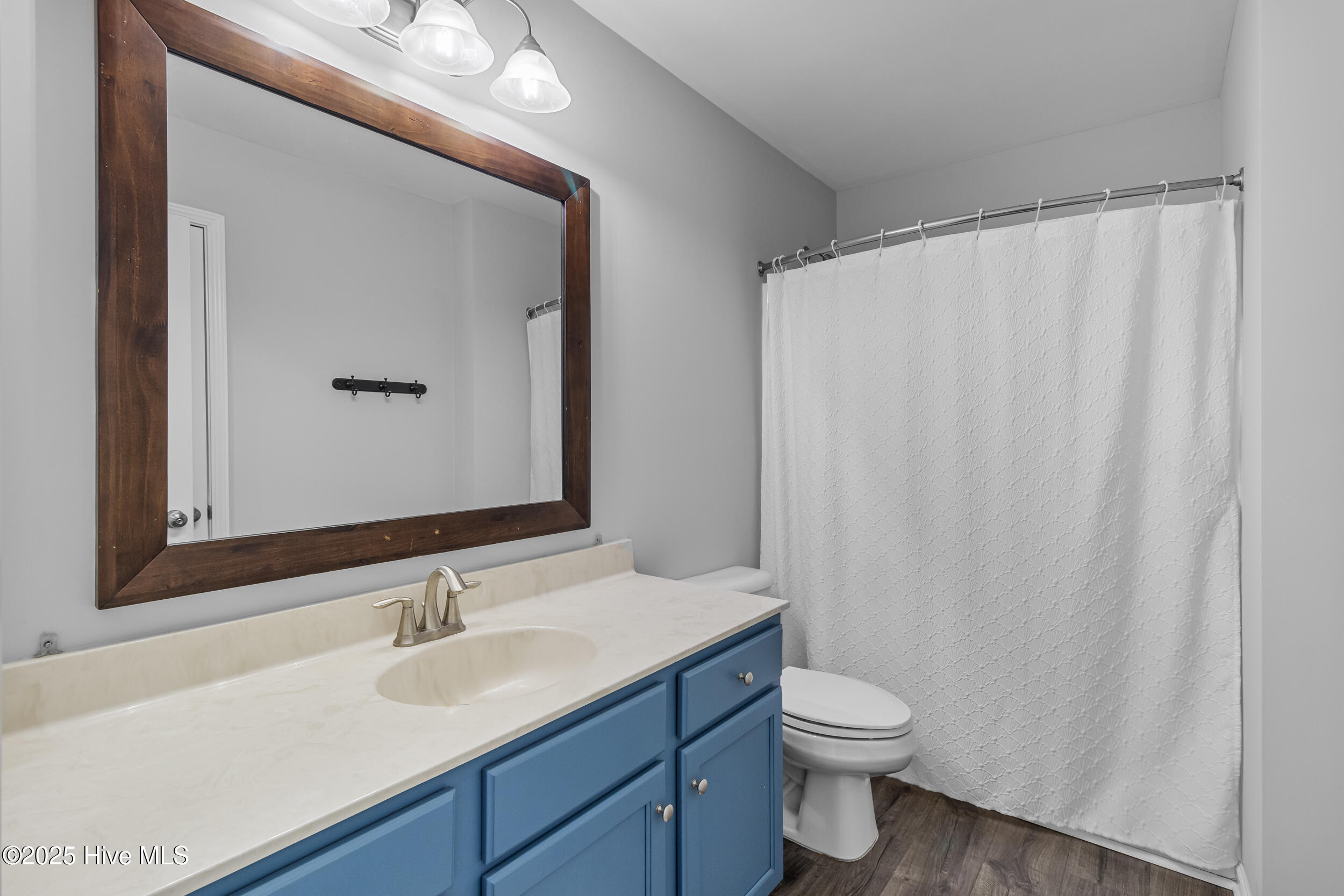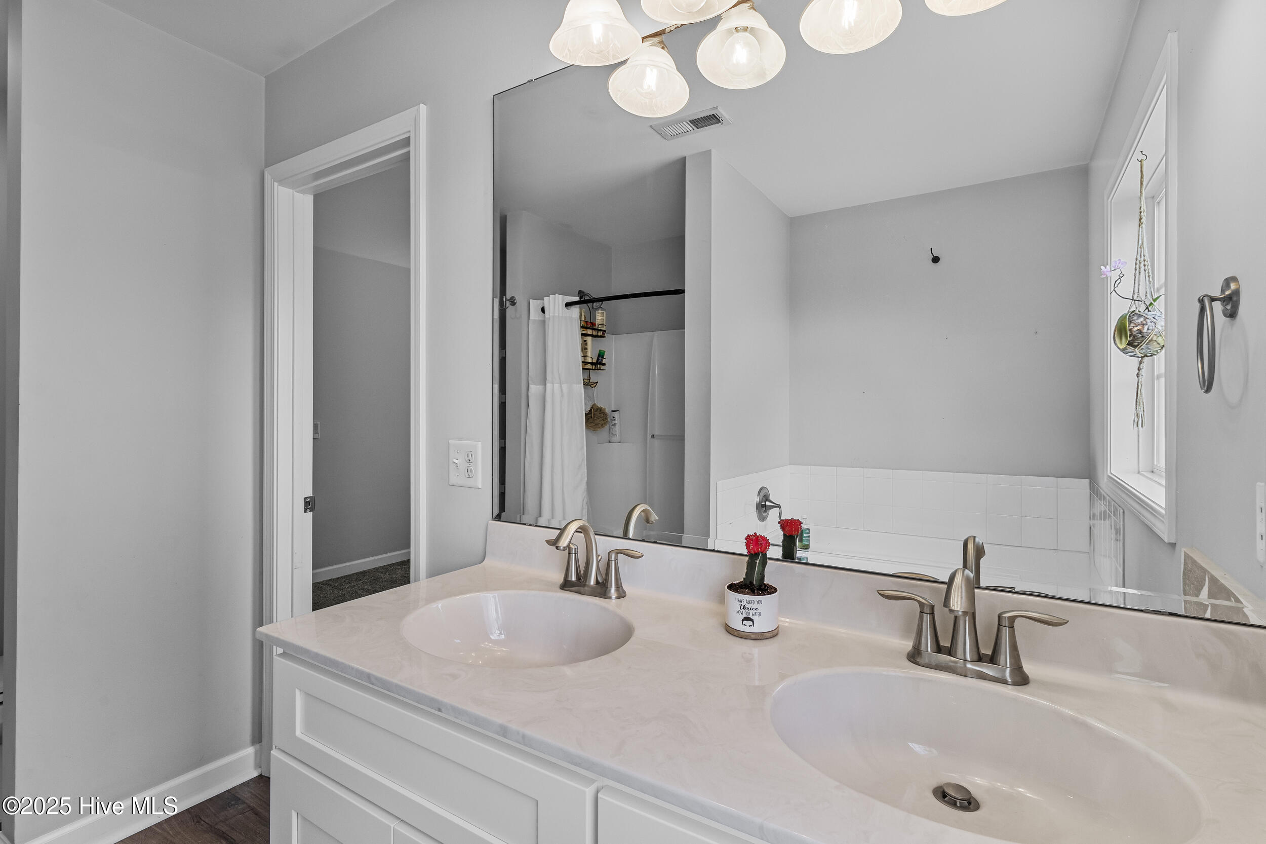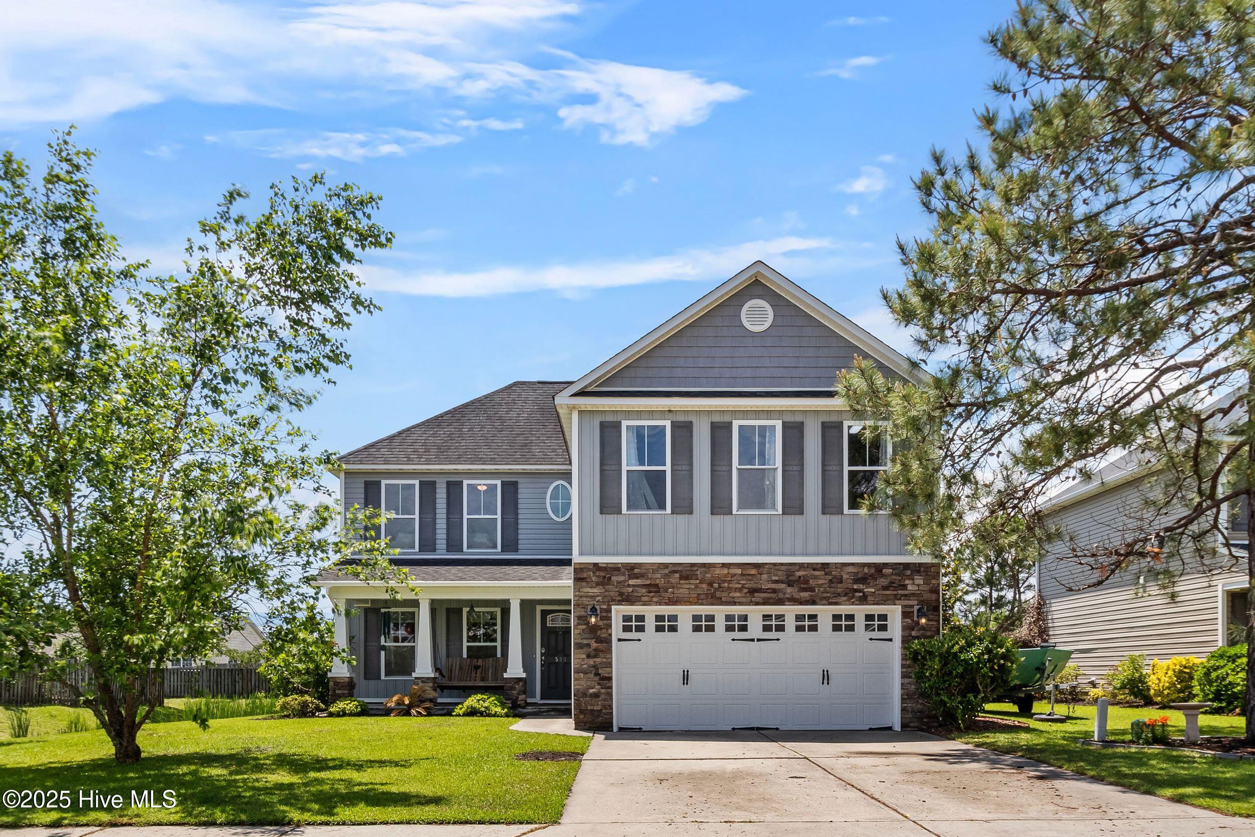 Welcome to this beautifully updated 3 bedroom, 2.5 bathroom home with nearly 2,000 sq ft of living space, perfectly situated in Copperfield at West Bay Estates. Located in the heart of Ogden, this home offers quick access to Mayfaire Town Center, I-40, the Hampstead Bypass, and Wrightsville Beach--making it ideal for both everyday living and weekend adventures. A charming covered front porch with a swing invites you in. Inside, you'll find a bright and airy open-concept floor plan with the primary suite conveniently located on the first floor. The living room is filled with natural light, flowing seamlessly into the stylish, updated kitchen featuring two-tone cabinetry, quartz countertops, a white subway tile backsplash, and stainless steel appliances. Just off the kitchen, the dining area opens through glass doors to a pergola-shaded patio. The first-floor primary suite boasts a large walk-in closet and a crisp and clean ensuite bathroom complete with dual vanities, a soaking tub, and a separate walk-in shower. Upstairs, an open loft provides flexible bonus space--ideal for a home office, playroom, or fitness area. Two additional bedrooms, a full bathroom, and a laundry room complete the upper level. The fully fenced backyard offers privacy and includes a storage shed for added convenience. With its thoughtful layout, stylish updates, and unbeatable location, this home checks all the boxes.