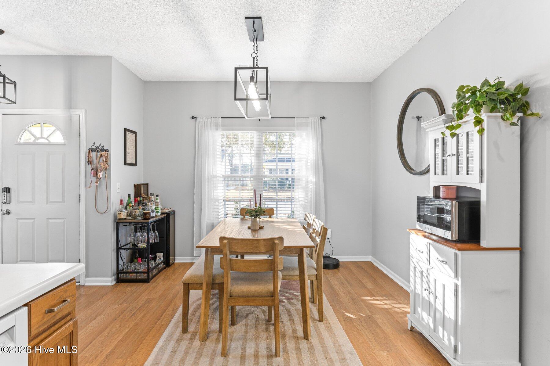 Tucked just off the main road in Farrington Farms, this single-story home sits on a quiet street that ends in a cul-de-sac, making it peaceful, walkable, and easy to love. Sidewalks wind through the neighborhood and lead to Ogden Park and a large pond with a walking trail off Sun Coast Drive, perfect for morning strolls, dog walks, or afternoons at the playground. At 1,119 square feet, this 2-bedroom, 2-bath home makes smart use of every inch. A rocking-chair front porch sets the tone, opening into a bright, airy living room with an easy flow into the kitchen and dining area. The one-car garage connects directly off the kitchen and offers extra storage. Just off the main living space, the laundry room is equipped with a washer and dryer for added convenience. The primary bedroom is generously sized with a walk-in closet and private bath, while the second bedroom features sliding glass doors that open to a covered patio, perfect for a home office, guest room, or flex space. A second full bath and a fully fenced backyard round out the layout. The location checks all the boxes: close to shopping and dining at Mayfaire, quick access to the new Hampstead Bypass and I-40, and convenient to just about everything. Whether you're looking for a first home, a low-maintenance second home, or a solid investment, this one fits the bill without trying too hard.