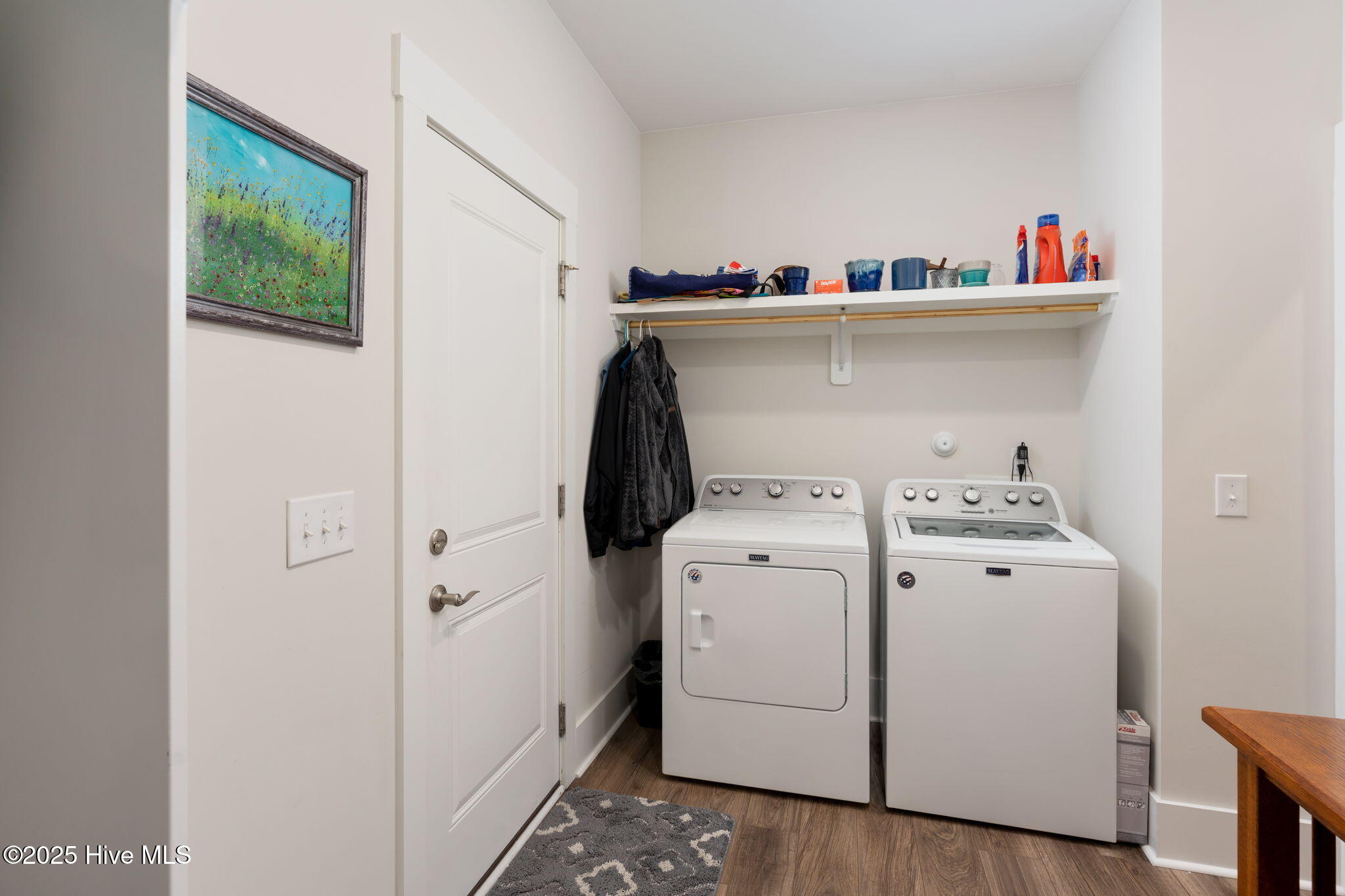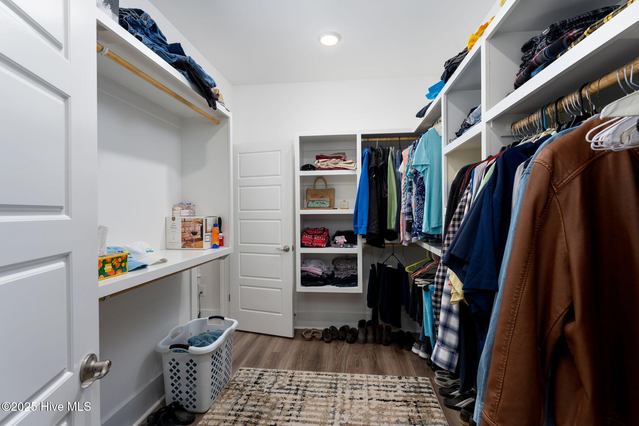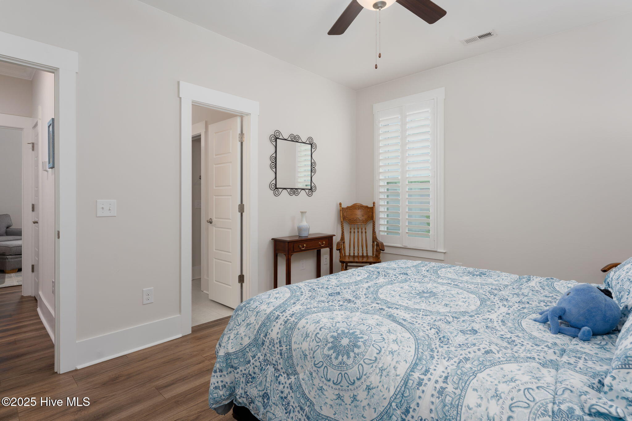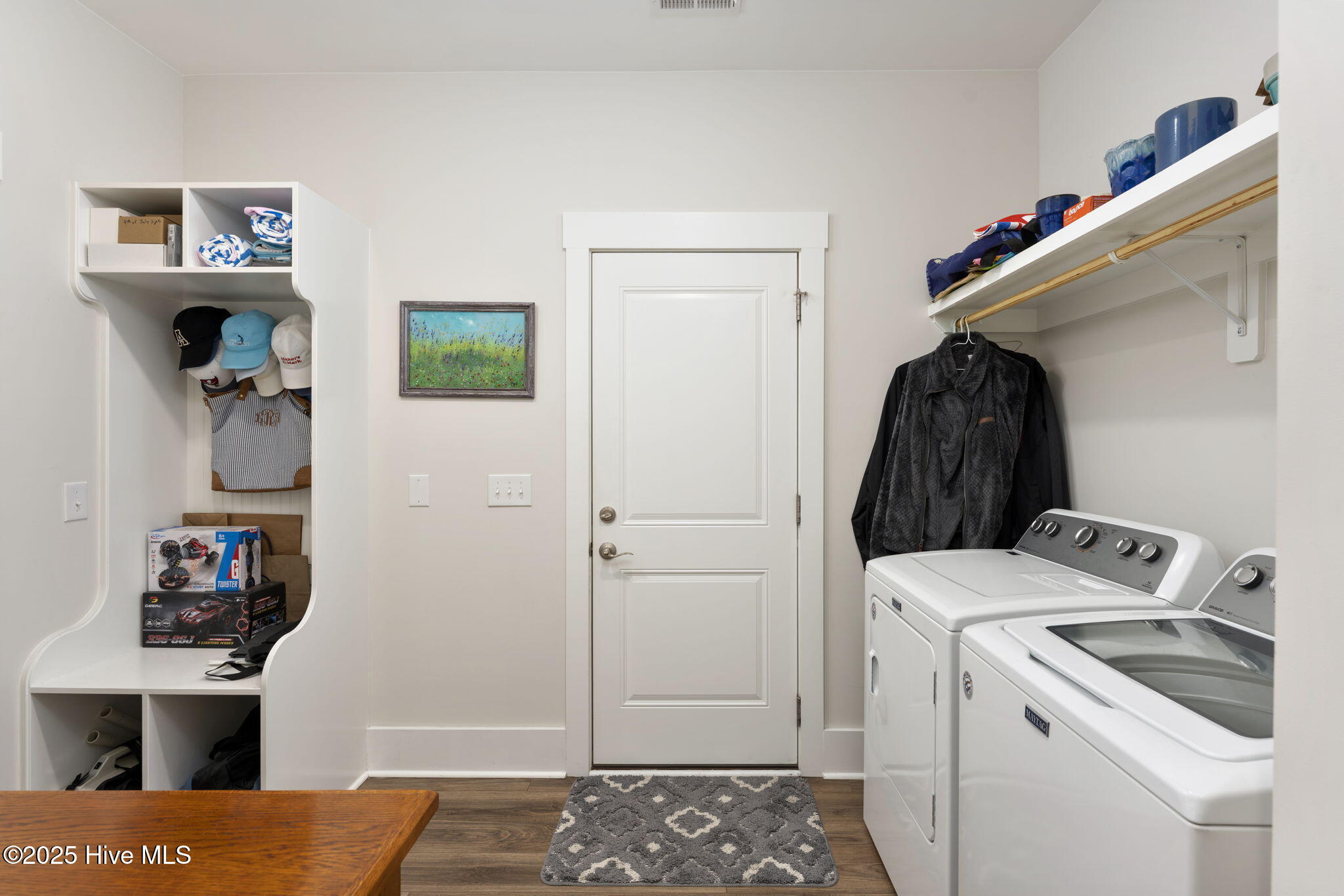 The thoughtful layout continues with three spacious bedrooms and two and a half baths. Retreat to the primary suite, where the en suite awaits. Enjoy a large tiled shower, private water closet, and a generous walk-in closet outfitted with custom white wood shelving. Just steps away, the laundry room features a built-in bench with hooks and a dedicated linen closet--adding both function and flair to your daily routine.