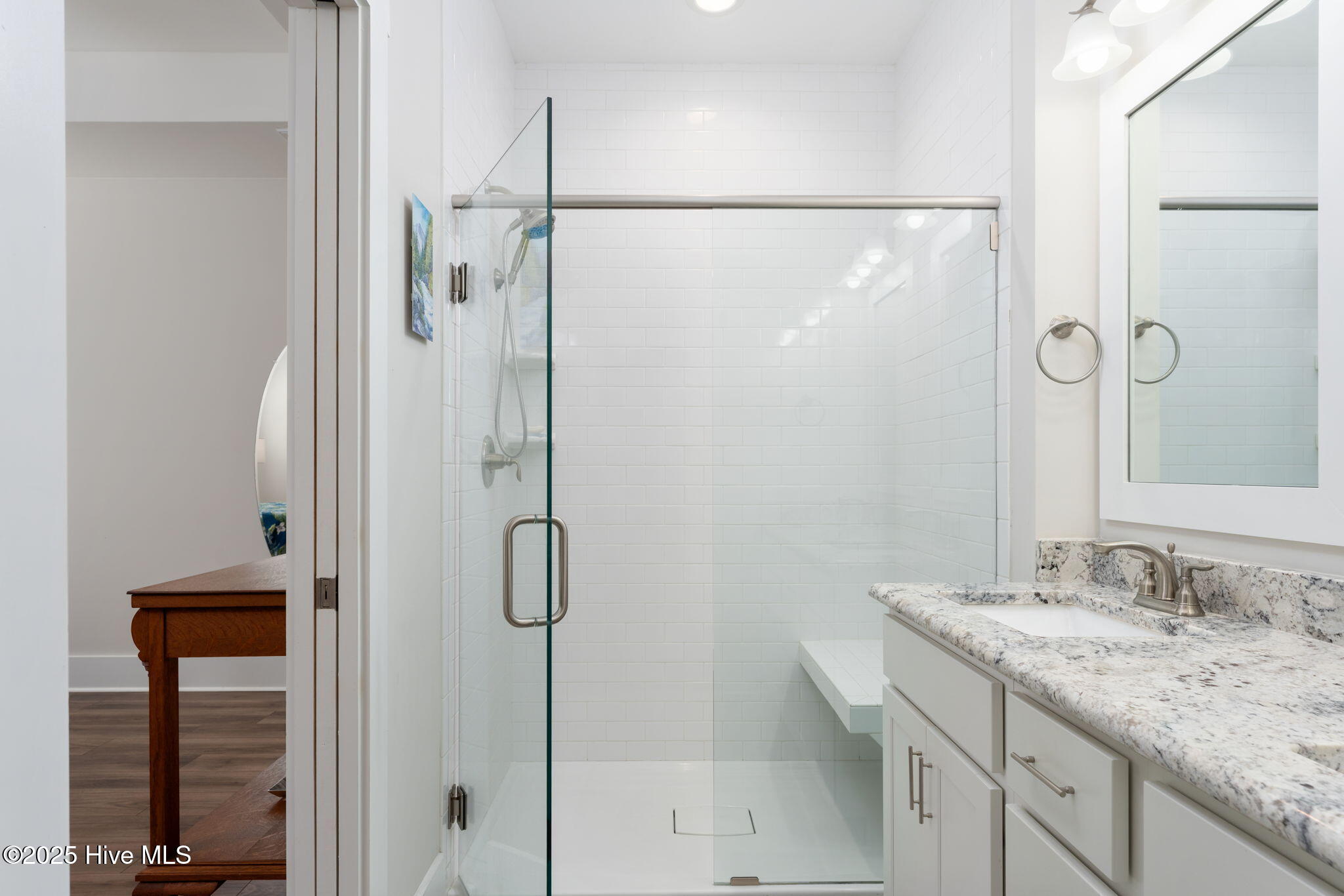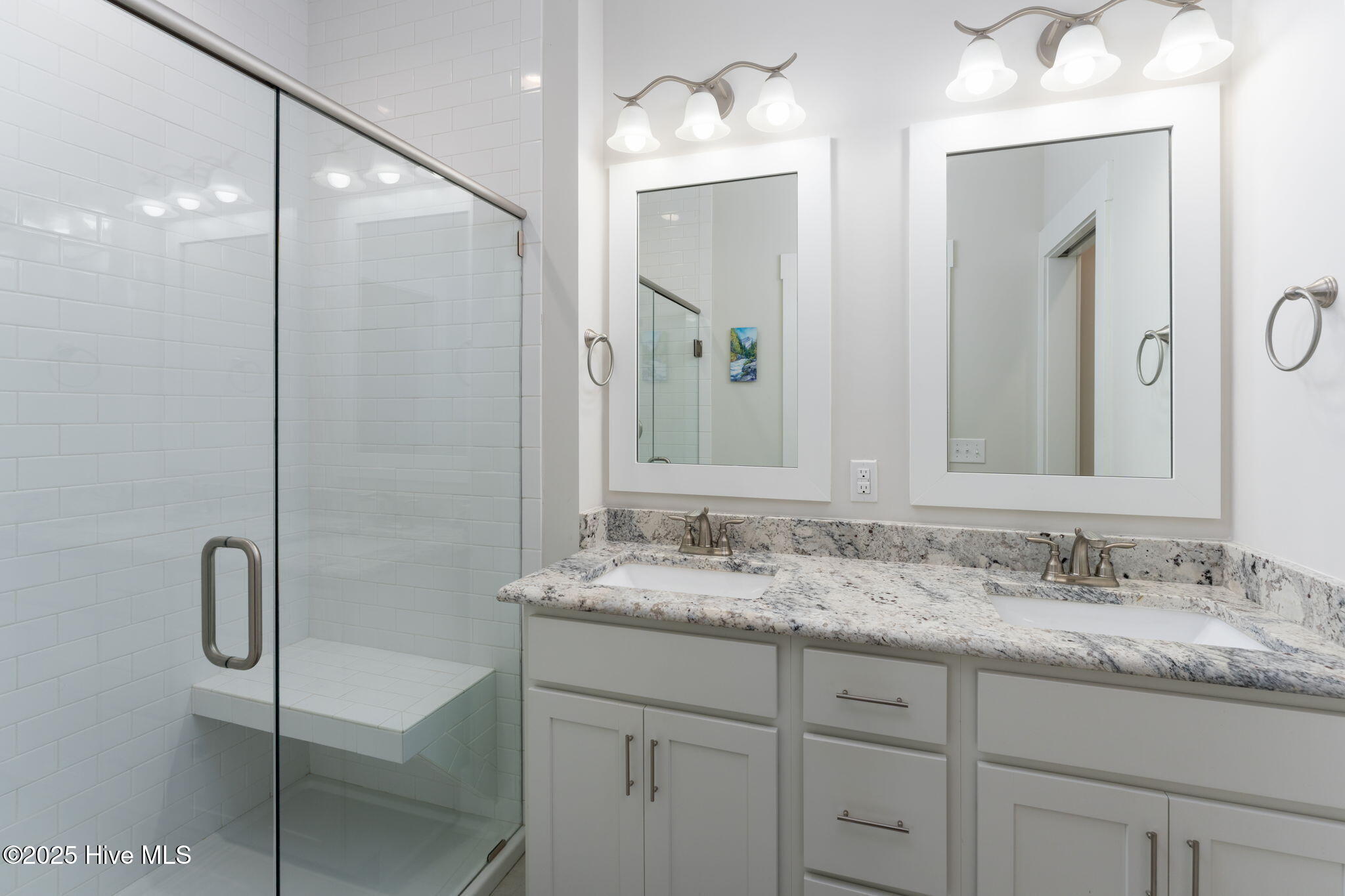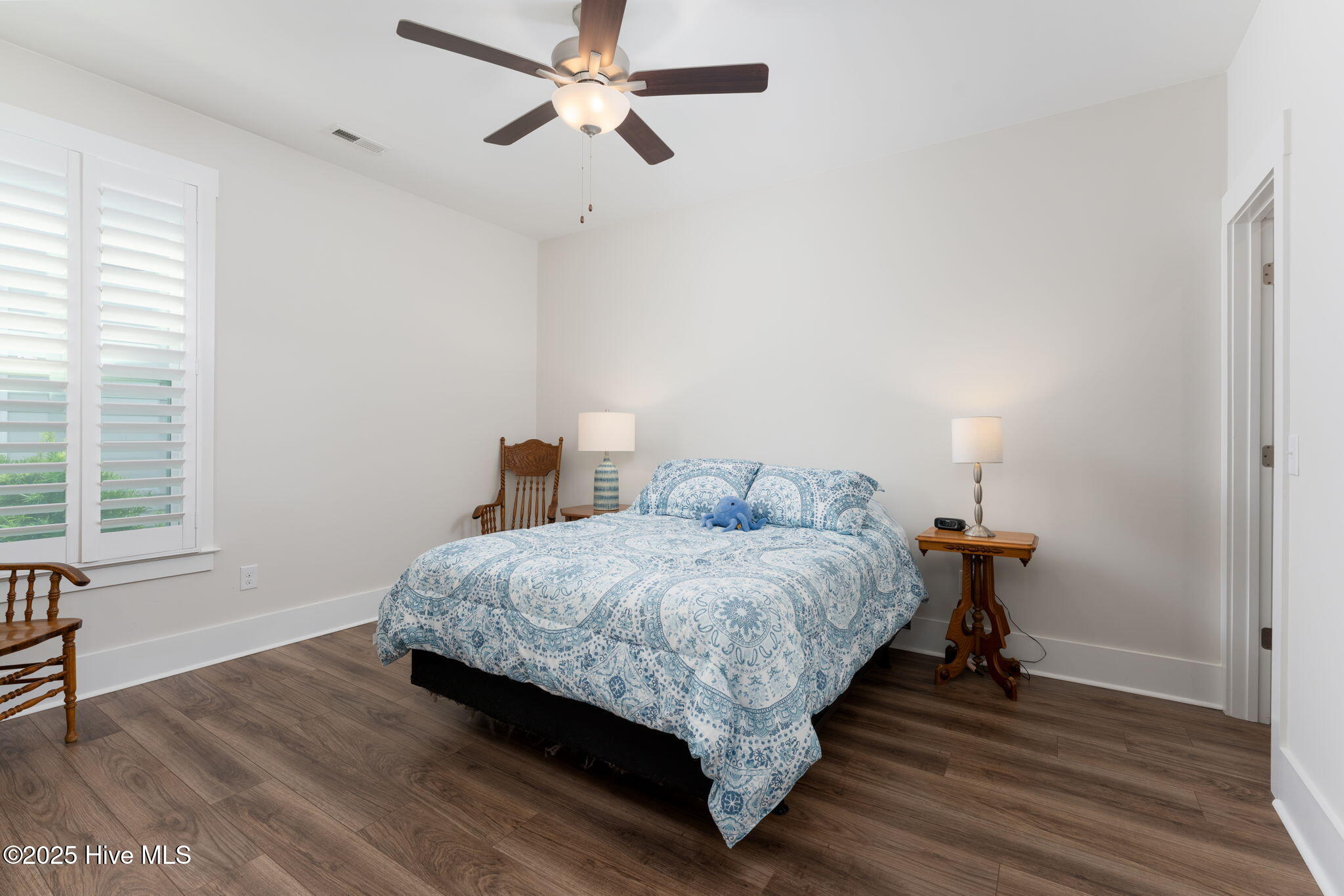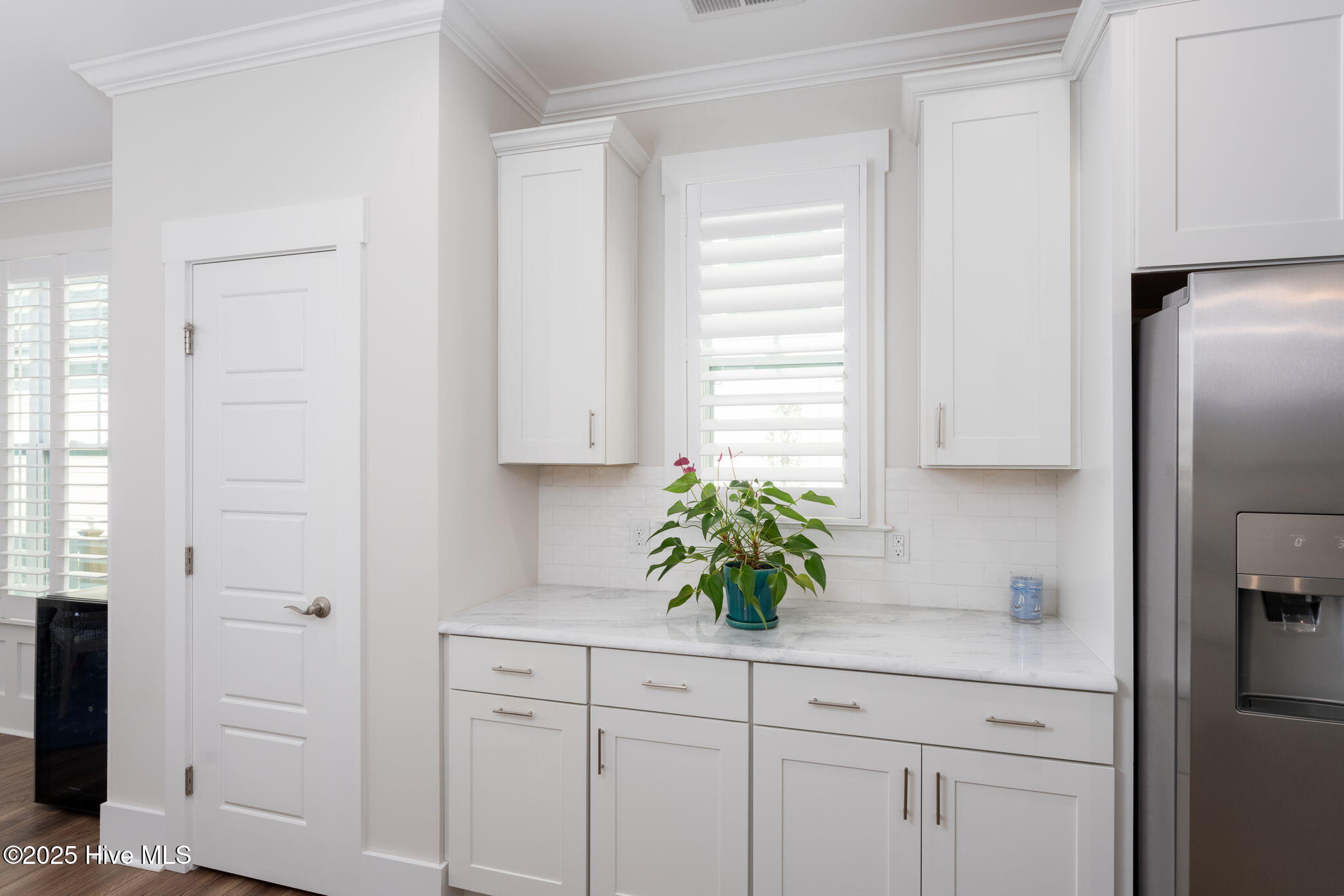 The thoughtful layout continues with three spacious bedrooms and two and a half baths. Retreat to the primary suite, where the en suite awaits. Enjoy a large tiled shower, private water closet, and a generous walk-in closet outfitted with custom white wood shelving. Just steps away, the laundry room features a built-in bench with hooks and a dedicated linen closet--adding both function and flair to your daily routine.