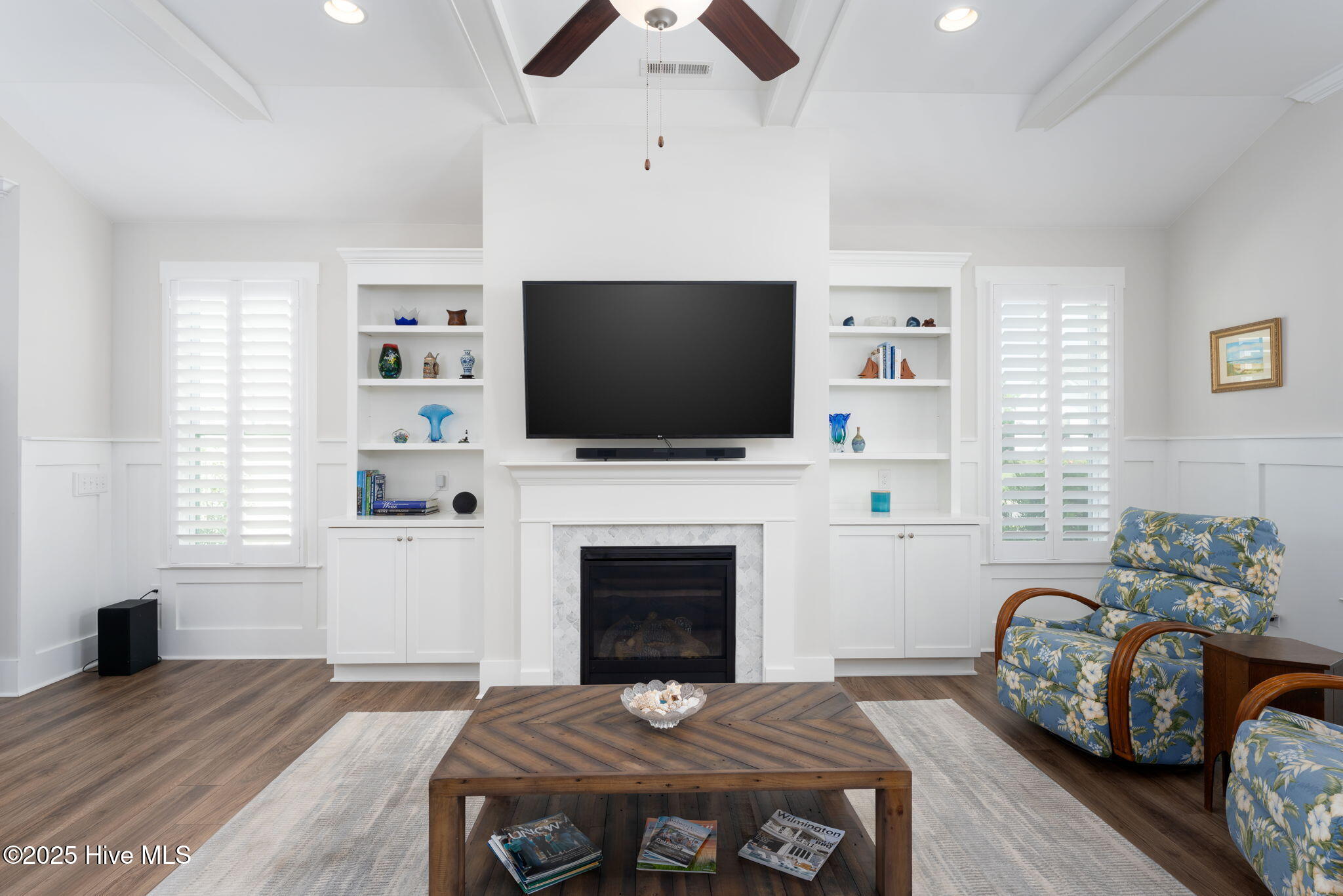 The heart of the home is the expansive Great Room, where soaring 10-foot ceilings are crowned with exposed beams that exude a cozy yet refined cottage ambiance. Custom built-ins flank the elegant fireplace, creating the perfect gathering space on cooler evenings.