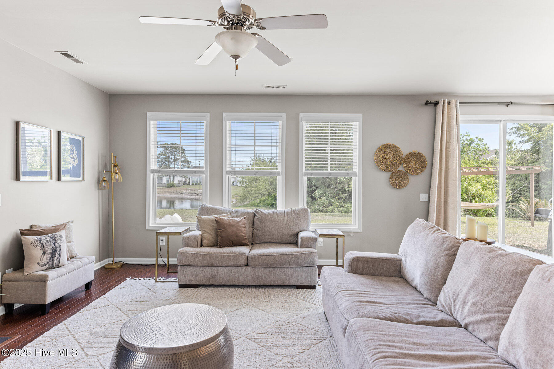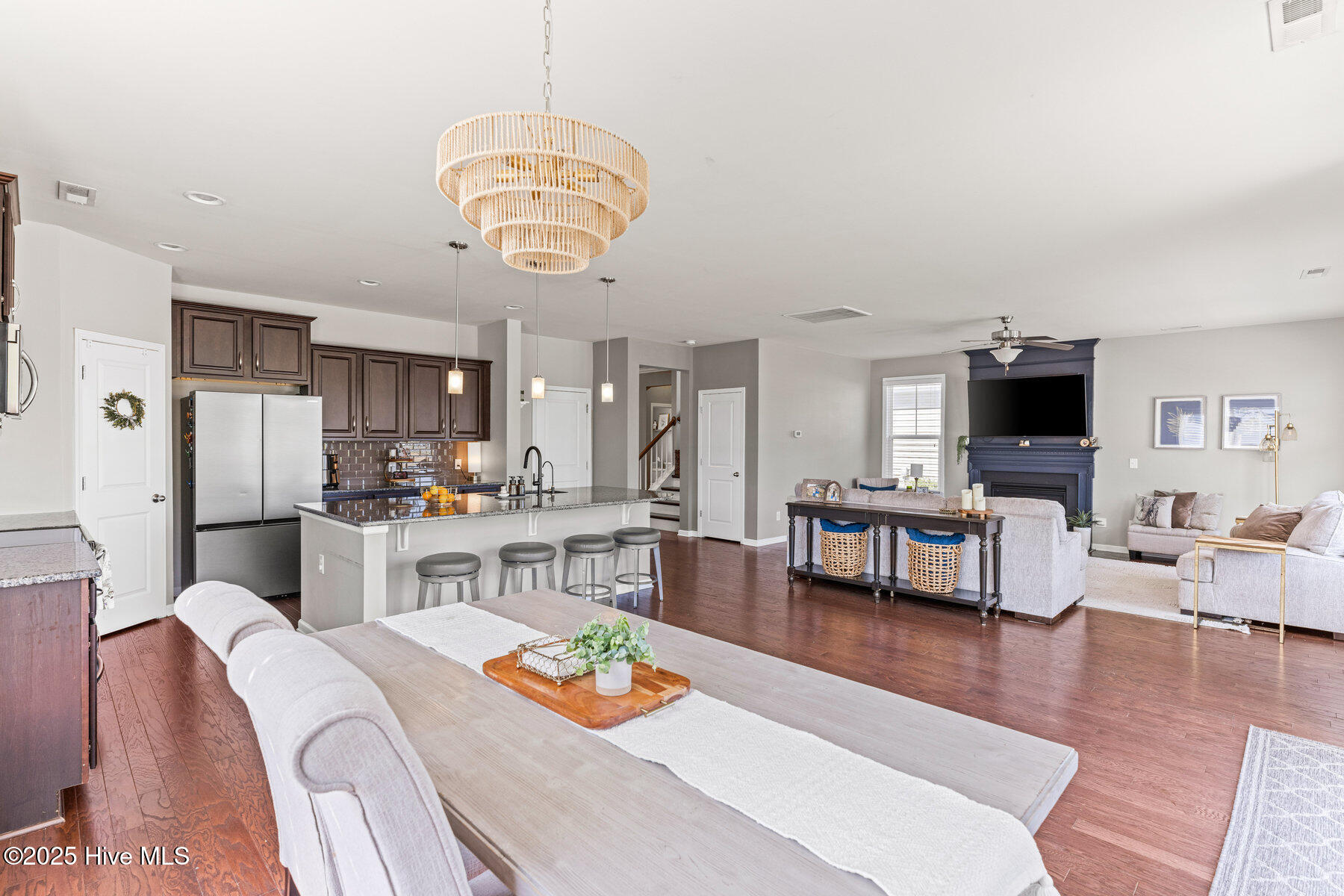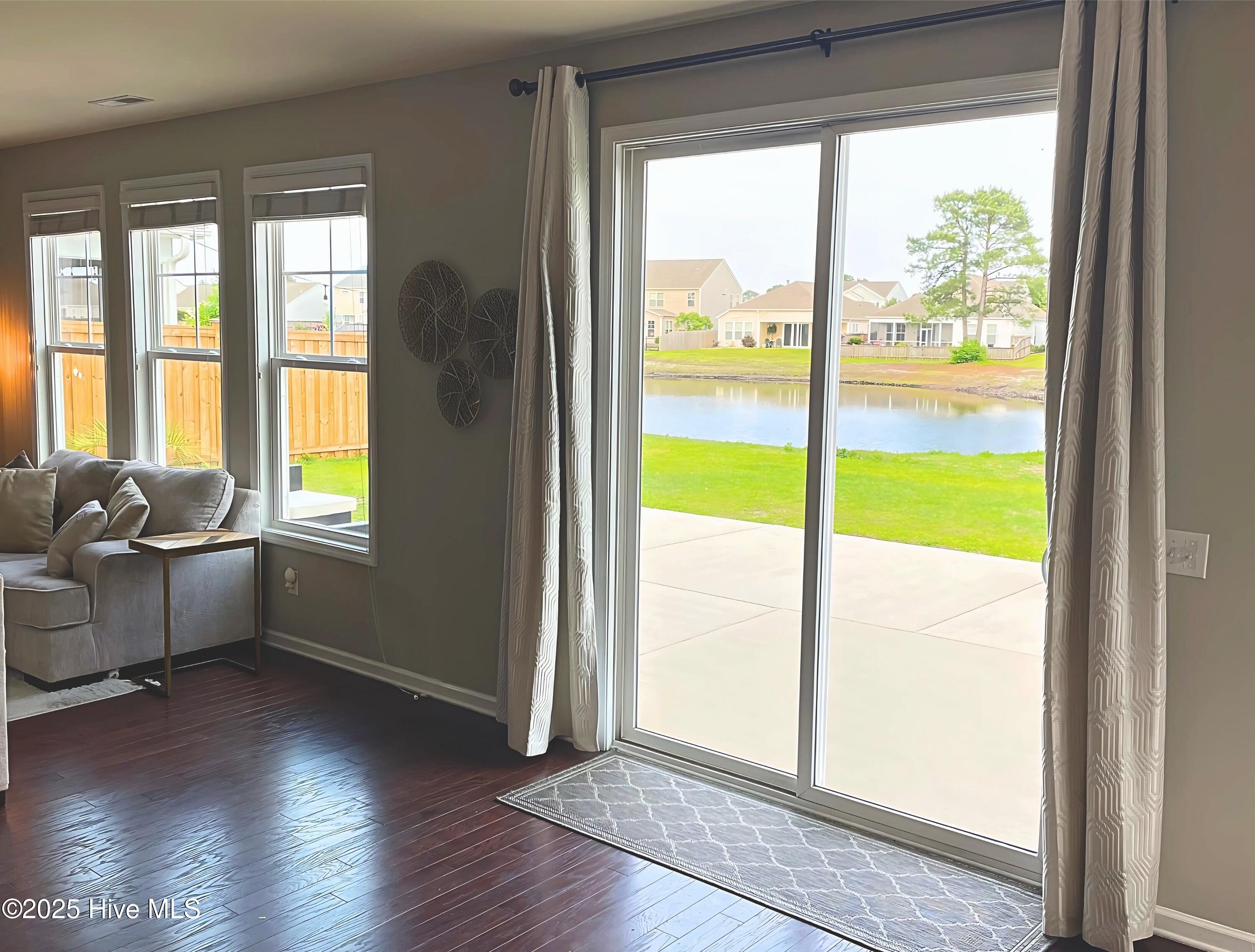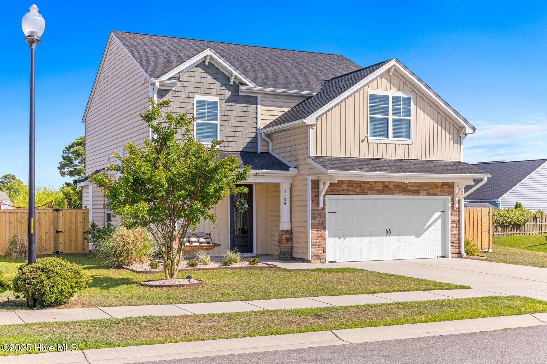 Located in the heart of Ogden, just minutes from Wrightsville Beach, I-40, UNCW, and all the shopping and dining you need, this meticulously maintained two-story home in the Reserve at West Bay is sure to impress. With just over 2,400 square feet, this home offers 4 bedrooms, 2.5 bathrooms, and an ideal floor plan with the main living areas located on the first floor, and all bedrooms privately situated upstairs. A welcoming front porch, complete with a classic porch swing, sets the tone. Inside, natural light fills the main living area thanks to an abundance of windows, highlighting the hardwood floors and open-concept layout. The living room centers around a gas-log fireplace with a sleek black surround, creating a modern feel. The kitchen features an oversized island with seating, granite countertops, espresso cabinetry, stainless steel appliances, and a timeless tile backsplash. It opens seamlessly to the dining space and living room, making it easy to gather and entertain. Upstairs, the spacious primary suite includes tray ceilings, a walk-in closet, and a bonus space ideal for a home office, reading nook, or nursery. The en-suite bathroom features double vanities, a walk-in shower, and a separate soaking tub. Three additional bedrooms, a full bathroom, and an upstairs laundry room finish off the second floor. Step outside to enjoy a large back patio overlooking the pond. Privacy fencing has been installed along the front and sides of the yard, while the rear remains open to take full advantage of the water view. New roof installed in 2024!!!