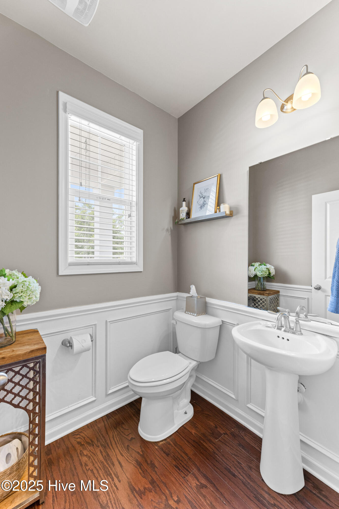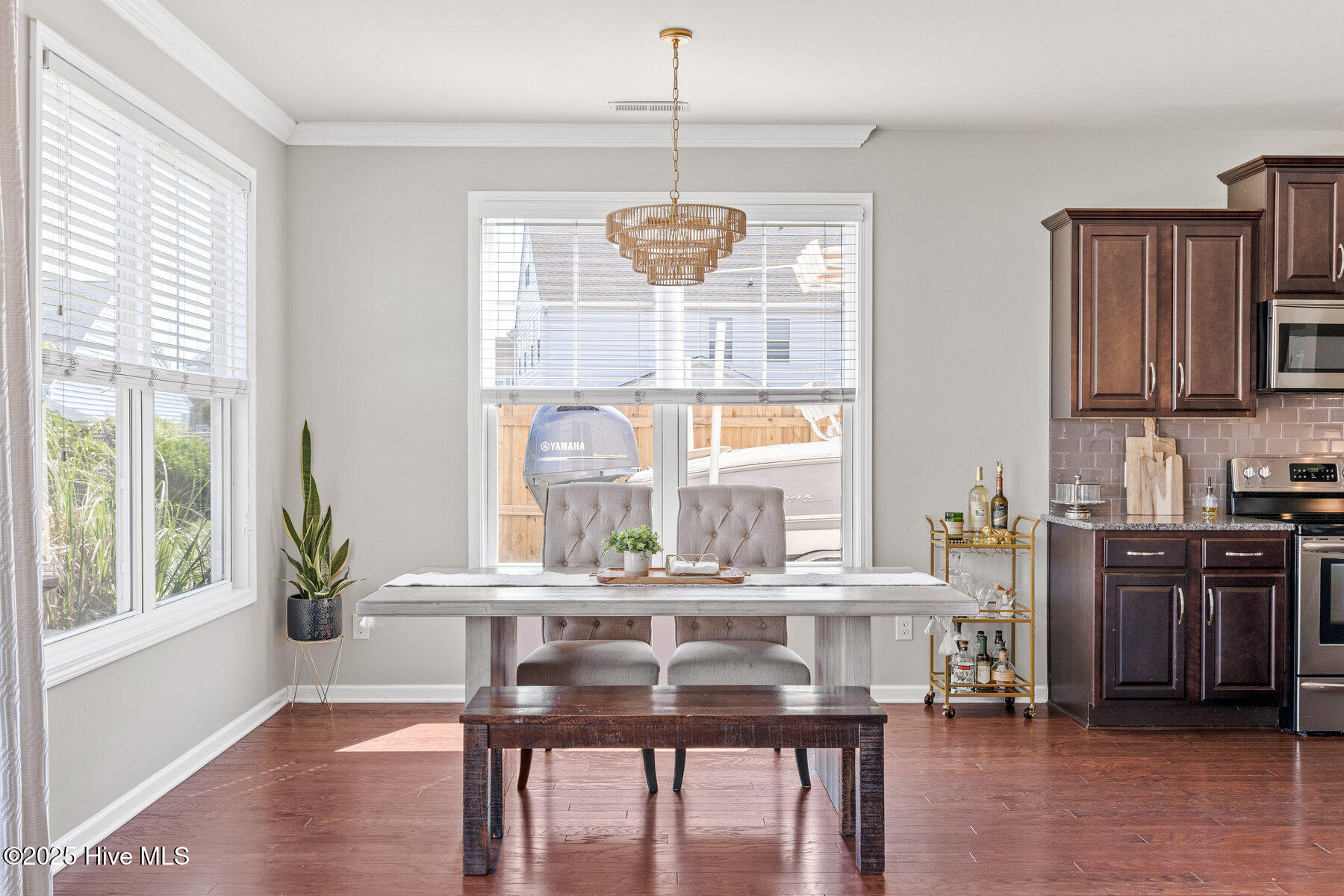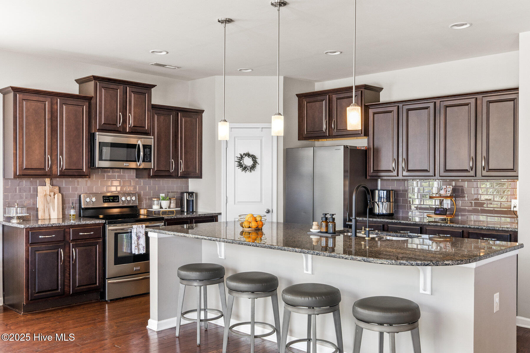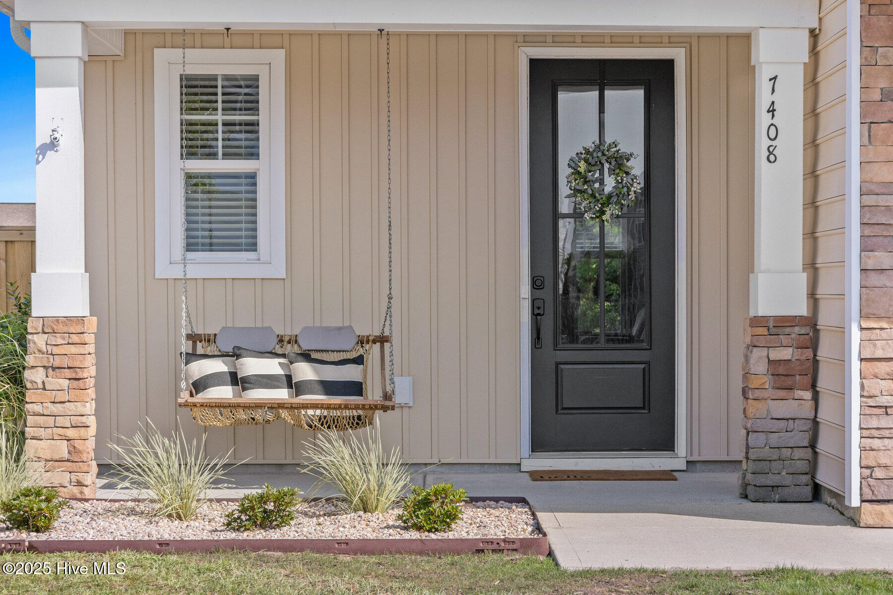 Located in the heart of Ogden, just minutes from Wrightsville Beach, I-40, UNCW, and all the shopping and dining you need, this meticulously maintained two-story home in the Reserve at West Bay is sure to impress. With just over 2,400 square feet, this home offers 4 bedrooms, 2.5 bathrooms, and an ideal floor plan with the main living areas located on the first floor, and all bedrooms privately situated upstairs. A welcoming front porch, complete with a classic porch swing, sets the tone. Inside, natural light fills the main living area thanks to an abundance of windows, highlighting the hardwood floors and open-concept layout. The living room centers around a gas-log fireplace with a sleek black surround, creating a modern feel. The kitchen features an oversized island with seating, granite countertops, espresso cabinetry, stainless steel appliances, and a timeless tile backsplash. It opens seamlessly to the dining space and living room, making it easy to gather and entertain. Upstairs, the spacious primary suite includes tray ceilings, a walk-in closet, and a bonus space ideal for a home office, reading nook, or nursery. The en-suite bathroom features double vanities, a walk-in shower, and a separate soaking tub. Three additional bedrooms, a full bathroom, and an upstairs laundry room finish off the second floor. Step outside to enjoy a large back patio overlooking the pond. Privacy fencing has been installed along the front and sides of the yard, while the rear remains open to take full advantage of the water view. New roof installed in 2024!!!