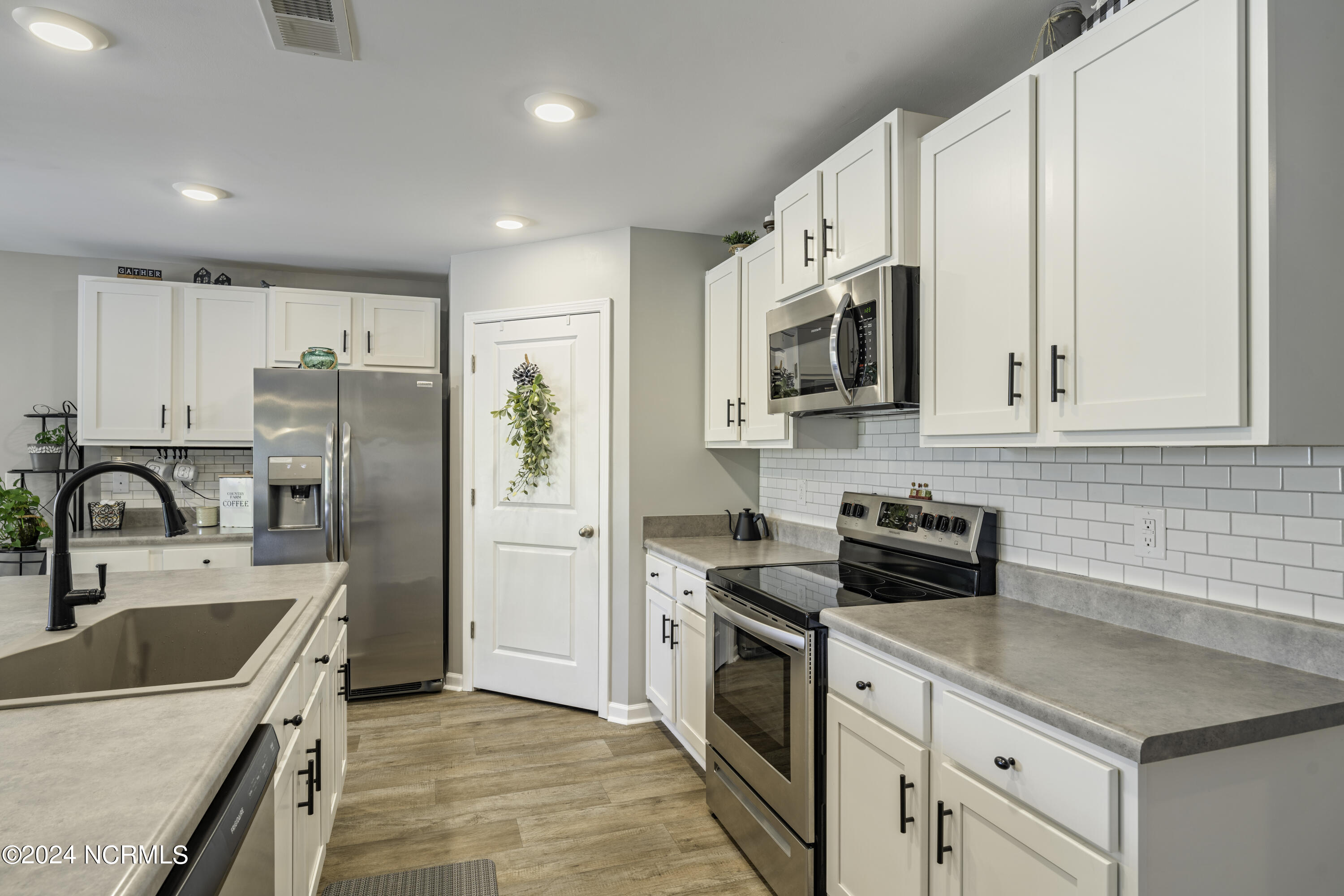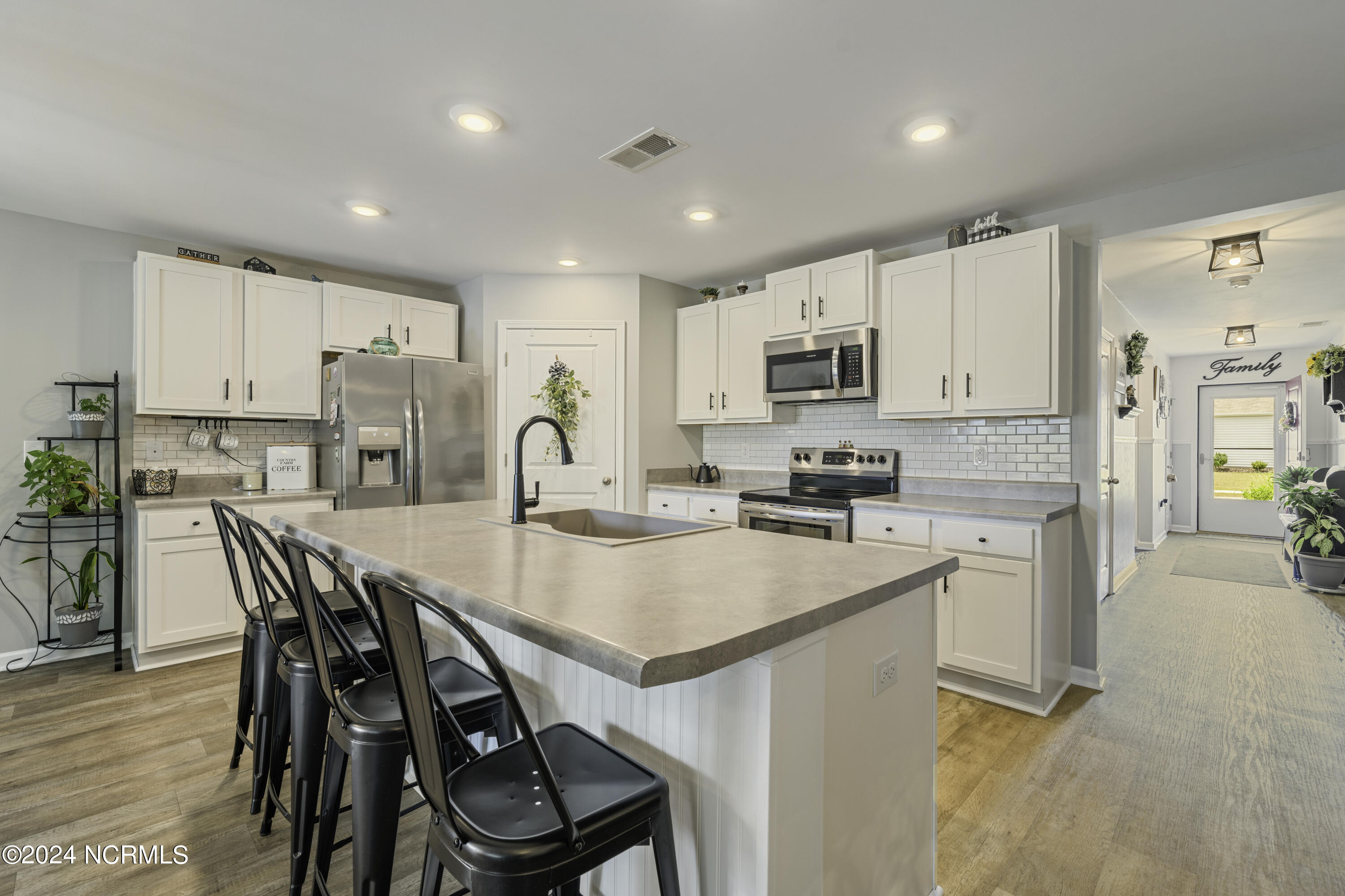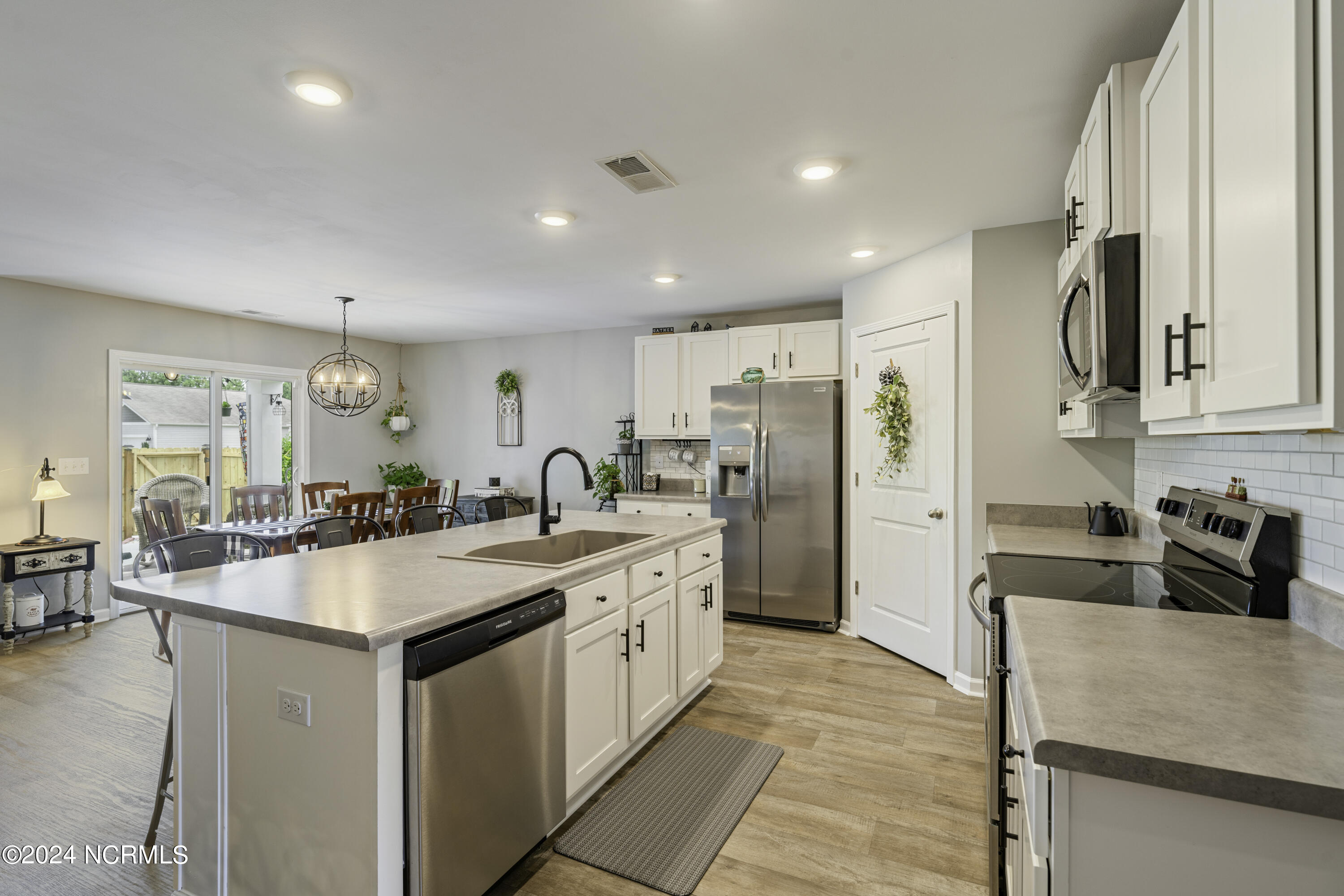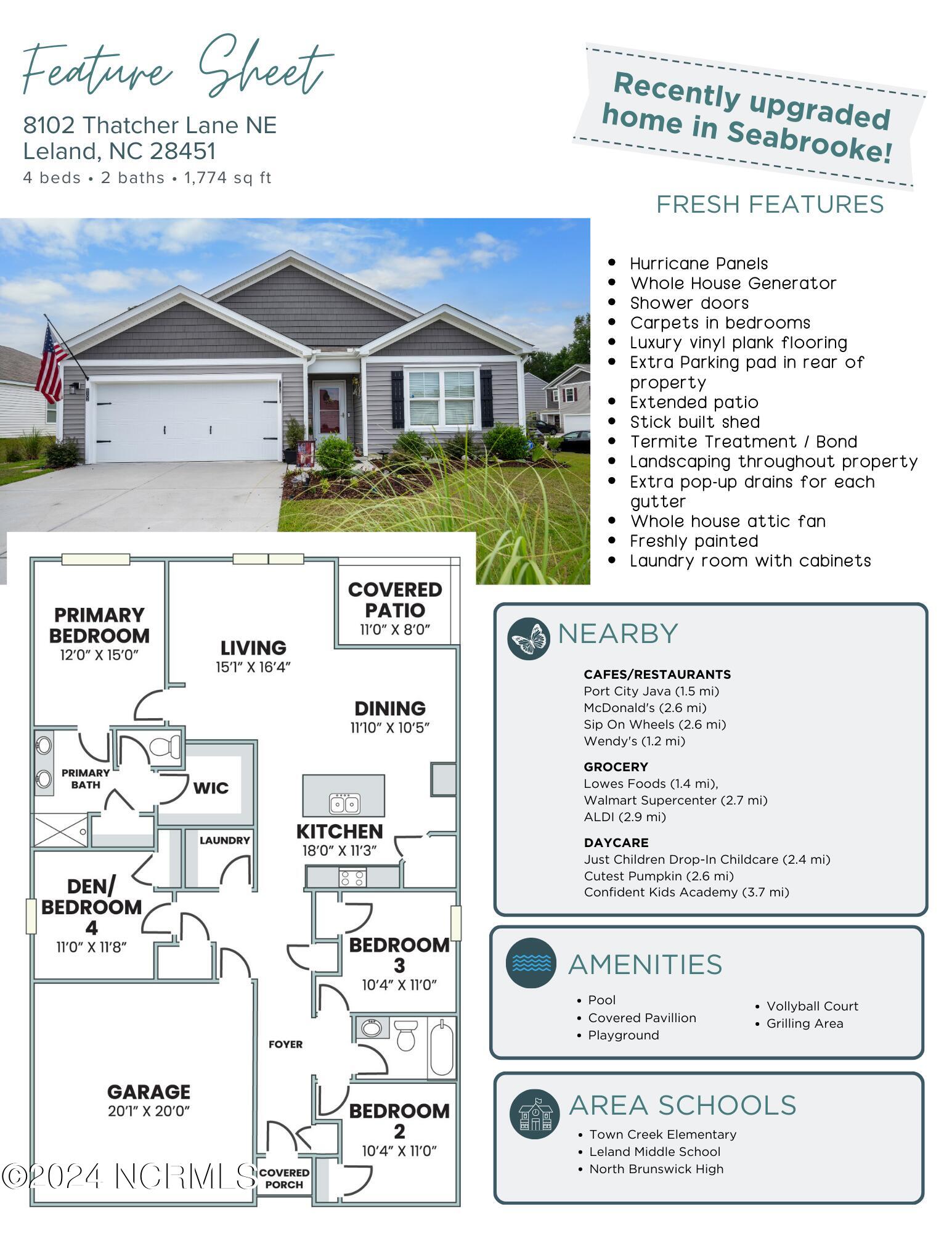 Here's your opportunity to own a recently upgraded home in Seabrooke! The popular CALI 'B' plan features 4 bedrooms and 1774 square feet of living space. Situated on a corner lot, this home boasts fresh paint and new LVP flooring throughout. The kitchen is enhanced with stainless steel appliances, chair rail and bead board accents, large pantry and island. New lights, mirrors, and additional cabinets in both the kitchen and laundry room. Recent improvements include new glass shower doors, an extended patio, fenced backyard, lush landscaping, a stick-built shed with cement pylons, brick pathways, and extra pop-up drains.